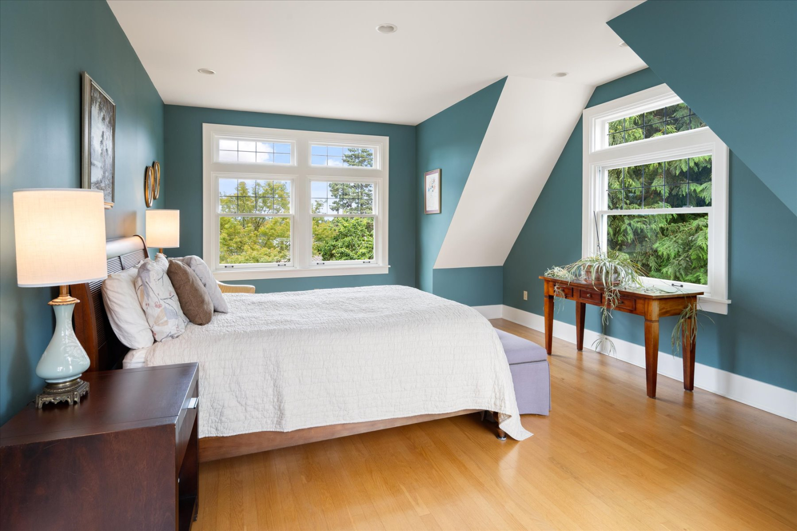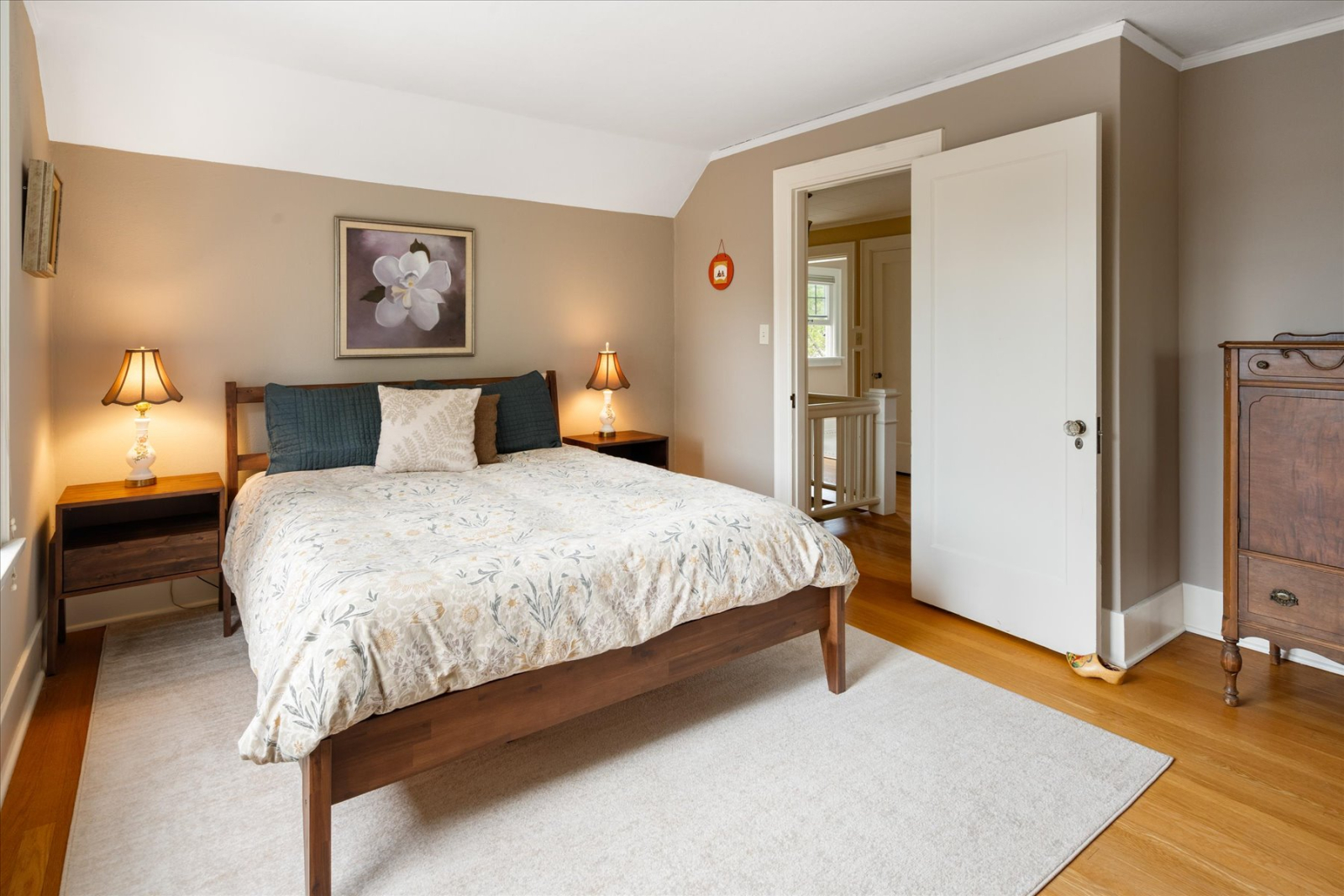 El nivel superior tiene 3 dormitorios y 2 baños. El dormitorio principal cuenta con vistas al amanecer sobre las montañas Cascade, un vestidor y un baño privado con ducha, bañera y calefacción por suelo radiante. Los dos dormitorios adicionales son de tamaño generoso con camas queen.