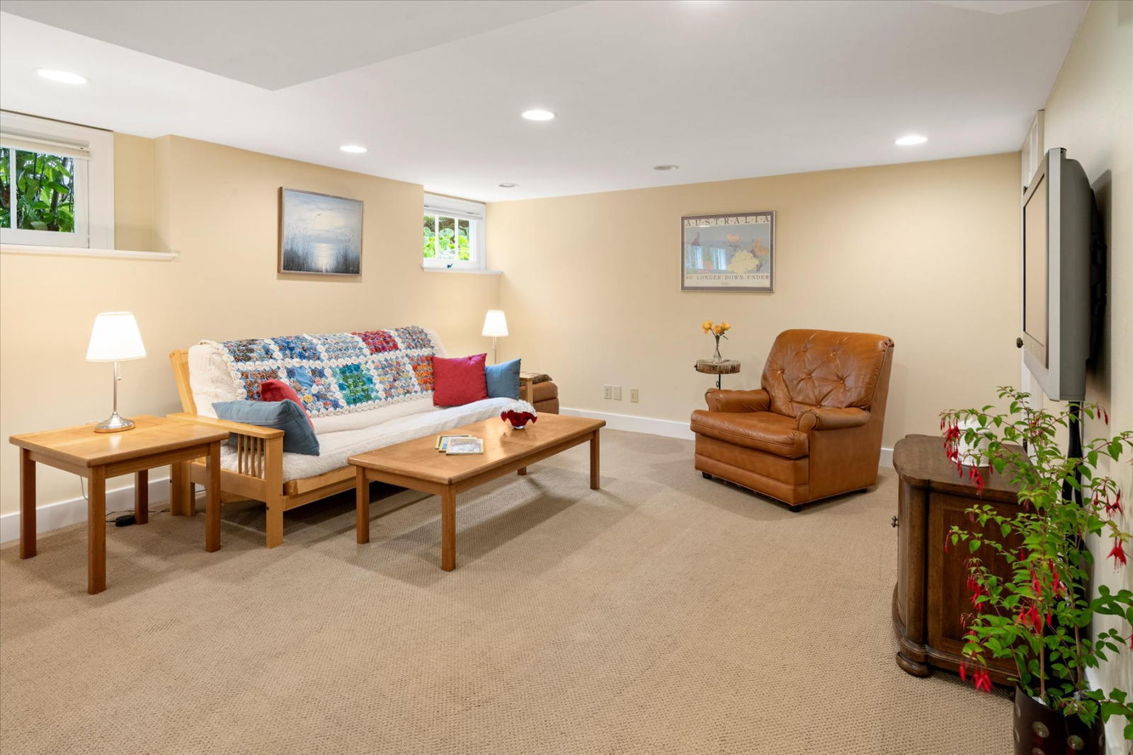El nivel inferior tiene un espacio flexible para dormir / sala multimedia, una pequeña área de ejercicios, baño completo y lavandería.