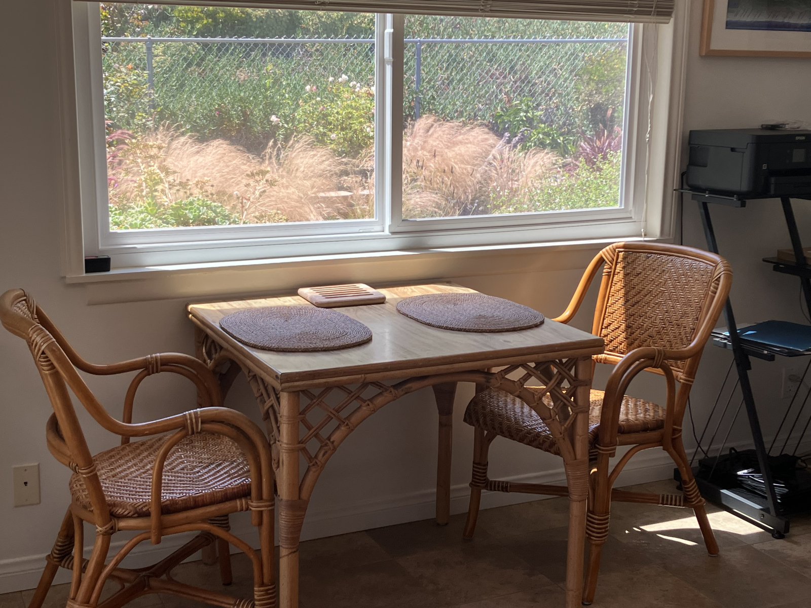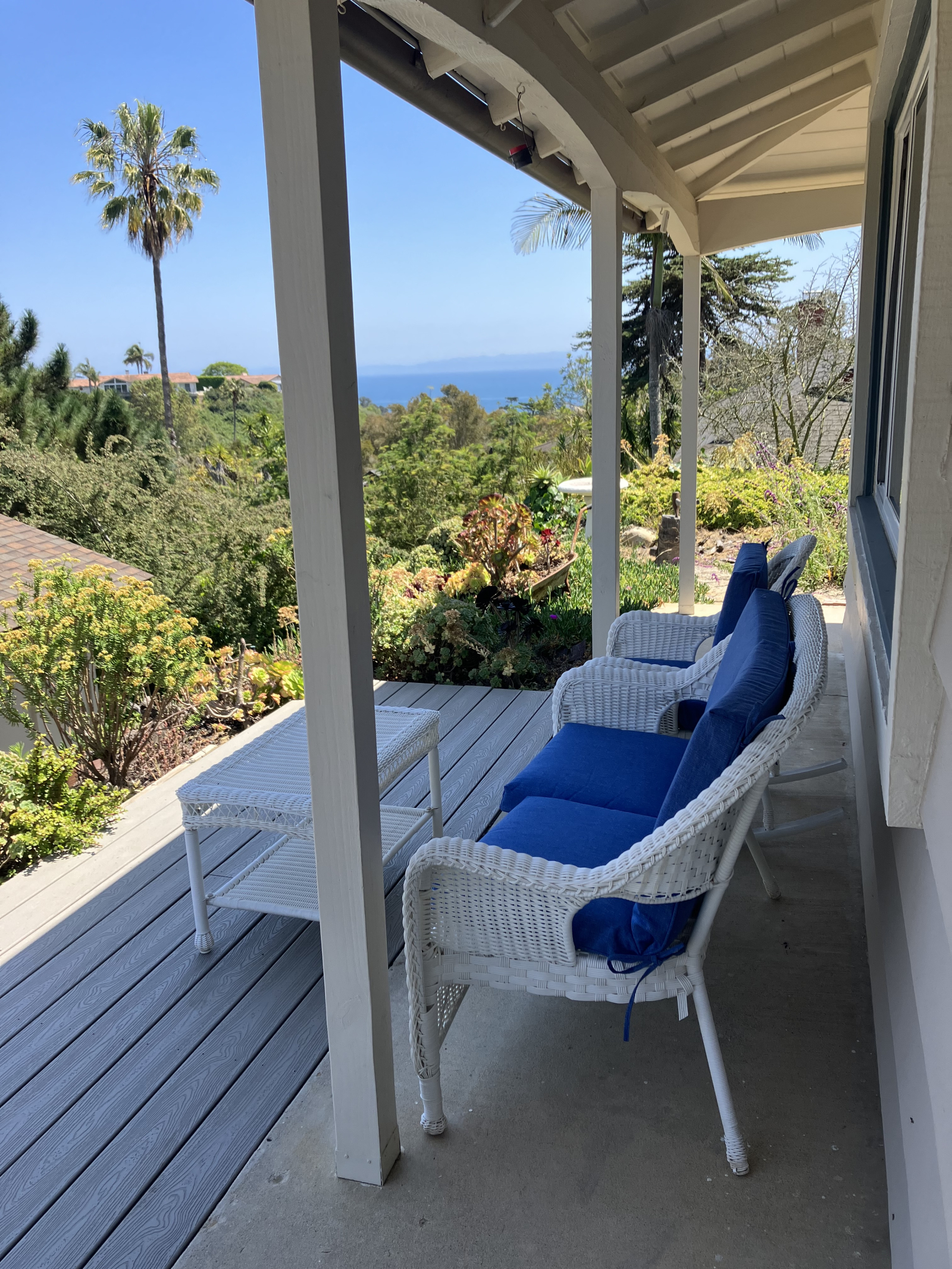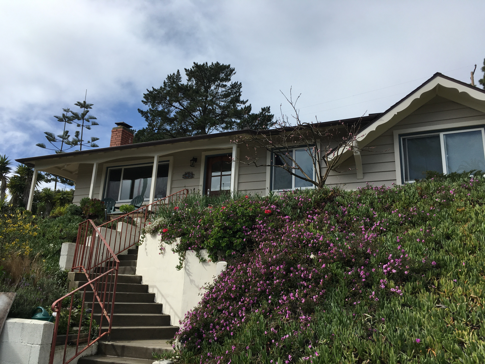 La casa se encuentra en una colina con vistas al océano y está subiendo 22 escalones hasta la puerta principal, así como un patio contiguo. La casa tiene un plano de planta abierto con la sala de estar a la izquierda con televisión, equipo de música y chimenea. En el comedor caben seis personas alrededor de la mesa. La cocina gourmet está totalmente equipada y se abre a un rincón de desayuno, mesa y asientos para dos. Hay un escritorio y una zona de lavandería. El comedor y la cocina se abren a un patio con mesa y cuatro sillas para cenar y relajarse al aire libre.