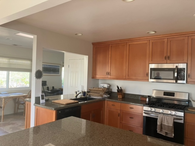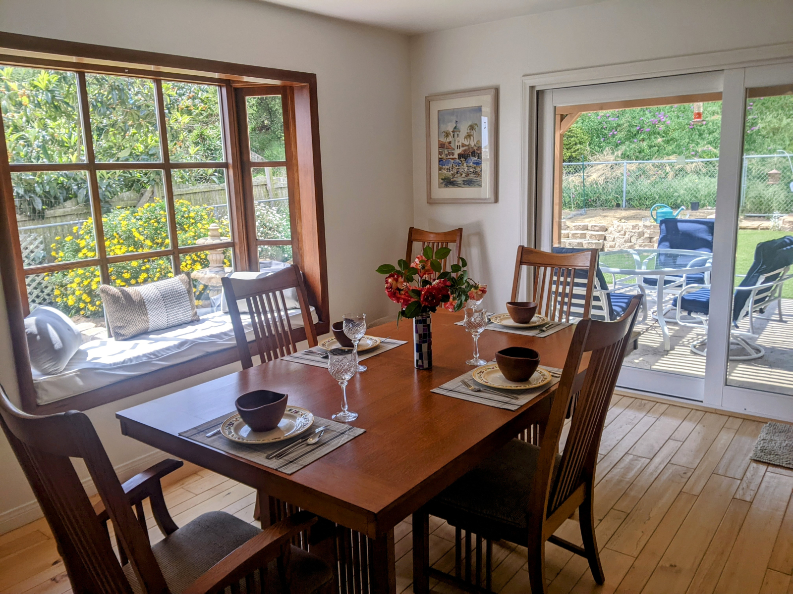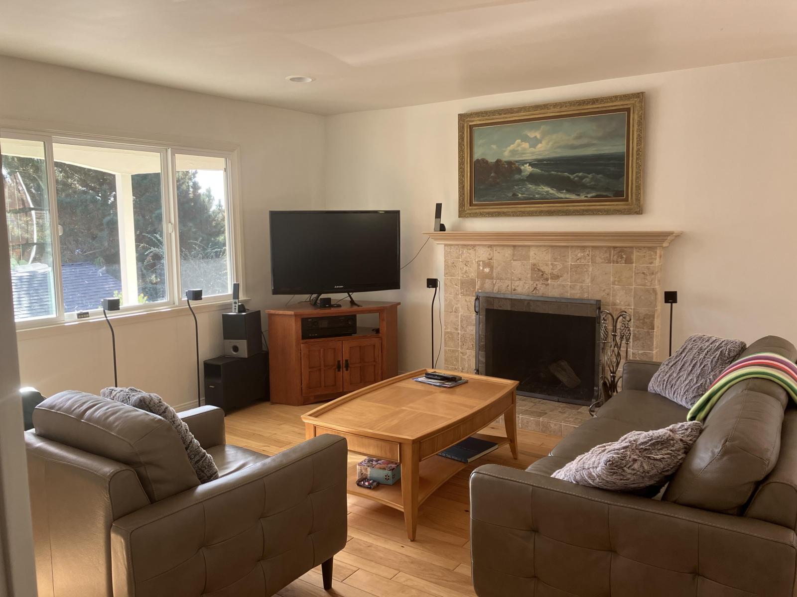 La casa se encuentra en una colina con vistas al océano y está subiendo 22 escalones hasta la puerta principal, así como un patio contiguo. La casa tiene un plano de planta abierto con la sala de estar a la izquierda con televisión, equipo de música y chimenea. En el comedor caben seis personas alrededor de la mesa. La cocina gourmet está totalmente equipada y se abre a un rincón de desayuno, mesa y asientos para dos. Hay un escritorio y una zona de lavandería. El comedor y la cocina se abren a un patio con mesa y cuatro sillas para cenar y relajarse al aire libre.
