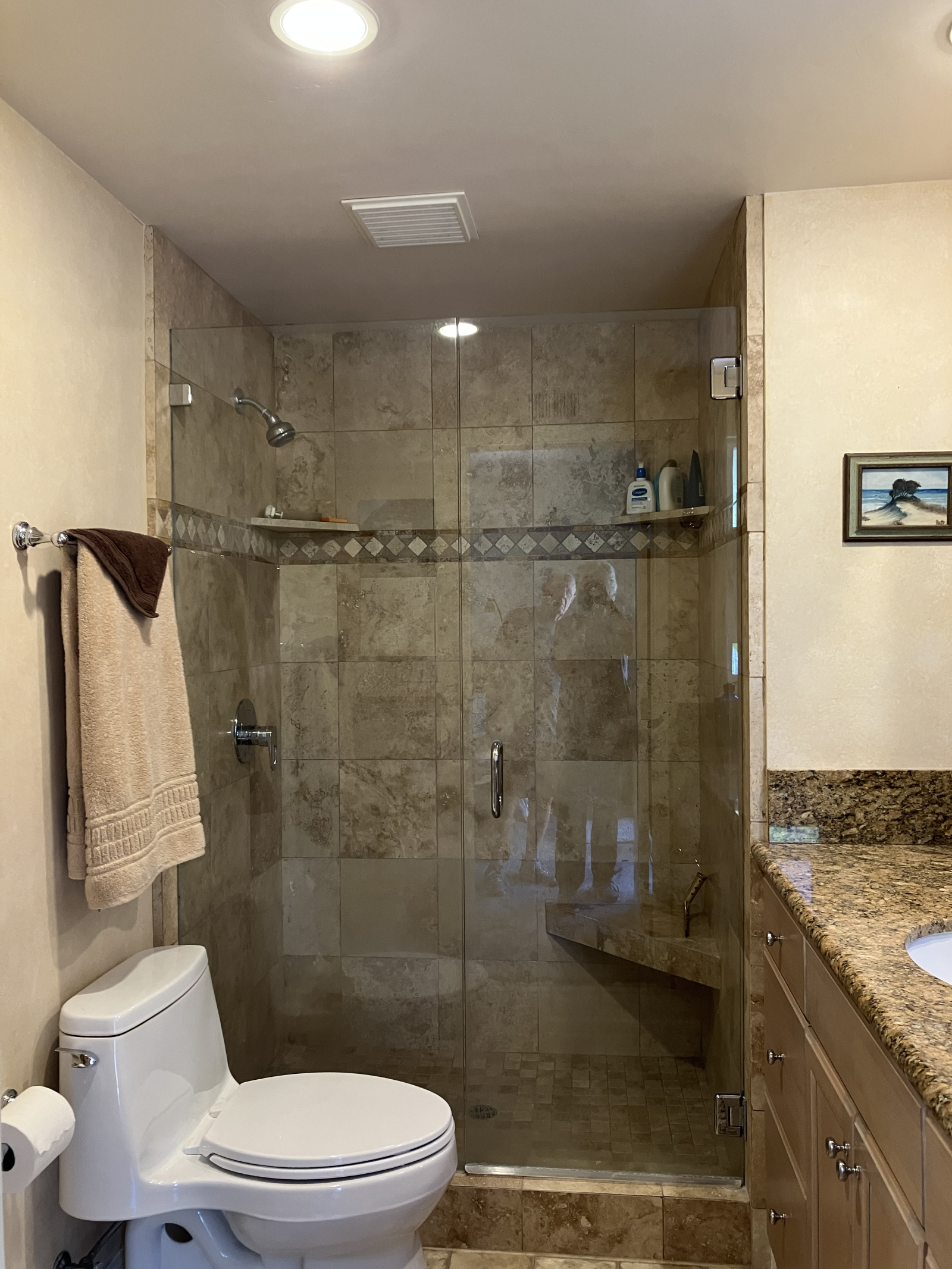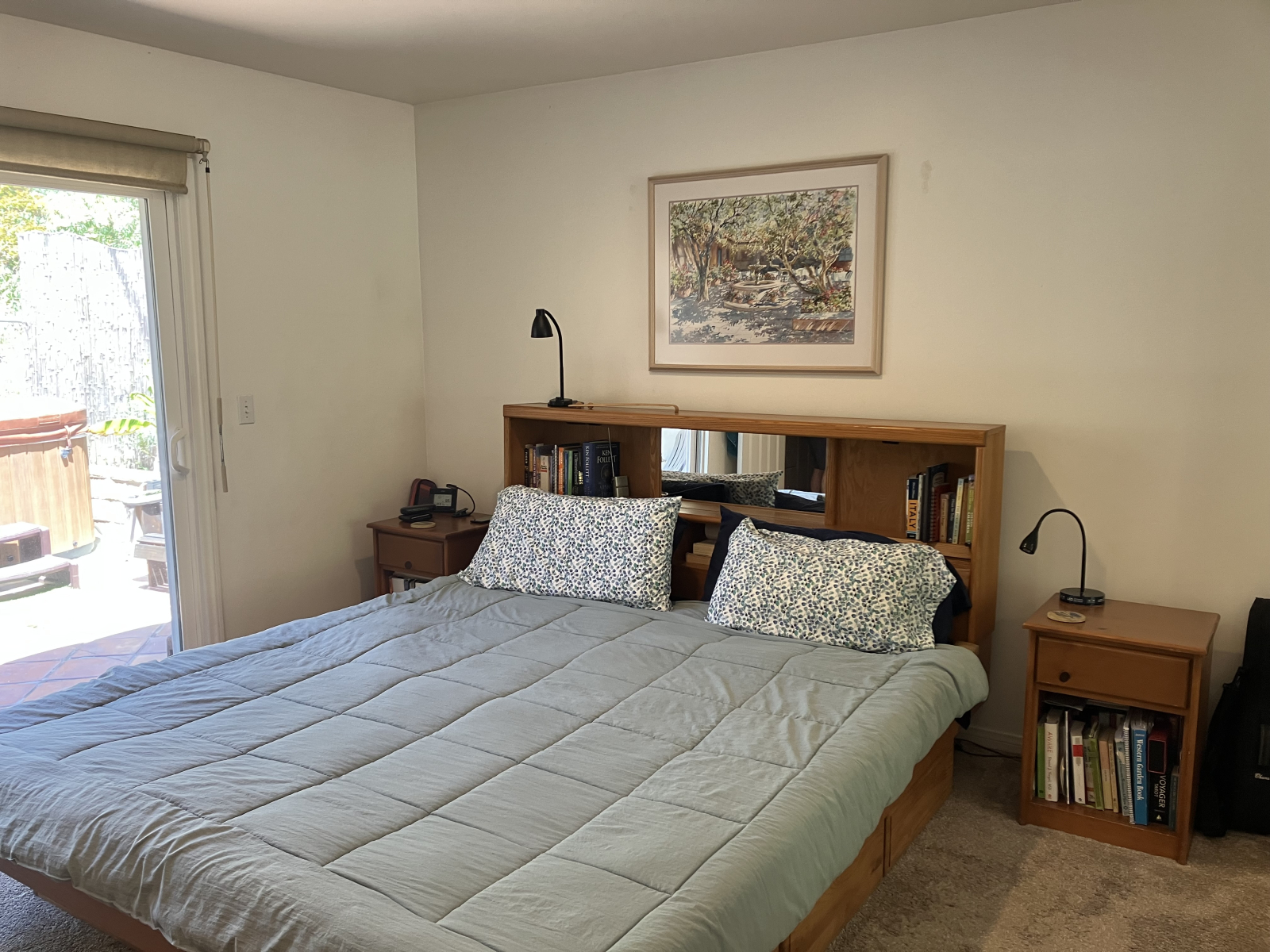 Al final del pasillo hay dos dormitorios a la derecha, con camas dobles en cada uno. Un baño completo con combinación de bañera y ducha está a la izquierda. Al final del pasillo se encuentra la suite principal con una cama de agua king size y baño con ducha a ras de suelo. El principal tiene puertas correderas que conectan a un patio privado.