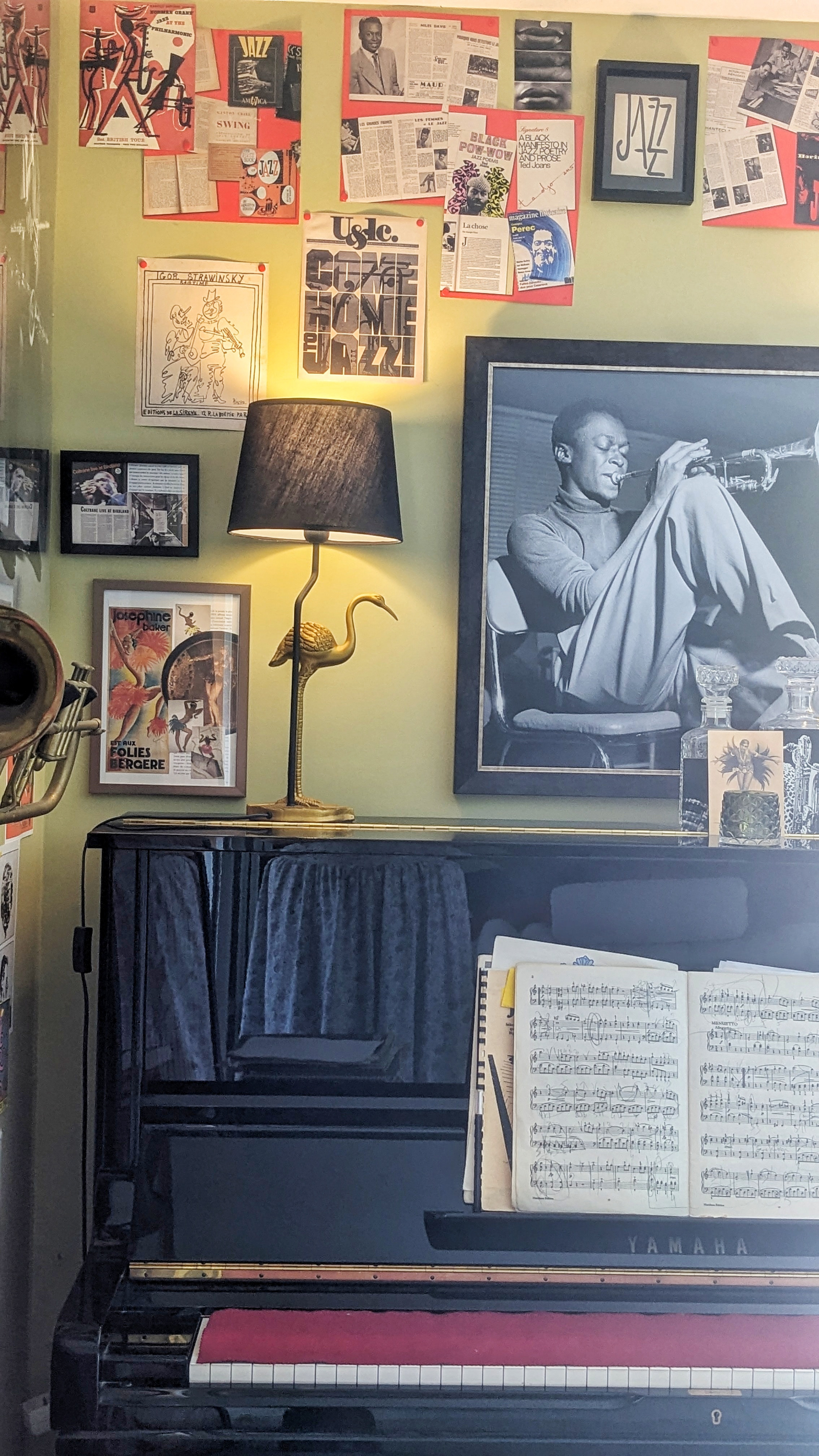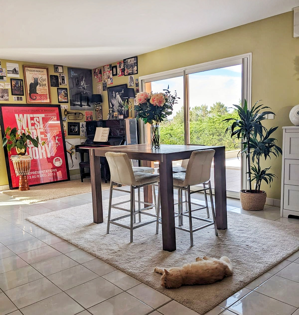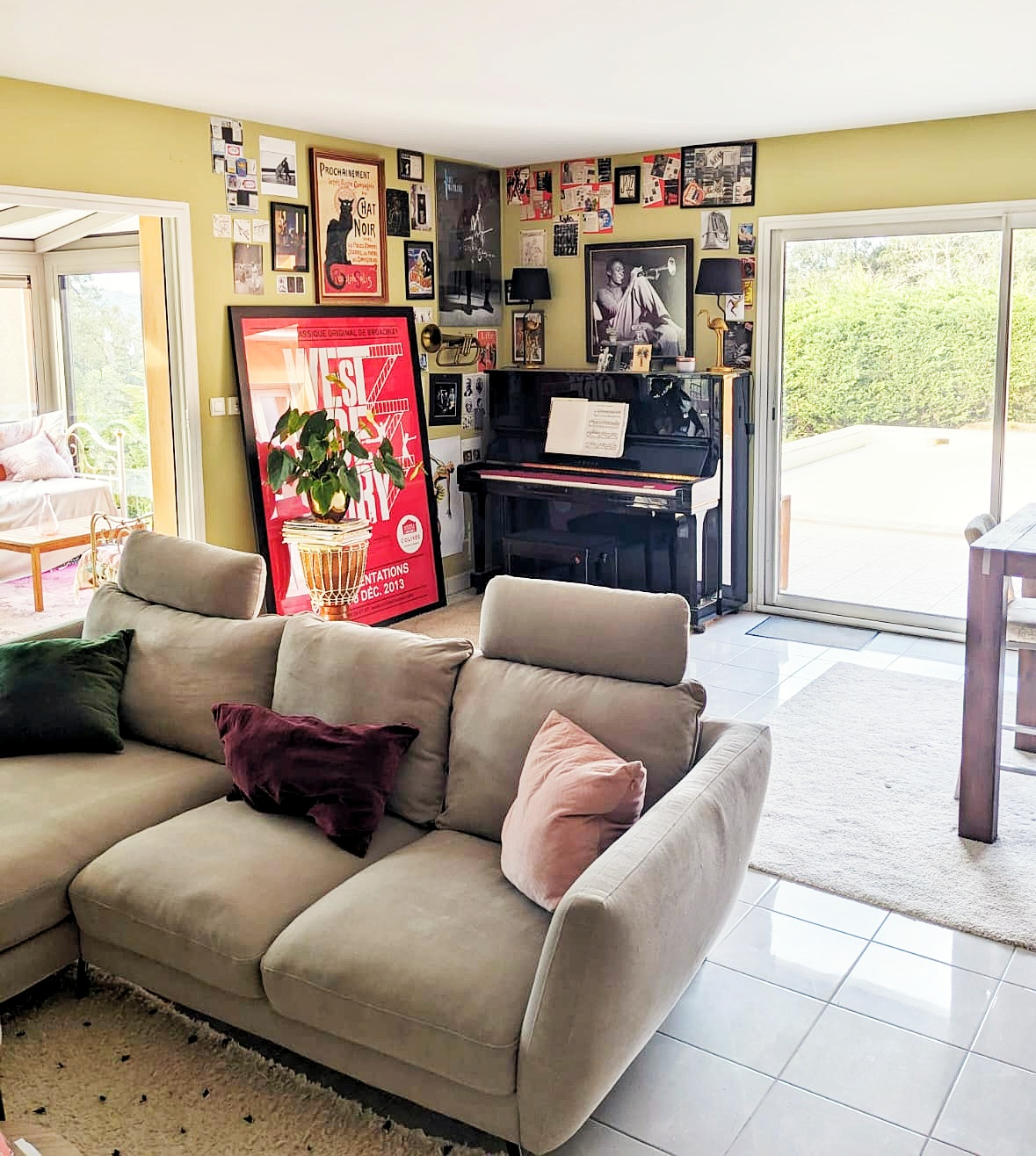 Hay un rincón musical disponible con piano, djembe y varias percusiones. ¡Altavoz Devialet Phantom para escuchar tus mejores temas!