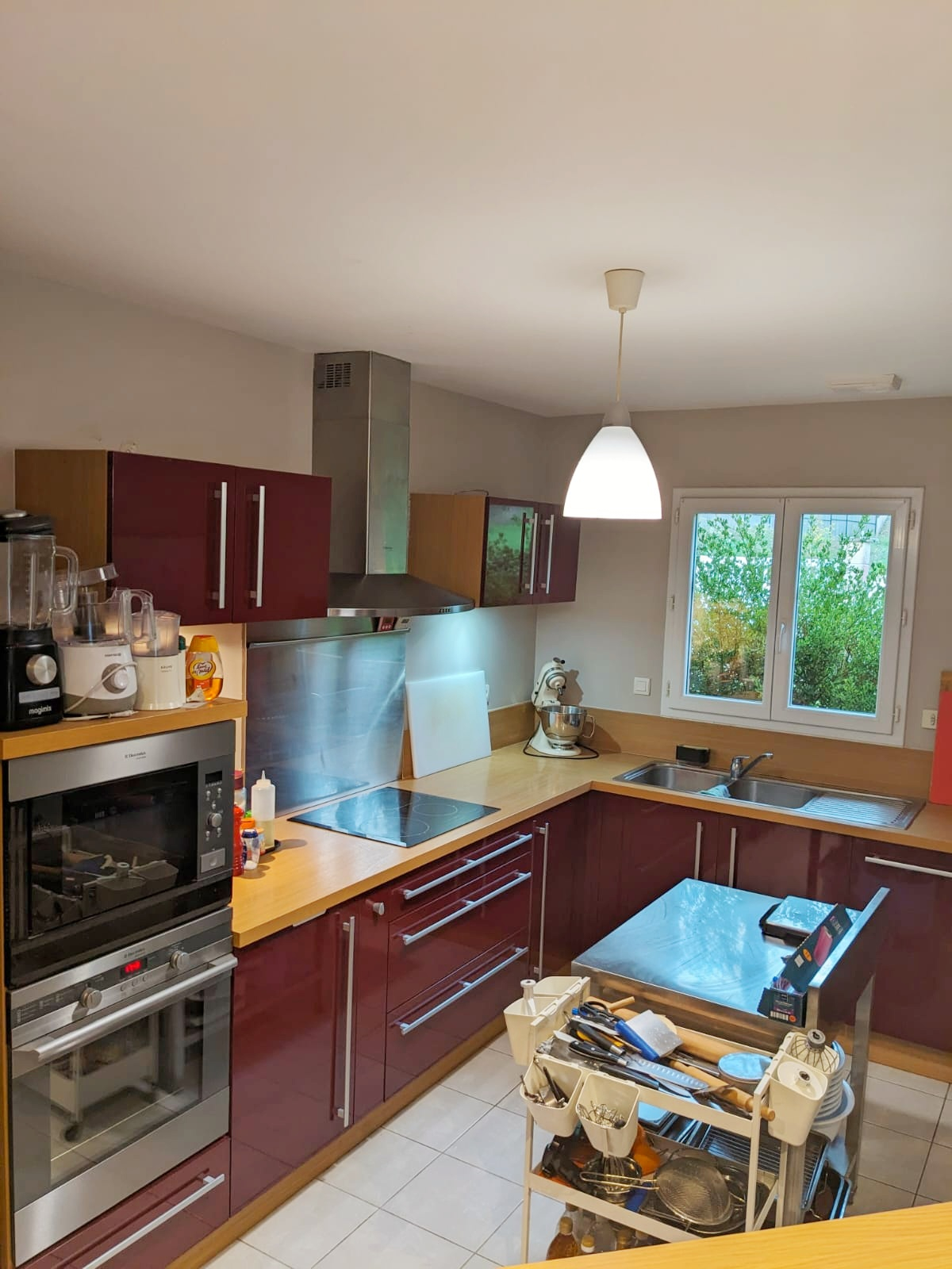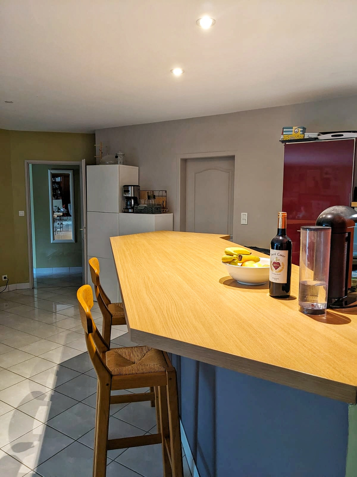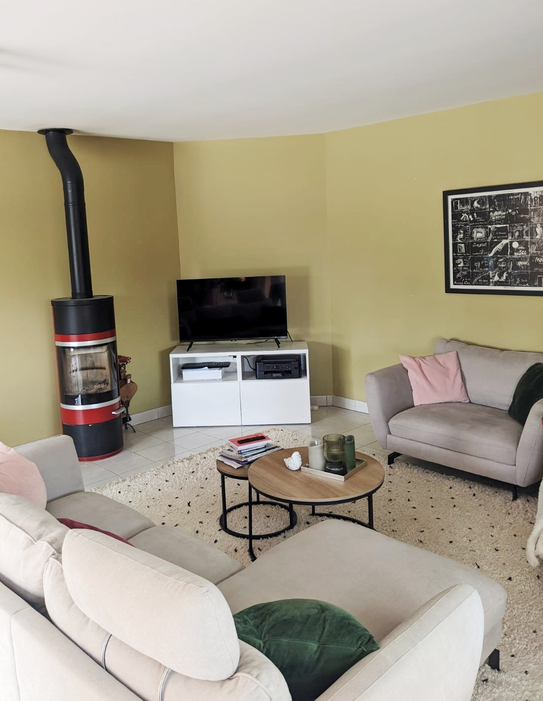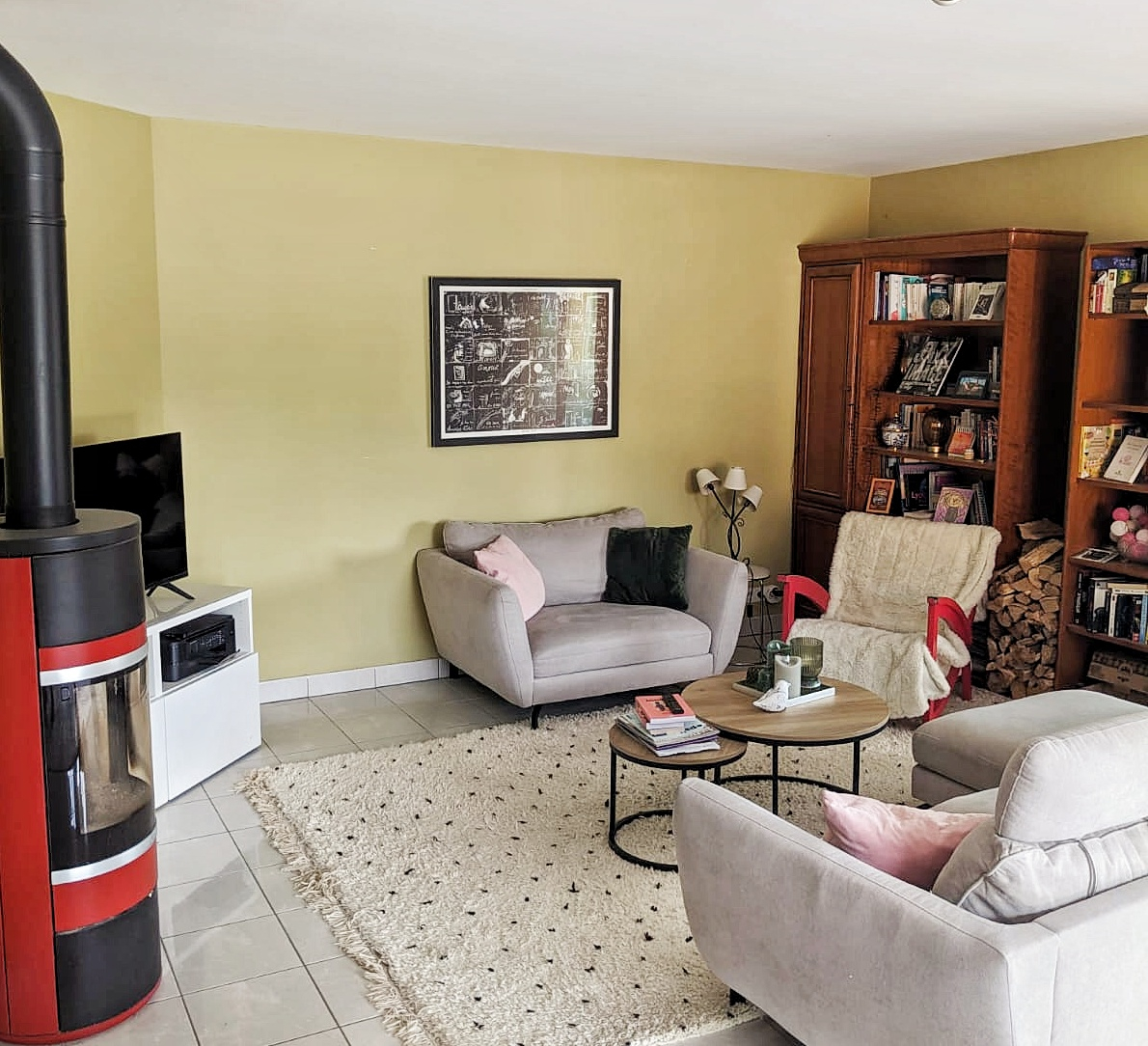 Casa acogedora de 120 m2 con un gran salón equipado con estufa de leña, cocina equipada, 3 dormitorios y un baño.
