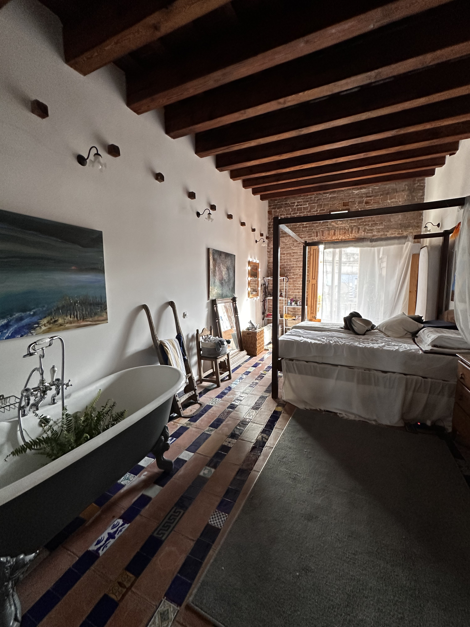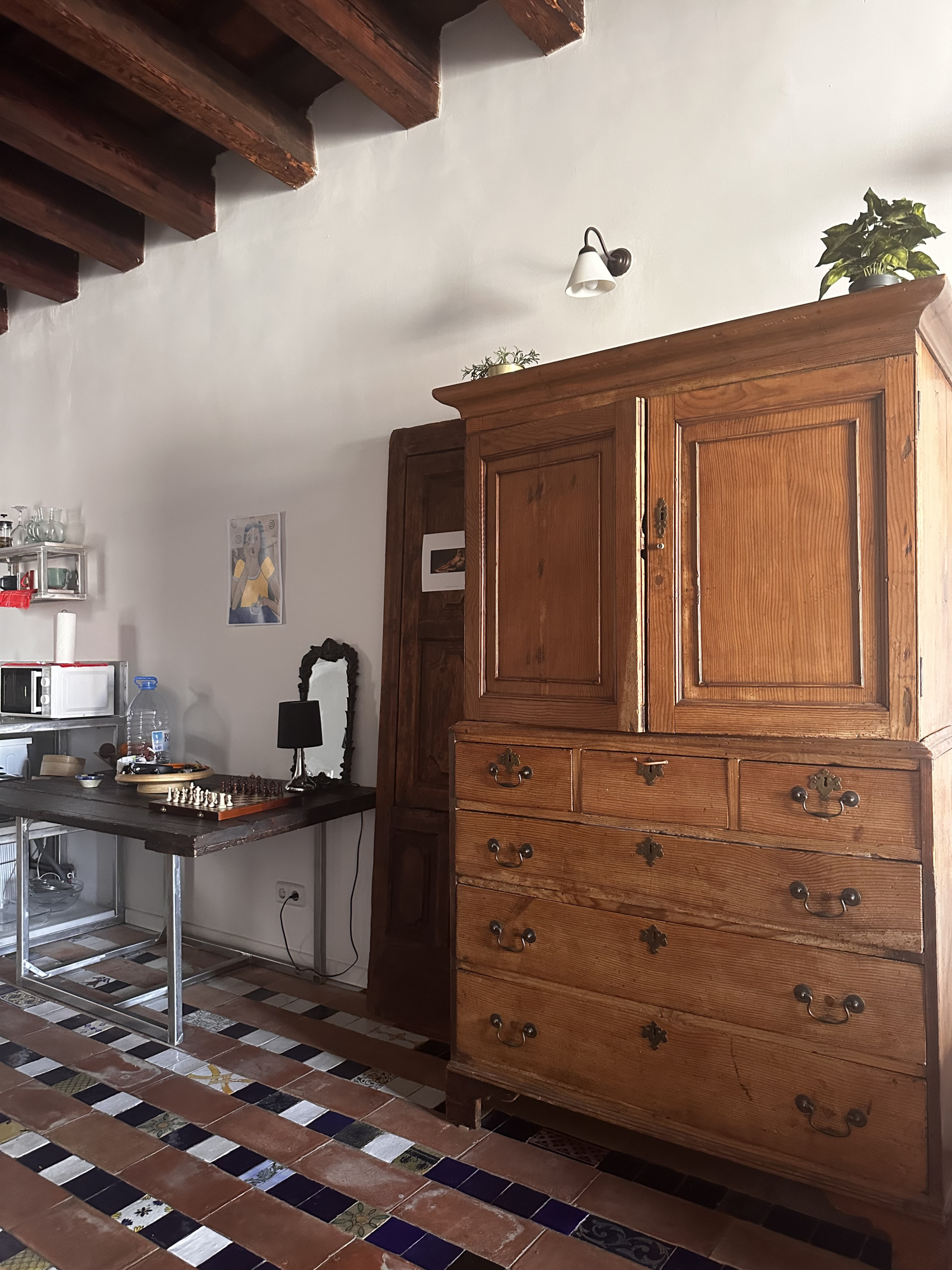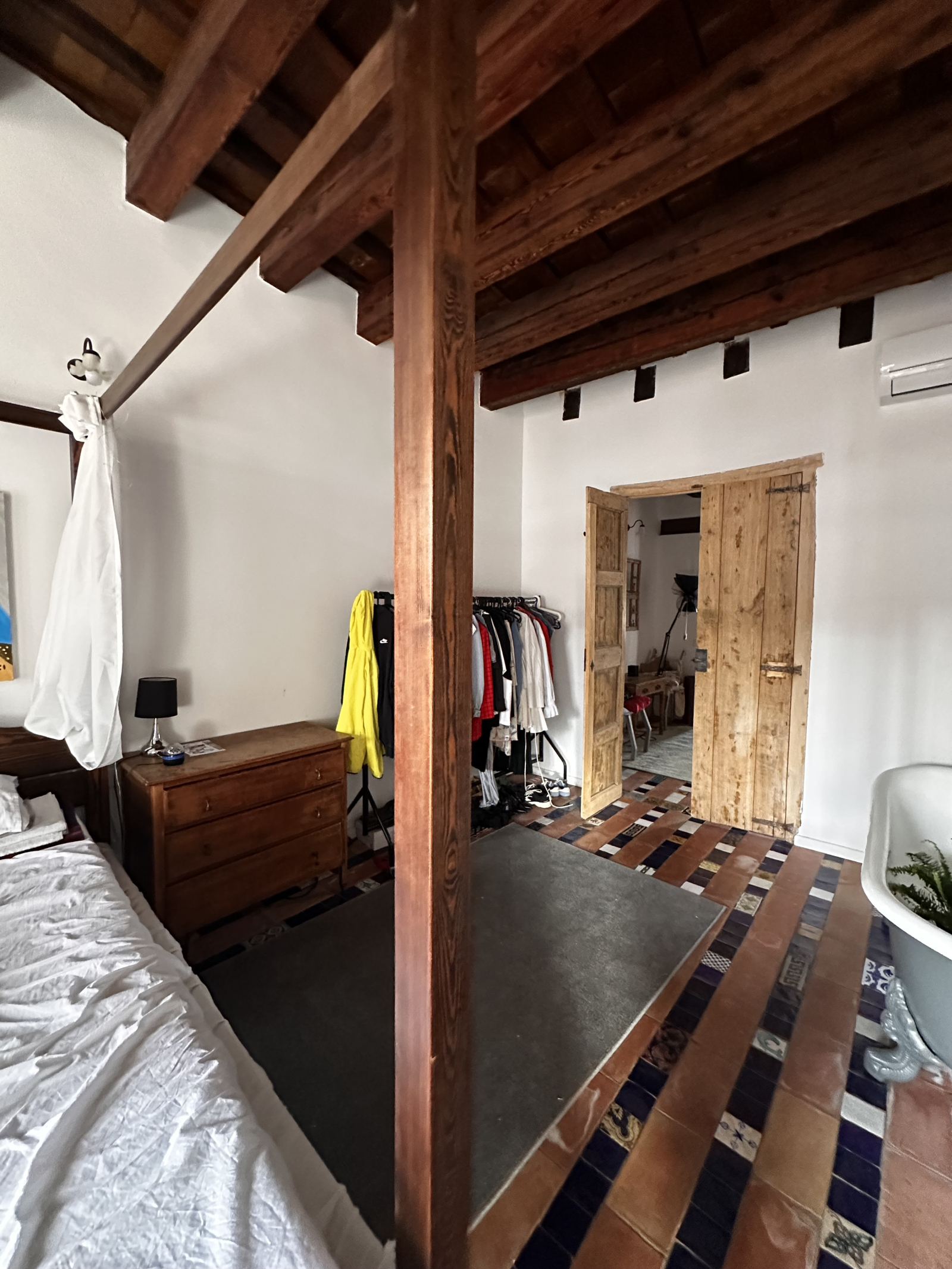 El apartamento incluye una amplia sala de estar y comedor con techos altos y luz natural, un acogedor dormitorio, un baño de estilo vintage, un dormitorio con bañera independiente y una cocina abierta totalmente equipada. El suelo está cubierto con baldosas artesanales hechas a mano, y el mobiliario es una mezcla de piezas antiguas y encanto bohemio. Es un lugar cálido y conmovedor lleno de libros, arte y texturas.