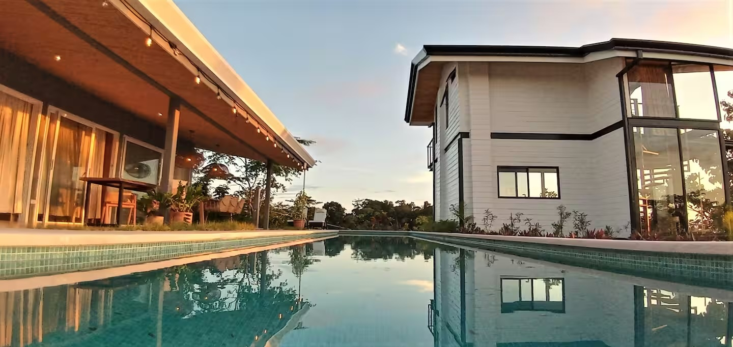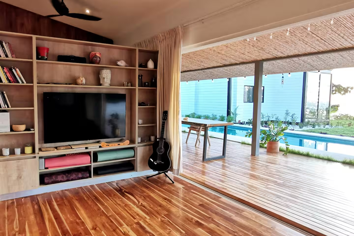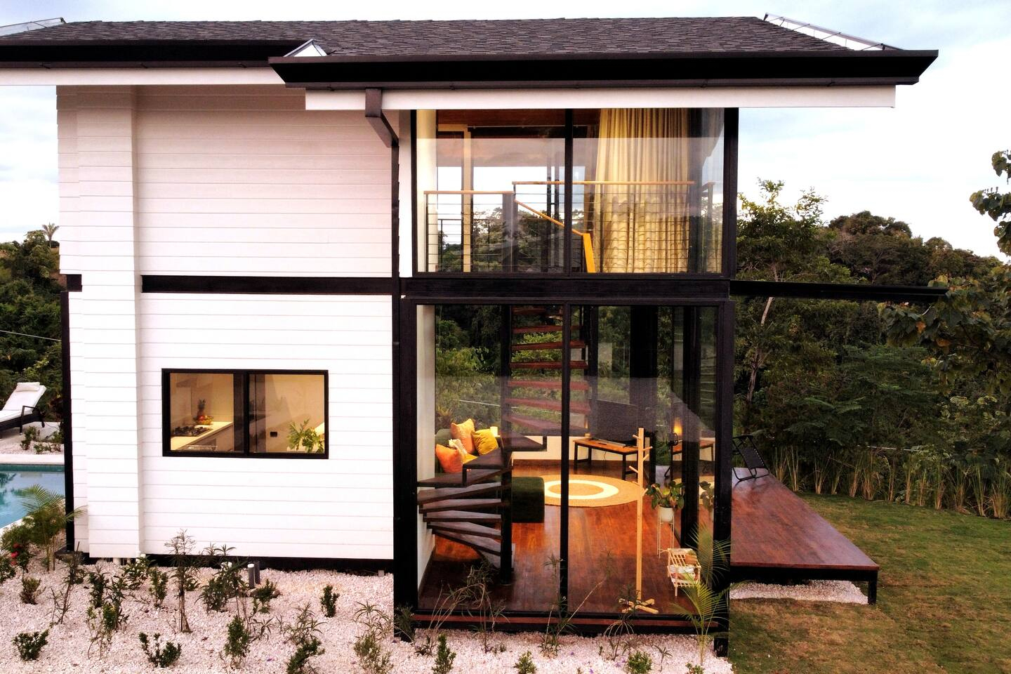 Casa Joy a la izquierda, piscina, y villa Casa Blanca a la derecha, jardín.