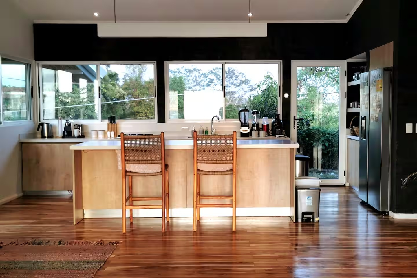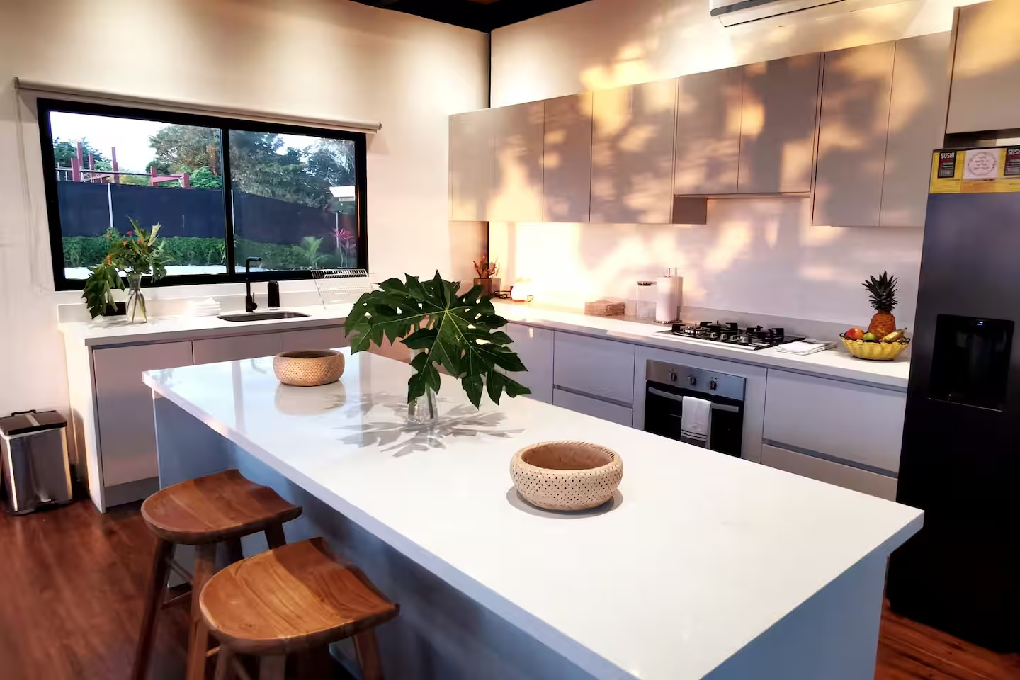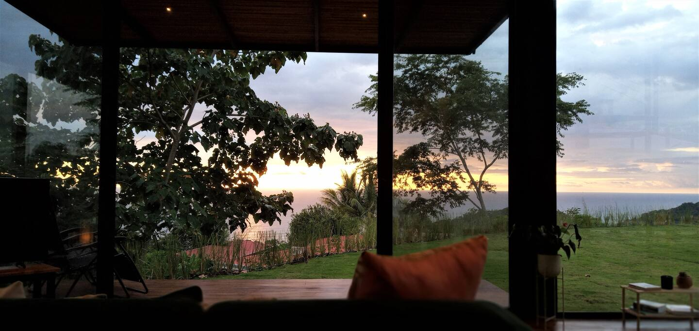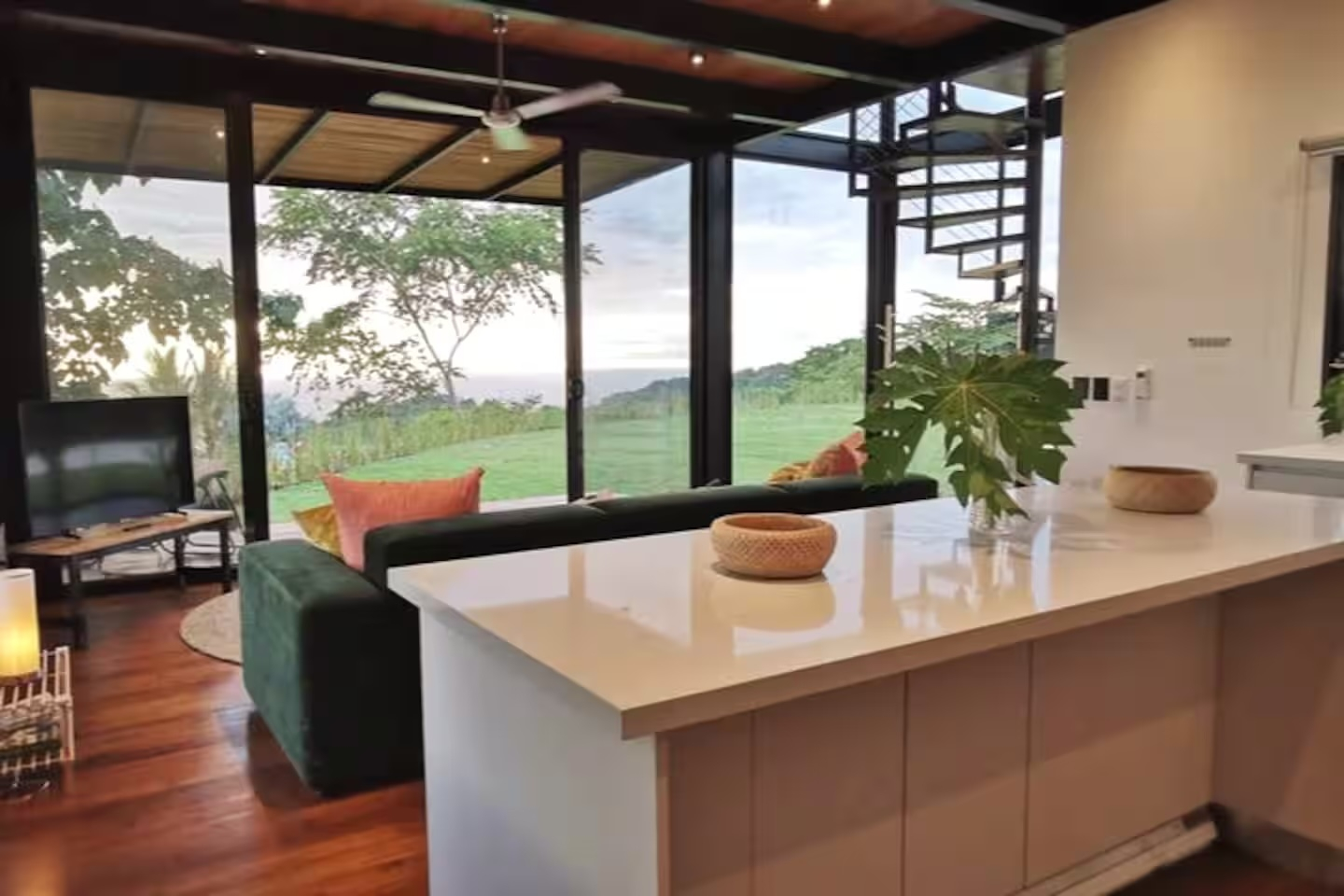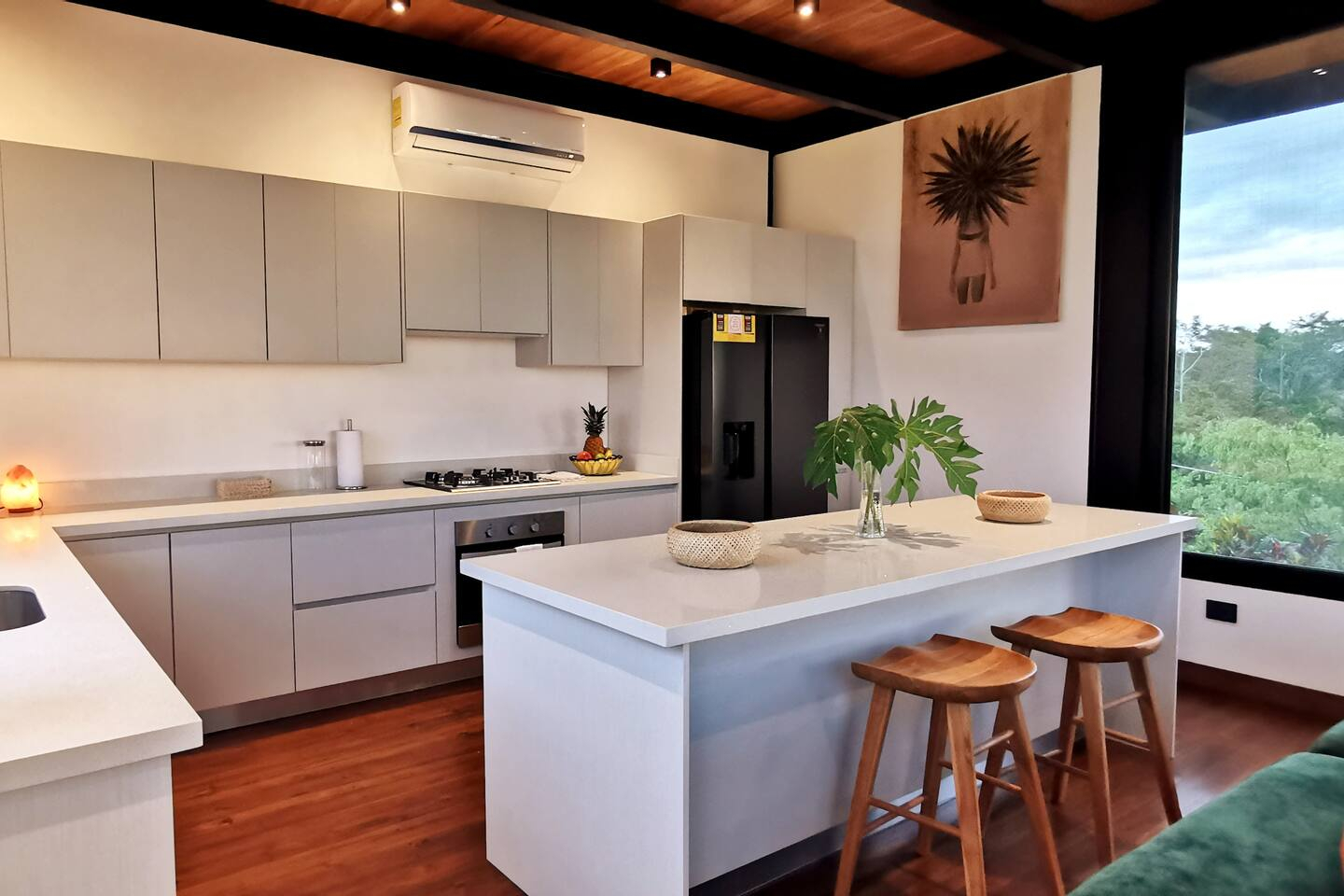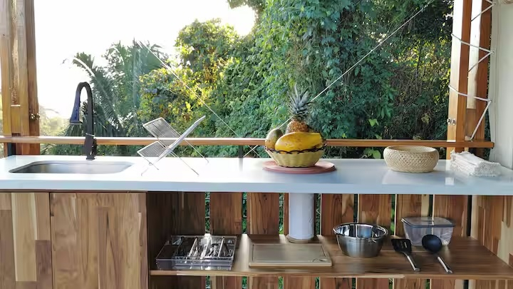 Kitchenette, la vista es al océano y ahora hay un área de bienestar con terraza de yoga en frente.