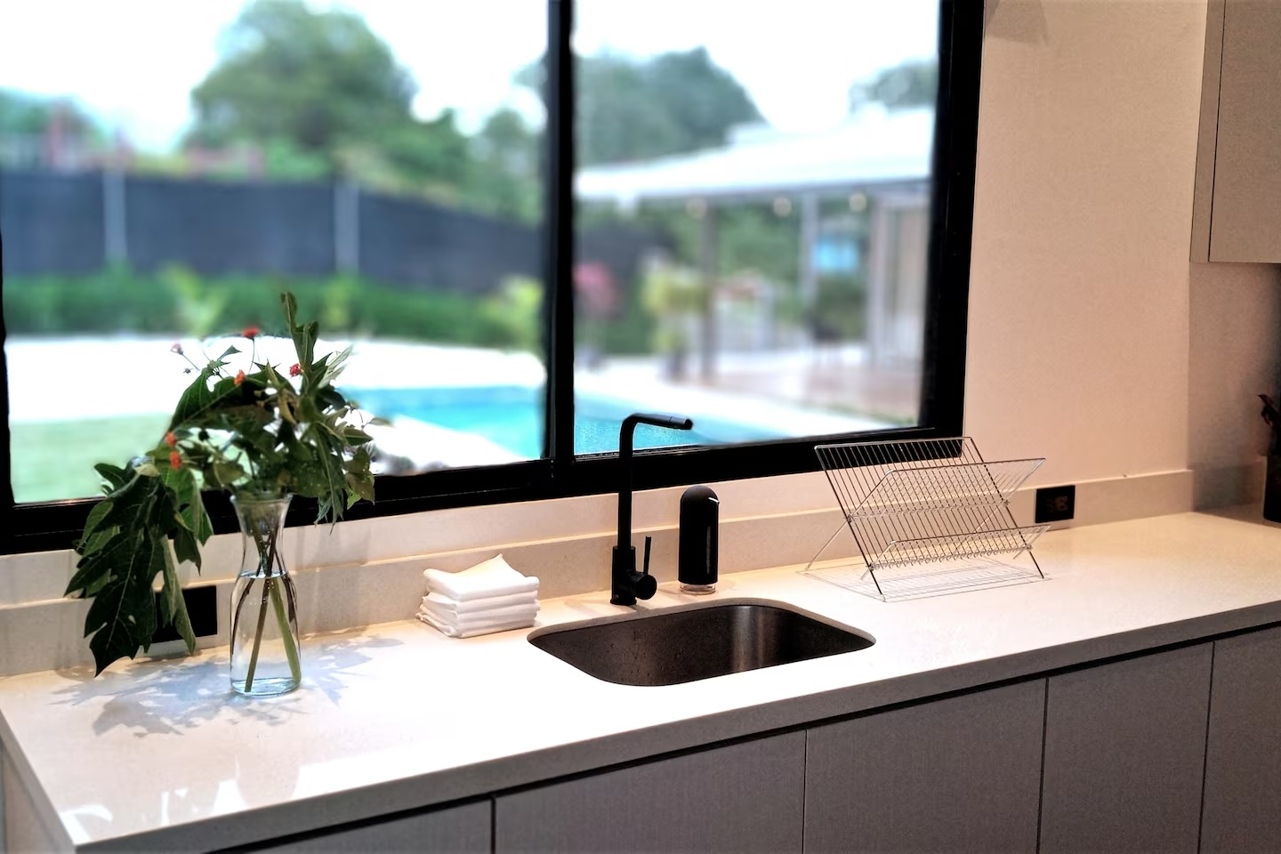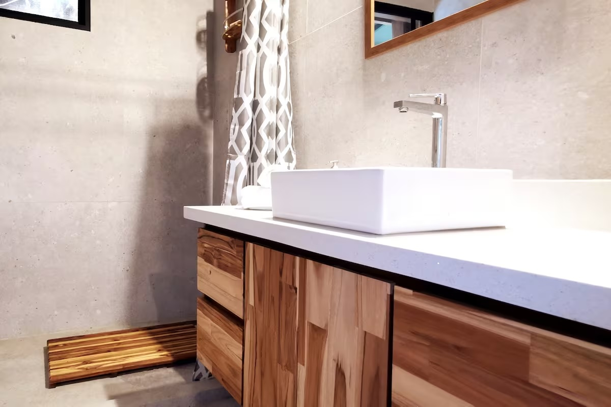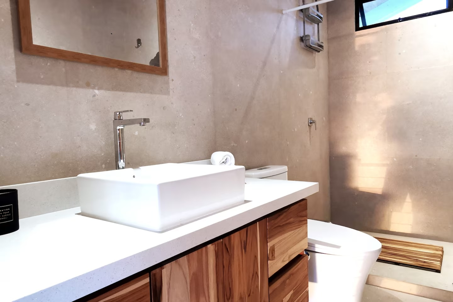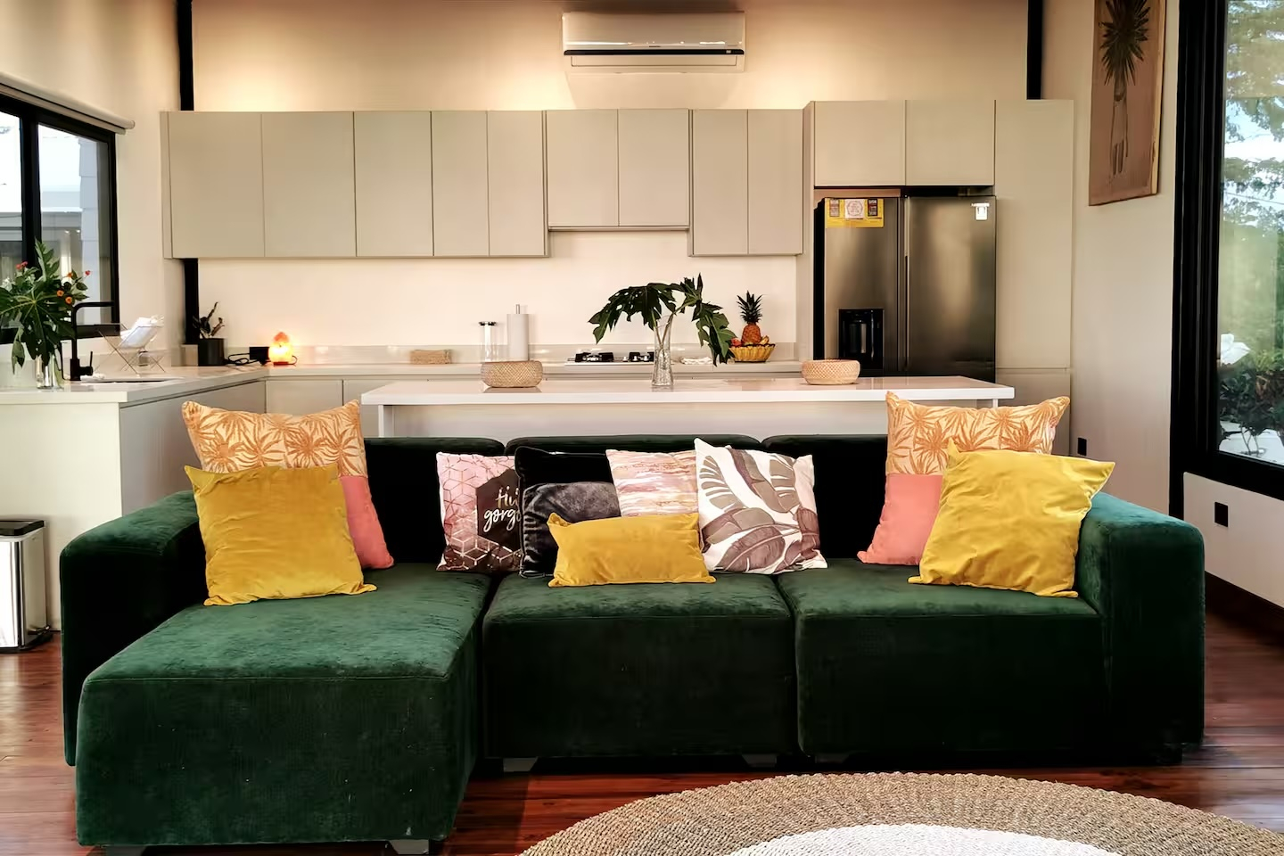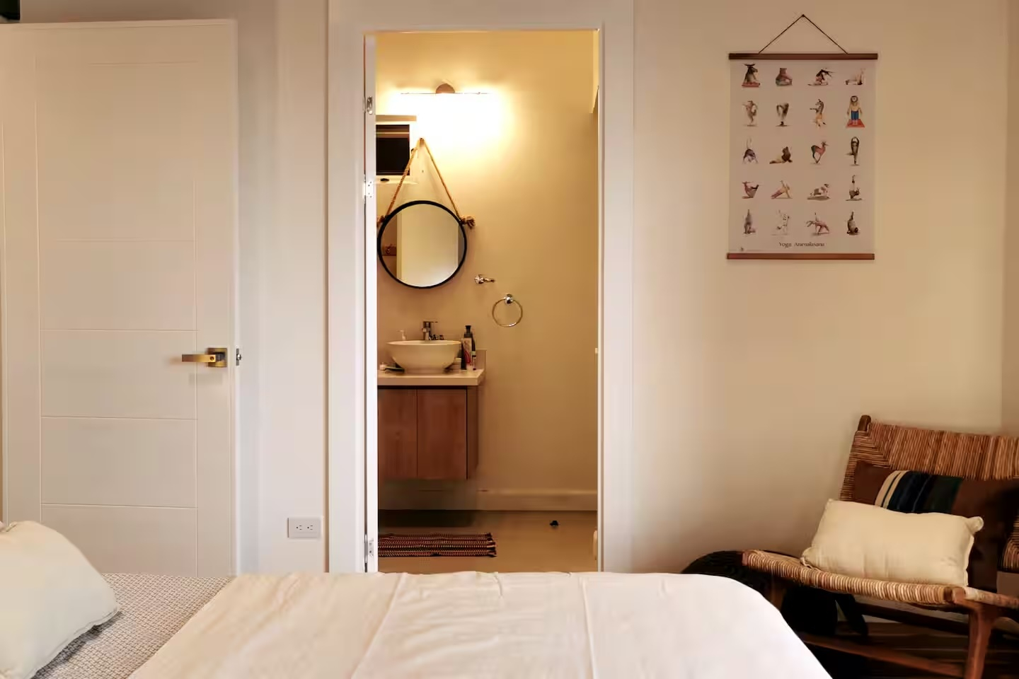 Kitchenette, la vista es al océano y ahora hay un área de bienestar con terraza de yoga en frente.