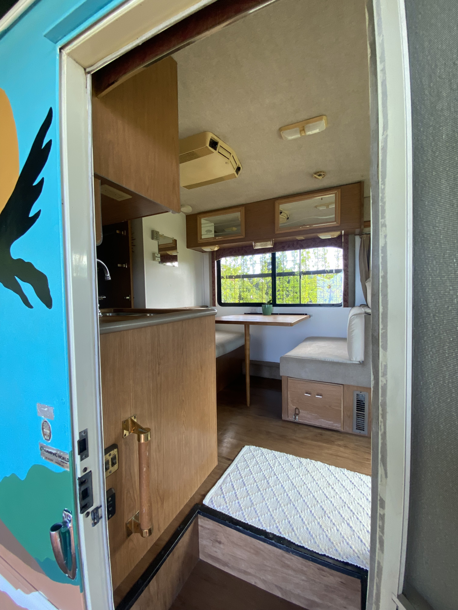 Nuestra caravana para aquellos que también quieren experimentar algo diferente, es para 2 personas, mejor para 1 persona. Ahora hay una tienda de campaña alrededor y una terraza de yoga con área de bienestar.