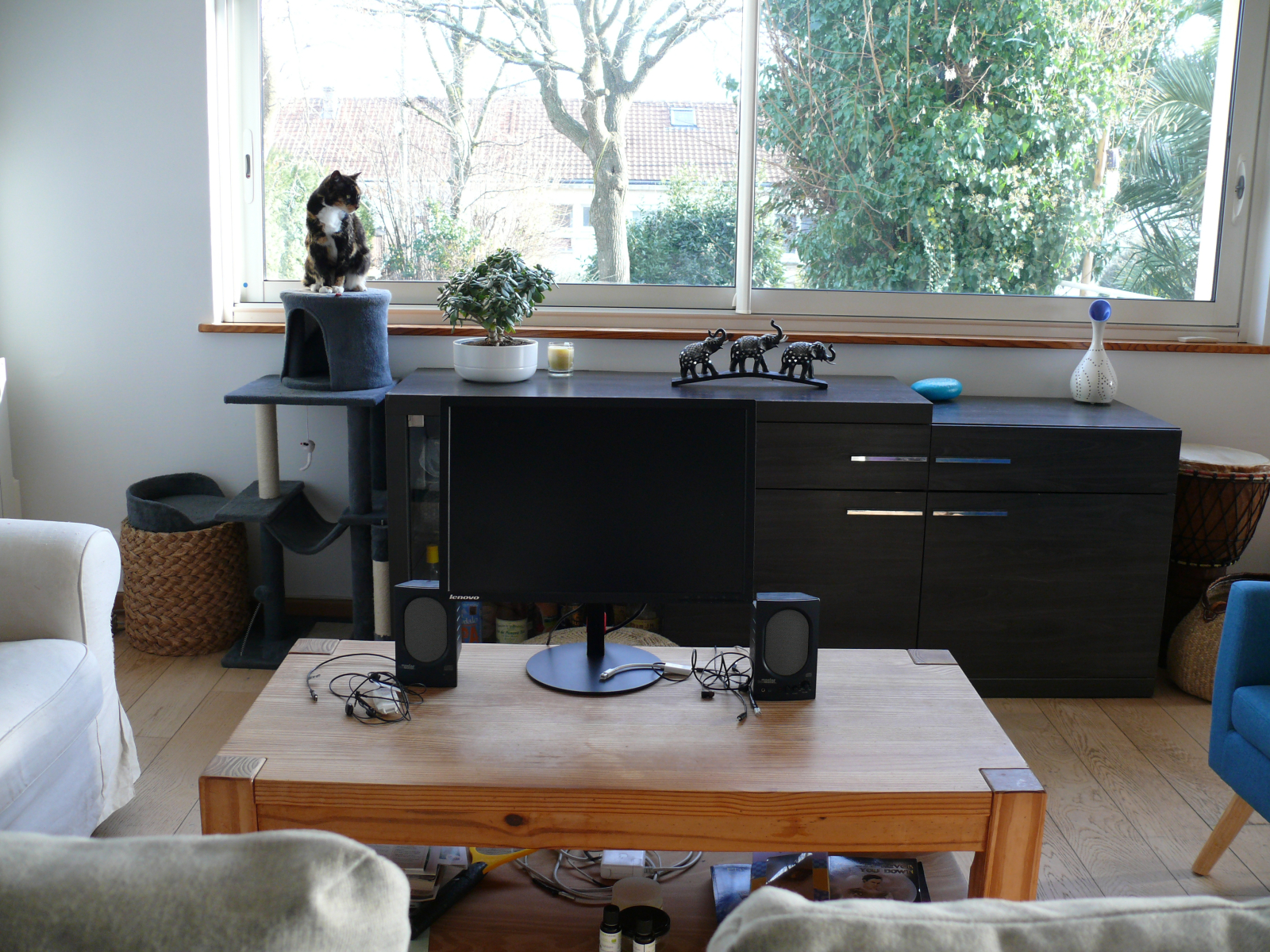 En la sala de estar tenemos una biblioteca bien surtida con libros y juegos de mesa y una pantalla de computadora y 2 parlantes que usamos para escuchar música o ver películas a través de nuestra computadora. No tenemos televisión. El sofá se puede utilizar como cama supletoria ya que es un descapotable de 2 plazas.