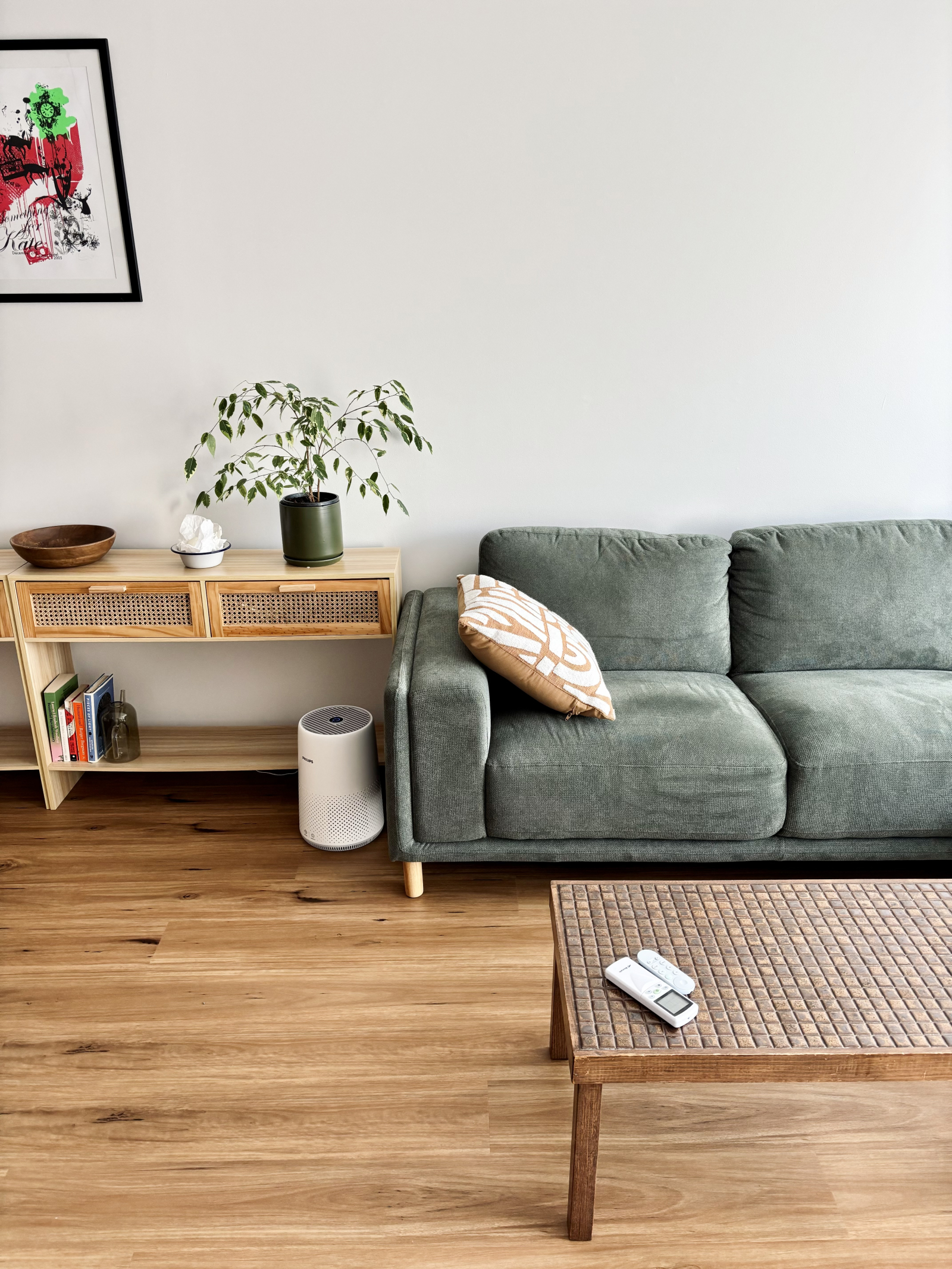 Un sofá grande y cómodo en el salón. Una hermosa mesa de comedor hecha a mano tiene capacidad para 6 personas. Un tocadiscos de alta gama con una pequeña pero encantadora colección de discos para disfrutar.