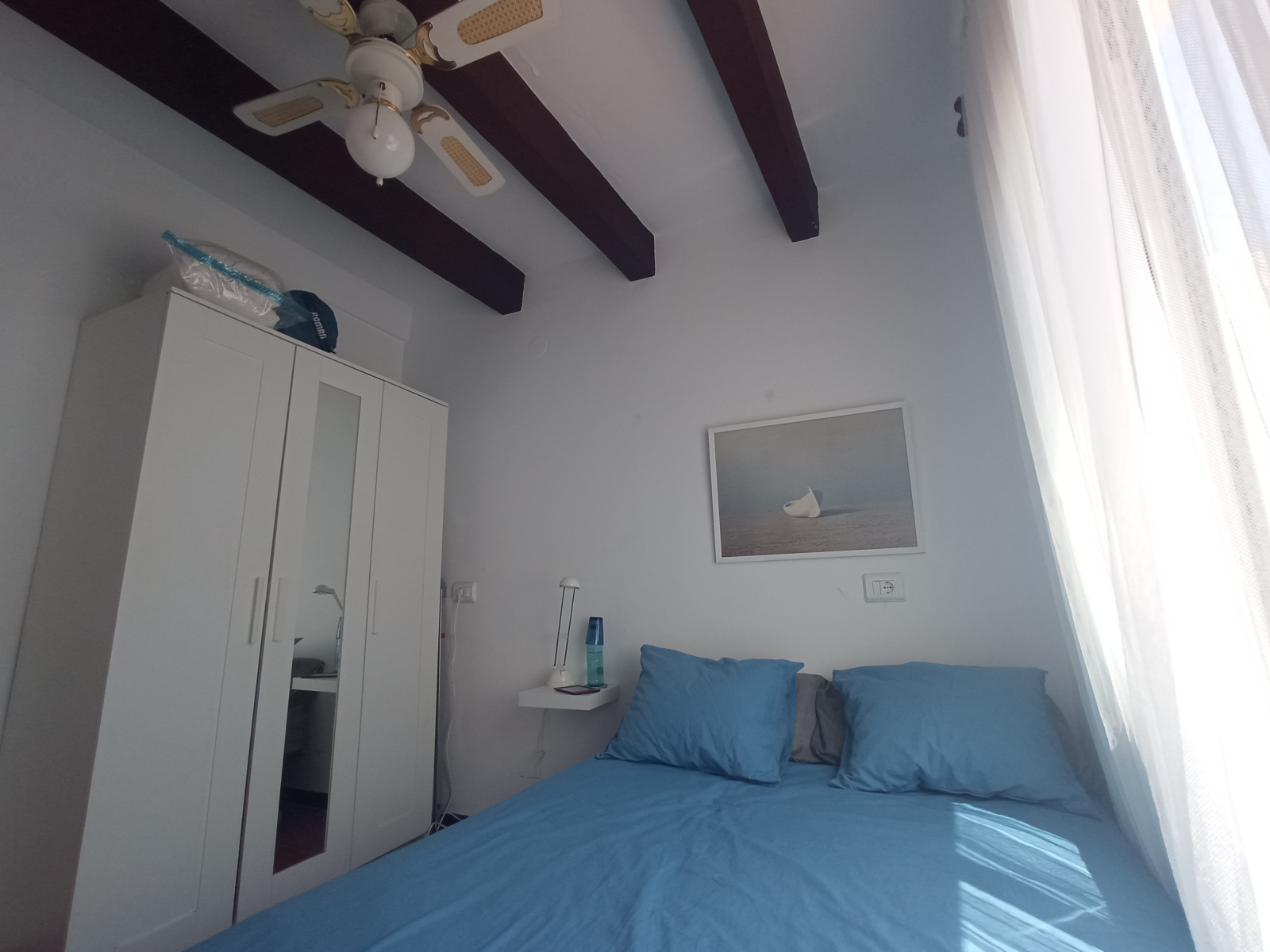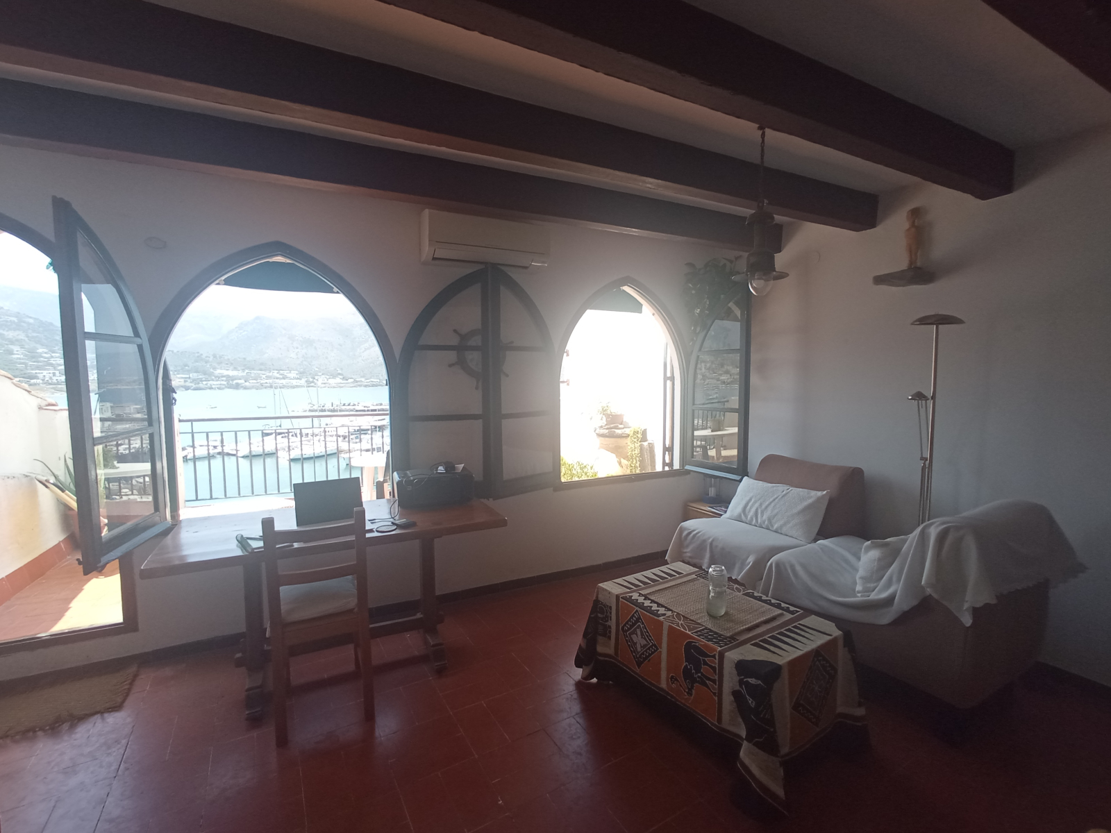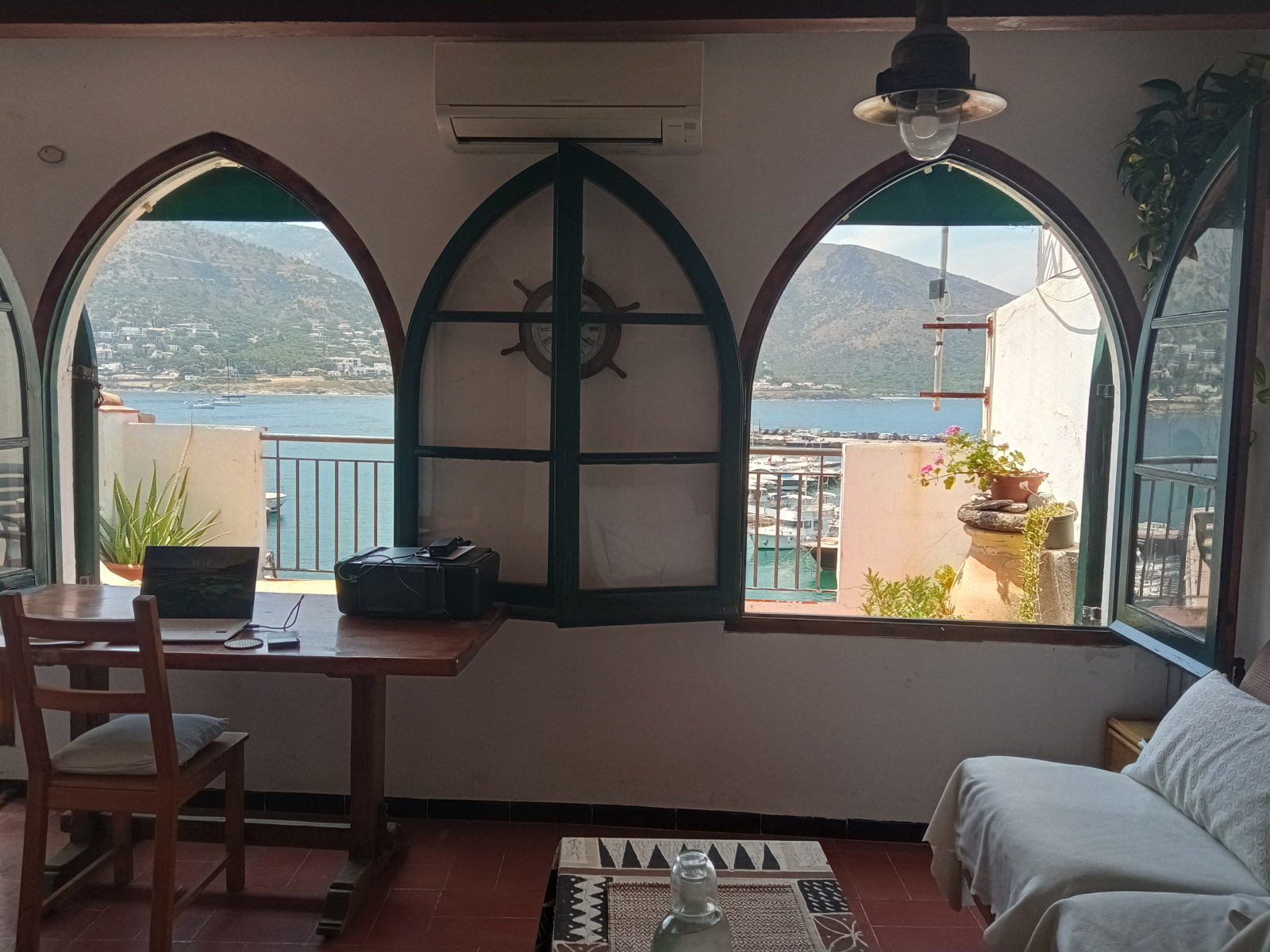 La casa tiene dos balcones. El delantero con sus vistas al mar es increíble. Pero no te olvides del pequeño de atrás: con su vista a una tradicional calle blanca mediterránea y a la iglesia, te llevará a otro mundo.