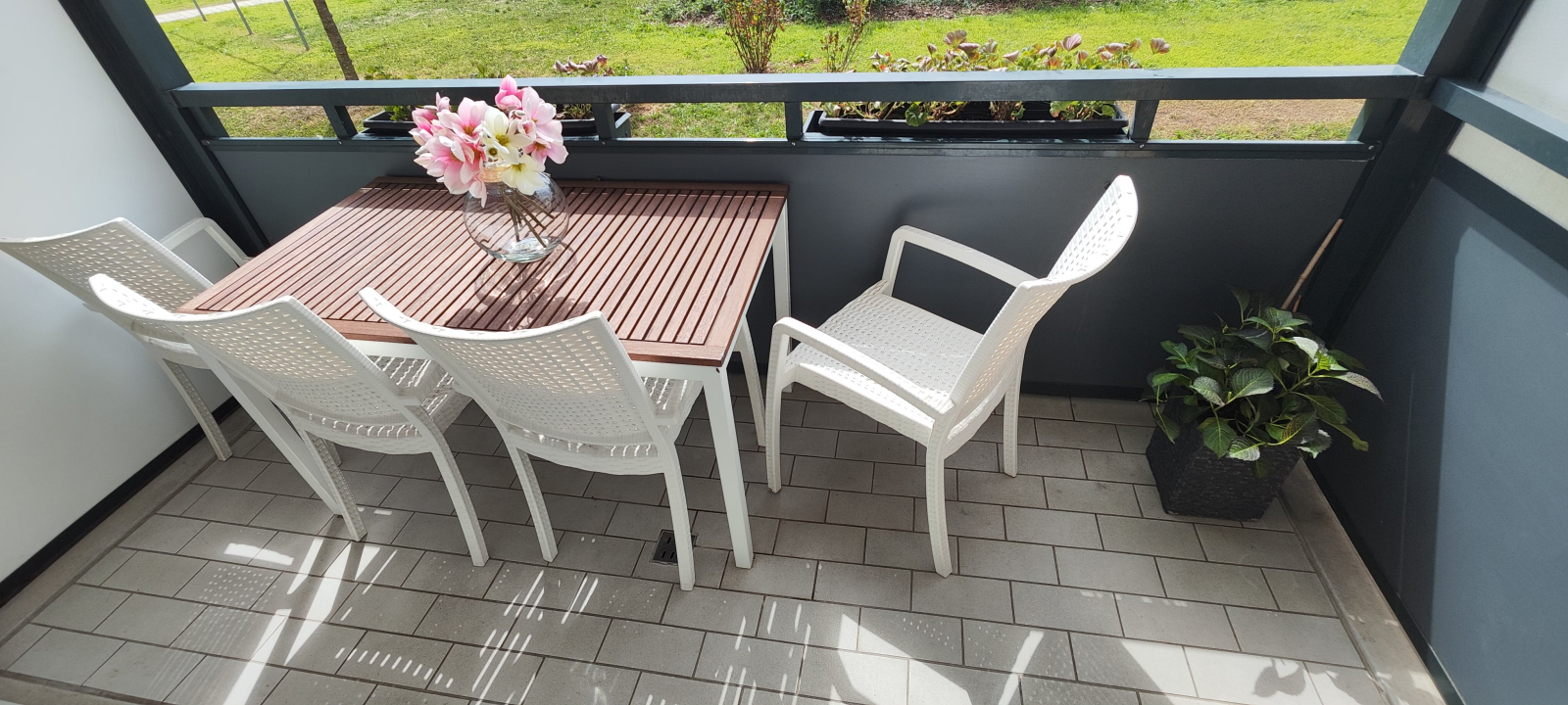 El apartamento consta de dos habitaciones: una sala de estar con un sofá cama para dos personas y un dormitorio con una gran cama doble. Cuenta con un amplio balcón soleado y una zona de lavandería compartida con lavadora y espacio para secar la ropa. El apartamento es muy luminoso y acogedor.
