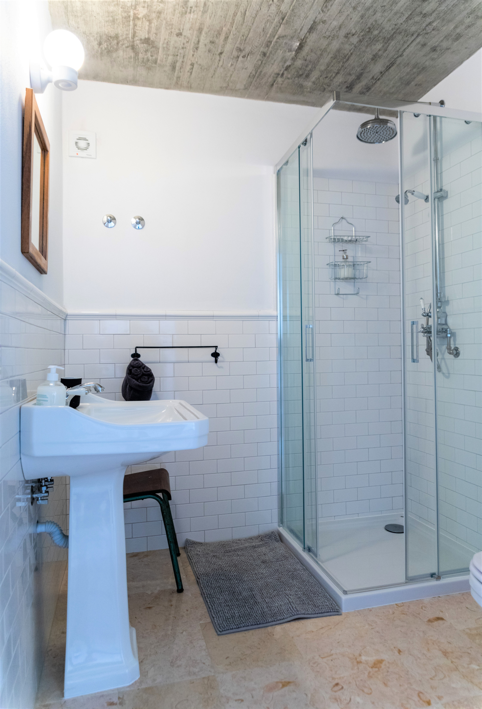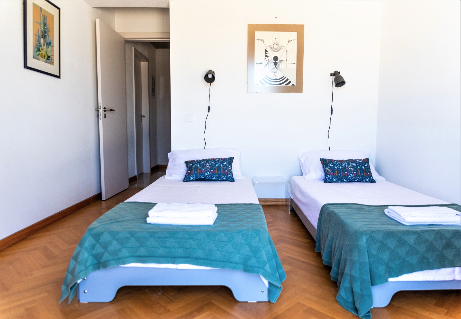 El dormitorio tiene dos cómodas camas individuales, una silla y espacio para colgar / guardar ropa. Al lado hay un baño clásico con azulejos y cabina de ducha.