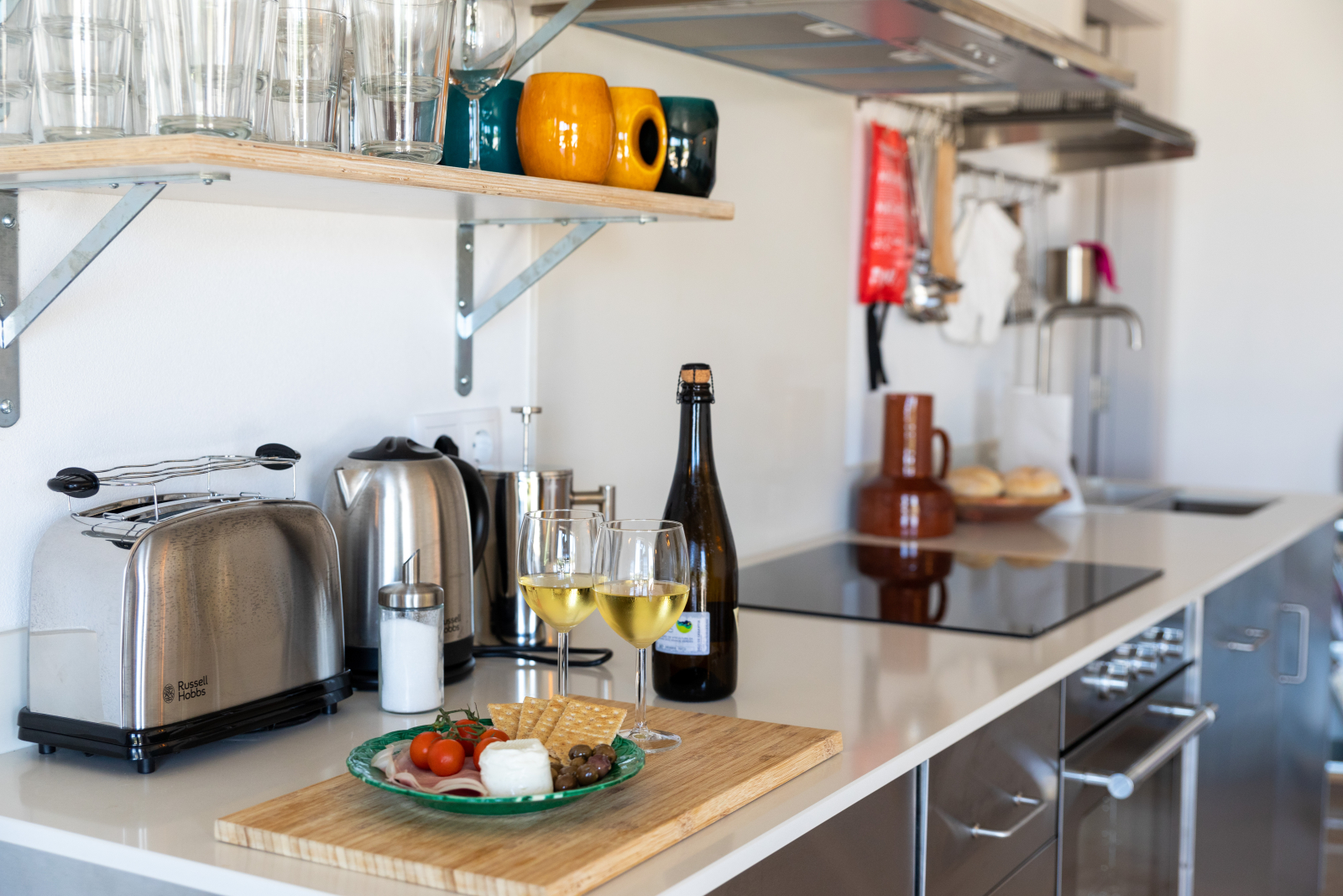 Si te apetece comer en casa, hay una mesa y una cocina americana totalmente equipada, con todo lo que puedas necesitar. Cuenta con hervidor de agua, cafetera y tostadora, además de horno, placa de inducción, nevera y lavavajillas integrados.