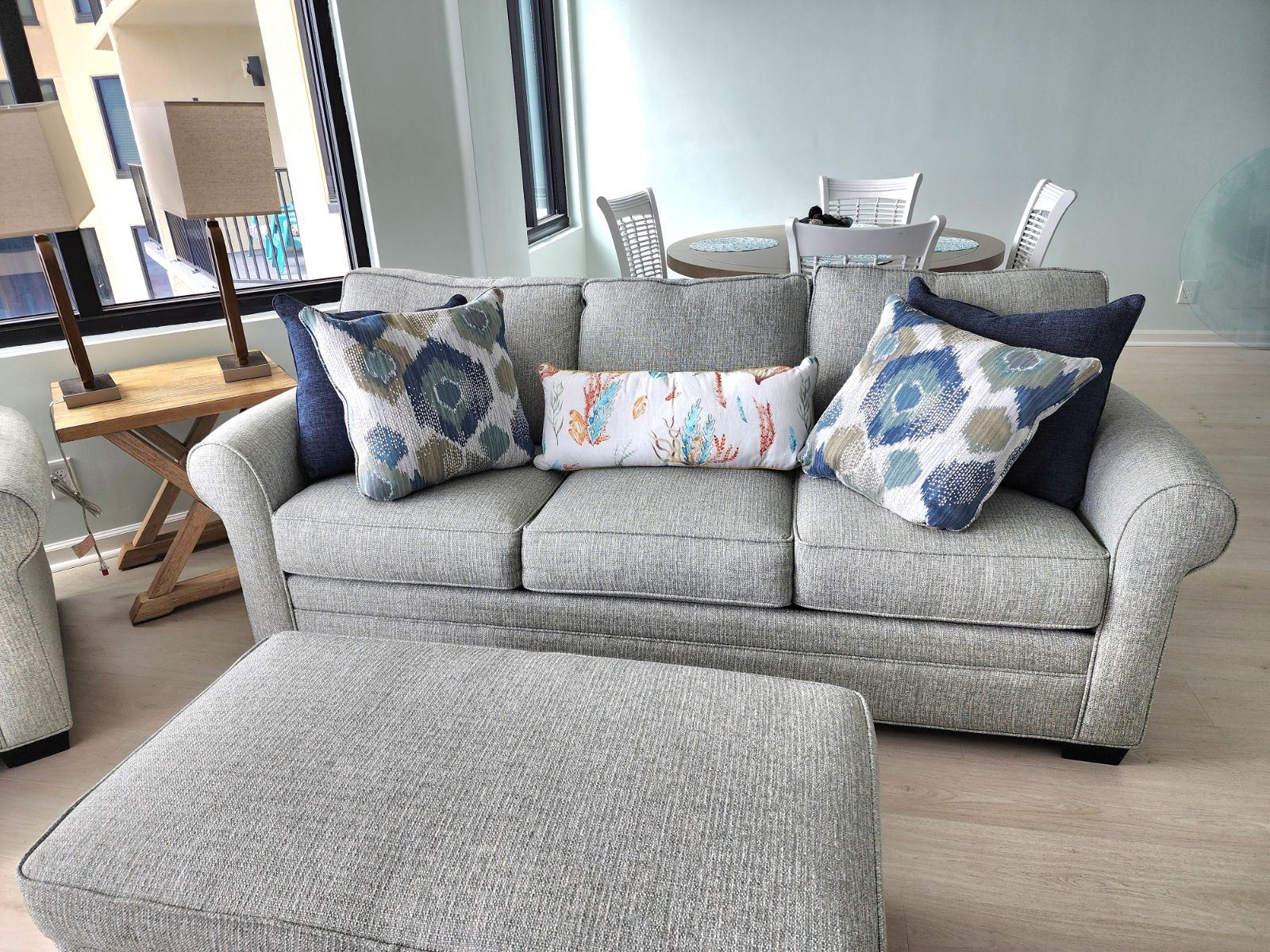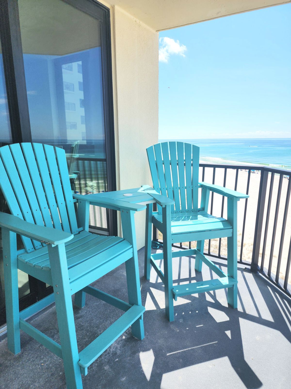 Acceso al balcón desde la sala de estar / comedor y los controles deslizantes del dormitorio. El balcón ofrece sillas altas y una mesa para que pueda relajarse con su café de la mañana o una copa de vino por la noche mientras observa delfines o lee.