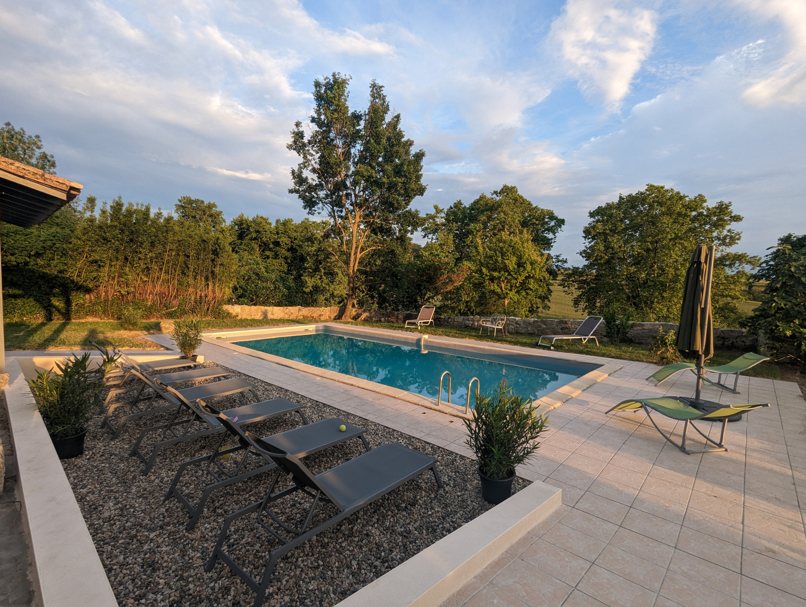 La casa tiene un gran jardín, una terraza cubierta con una larga mesa de madera con capacidad para 12 personas y una piscina de 11m x 5m que tiene un extremo poco profundo y profundo. La terraza también tiene una mesa de piedra de mármol para 4 personas (buena para tomar una copa mientras se pone el sol), y tiene tumbonas y sombrillas, así como varias otras áreas para sentarse y relajarse. Una de las actividades nocturnas favoritas es observar las estrellas, y durante los meses de verano, las noches despejadas revelan una increíble variedad de estrellas fugaces, satélites y toda la panoplia de la Vía Láctea. Se proporcionan toallas de piscina.