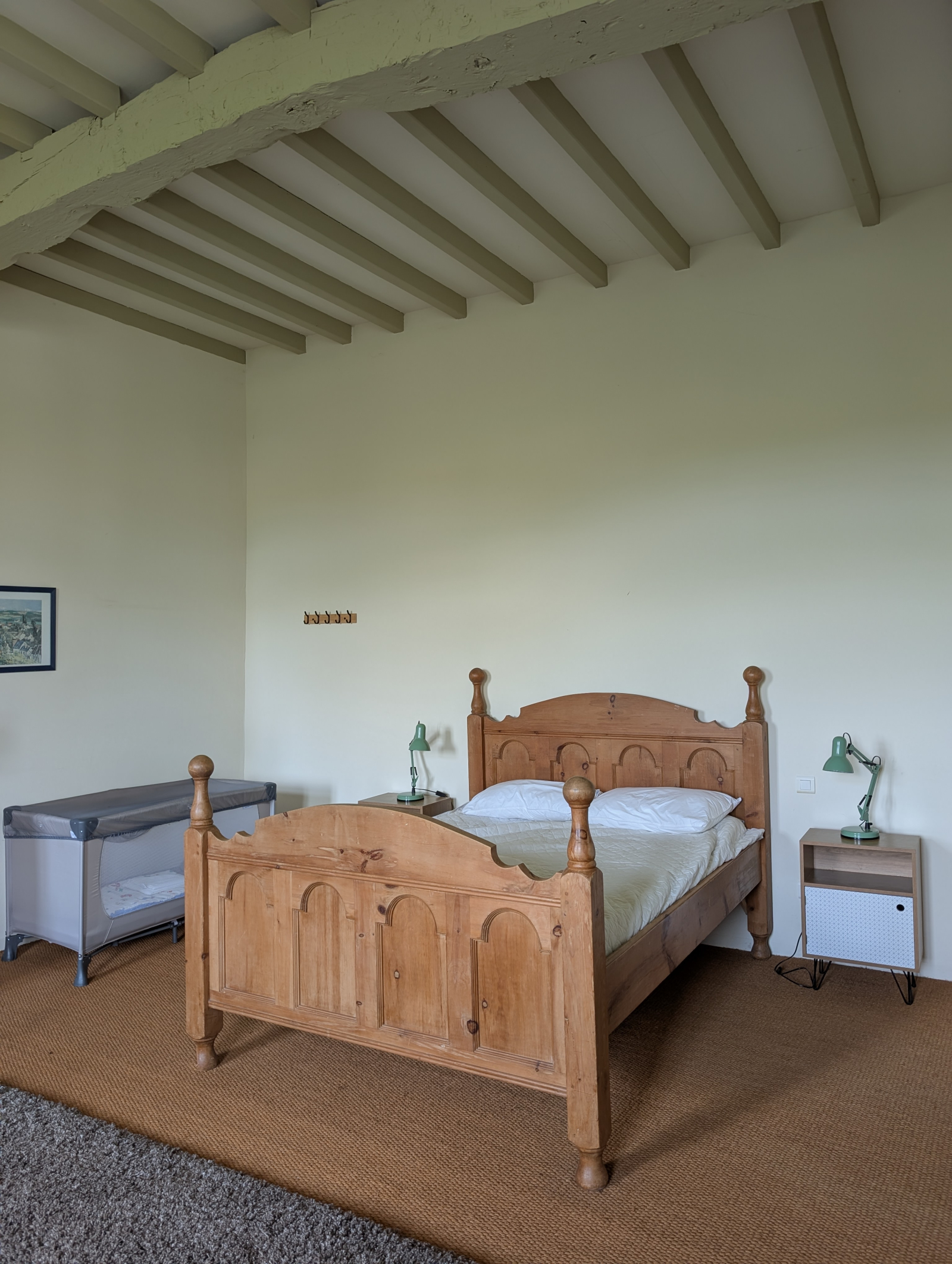 Hay cuatro dormitorios grandes en el primer piso; uno con seis camas individuales, los otros tres con una cama doble cada uno, y uno de ellos con un sofá cama doble. Dos de los dormitorios también tienen baños en suite con ducha, y hay otros dos baños (uno arriba y otro abajo) también con duchas. Hay una cuna. Se proporcionan toallas de baño y ducha en las camas a su llegada.