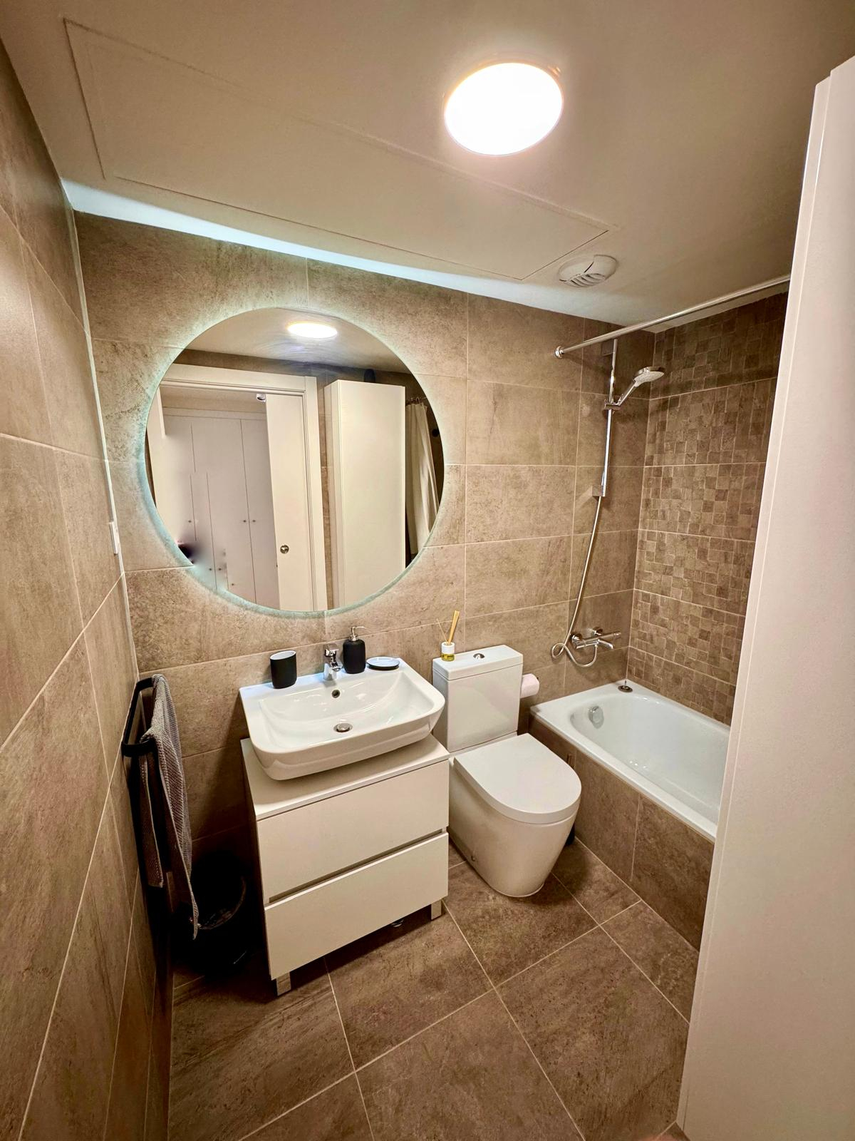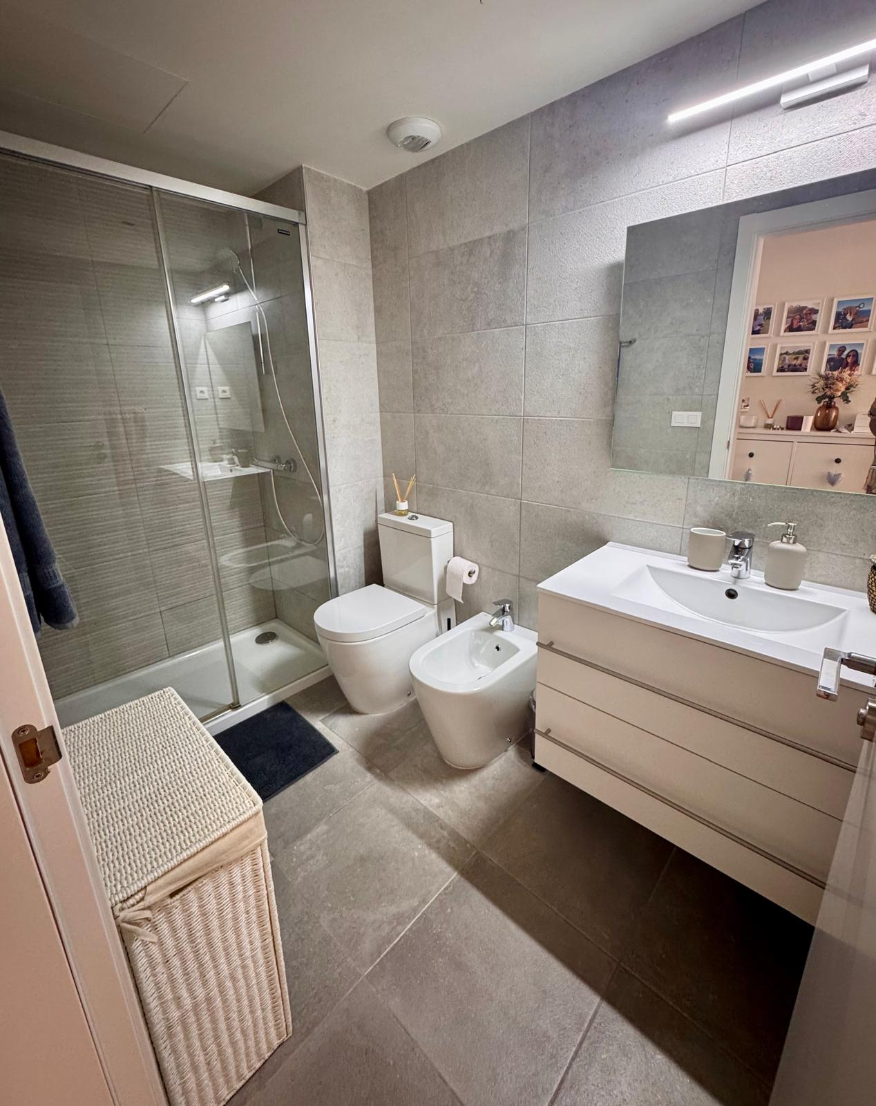 hay dos baños, una zona de trabajo con escritorio y doble pantalla. Disponemos de dos piscinas comunitarias que se pueden utilizar, así como una zona de juegos para los niños, también en las zonas comunes.