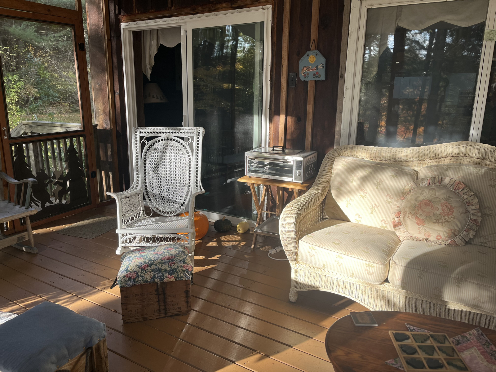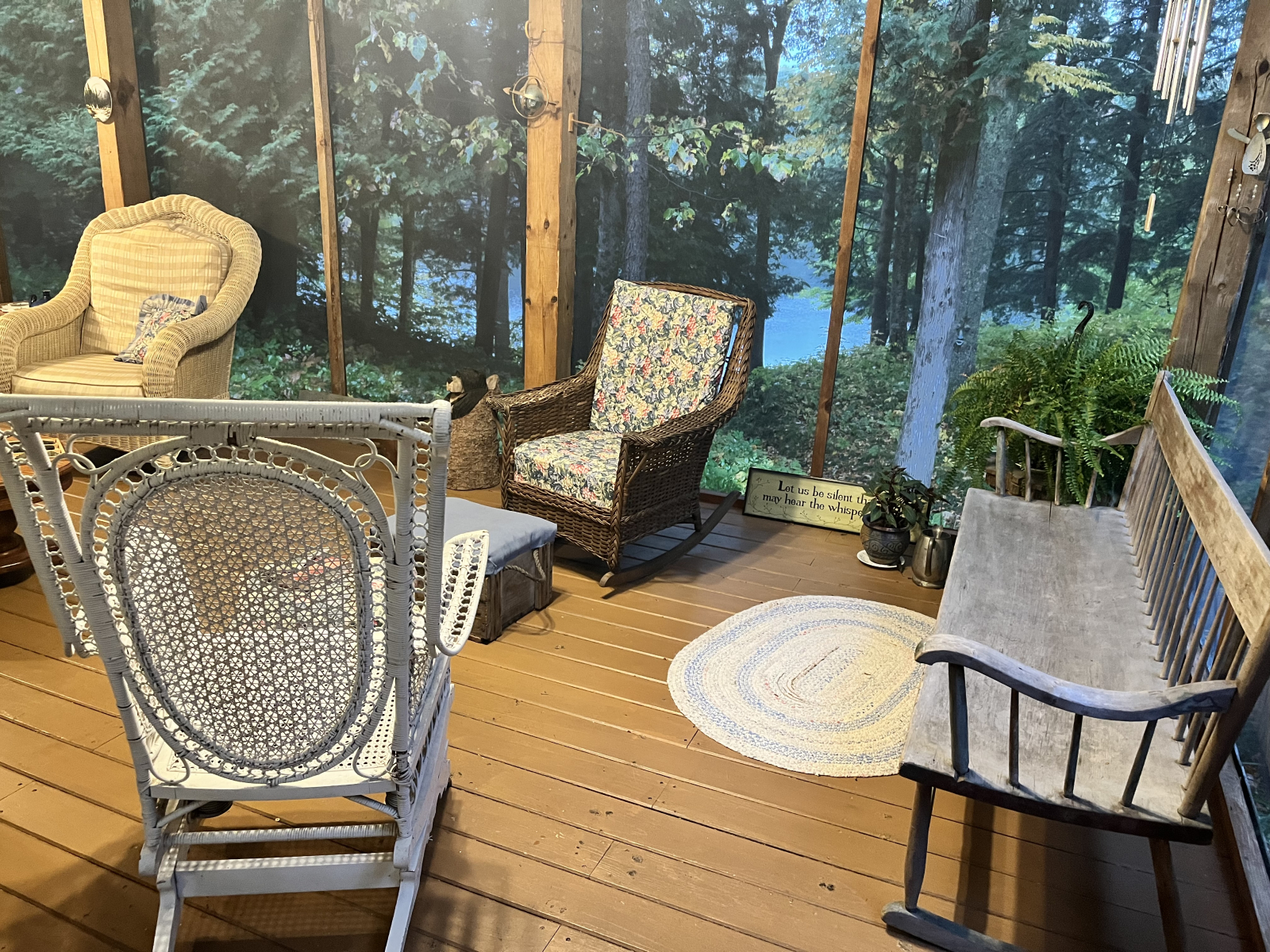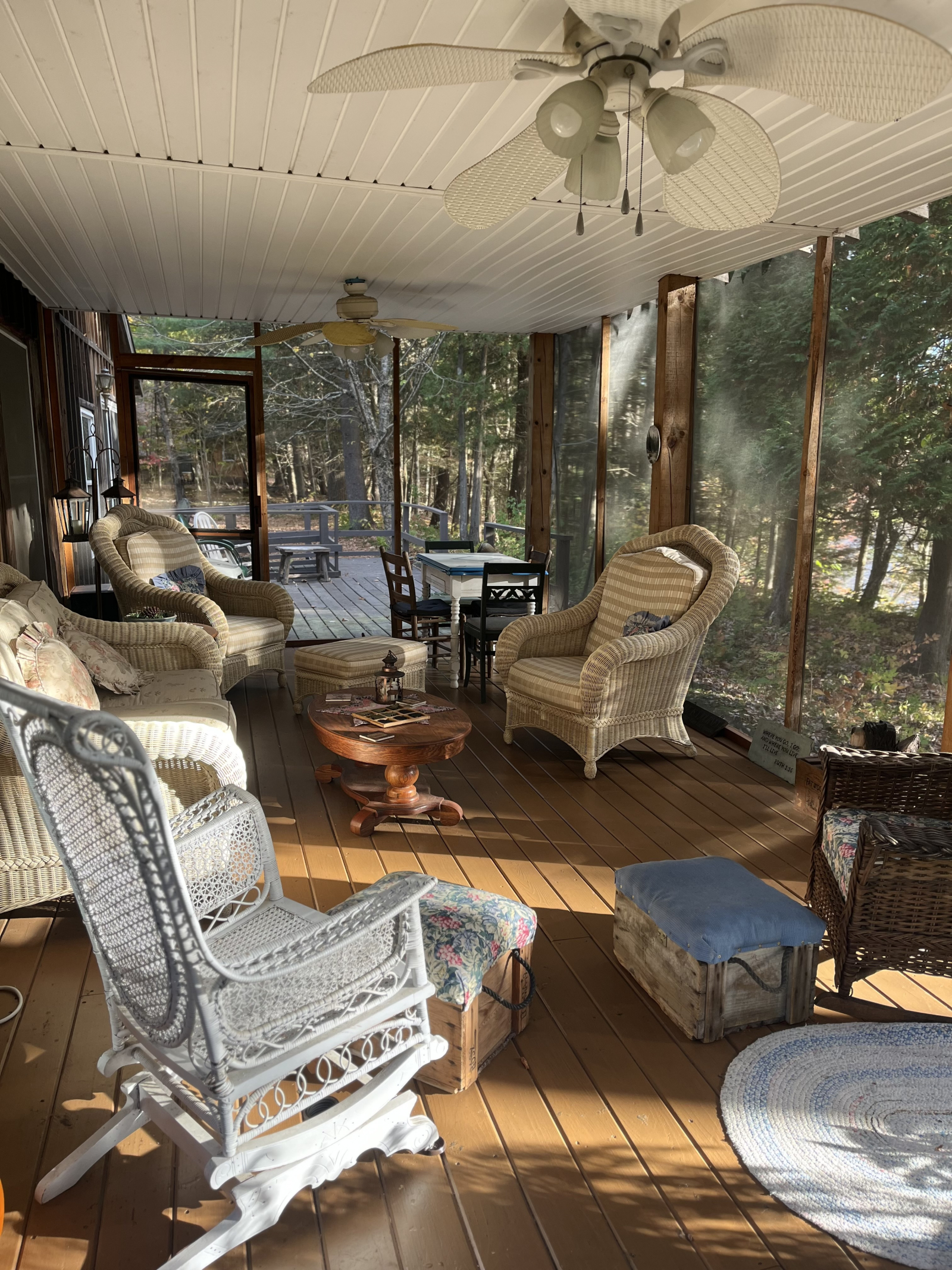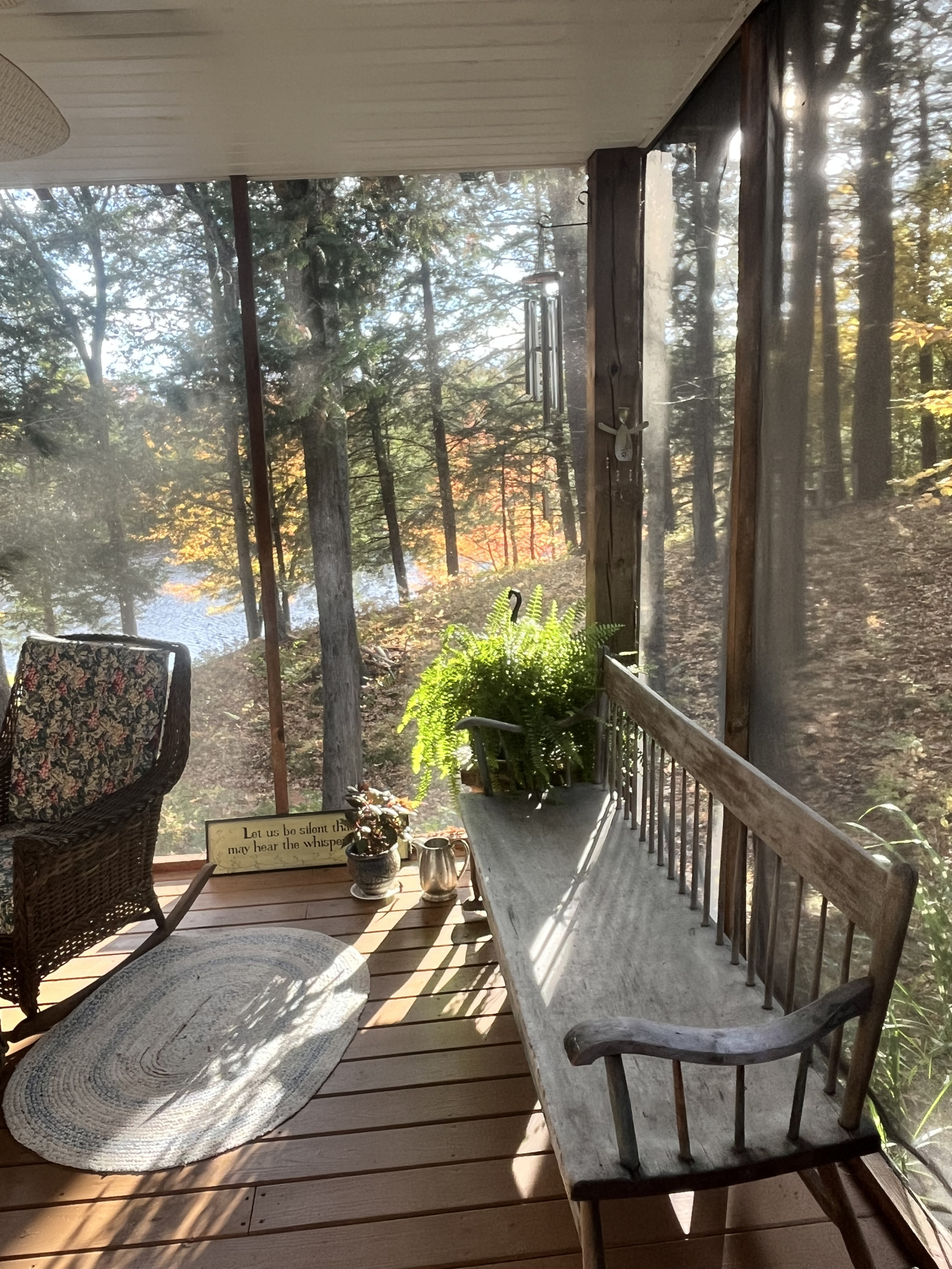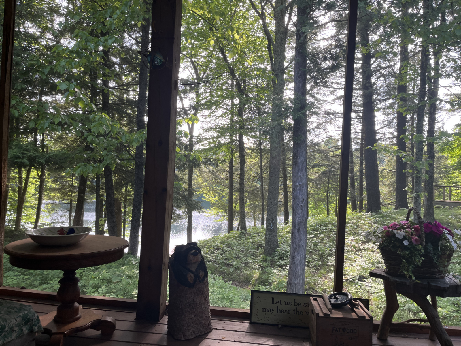 Sentarse en el porche delantero con mosquitero por la mañana revela una multitud de diamantes brillantes mientras el sol brilla en la superficie del lago. El sol de la tarde envía rayos de luz a través del verde de los árboles y muestra la belleza de los bosques.