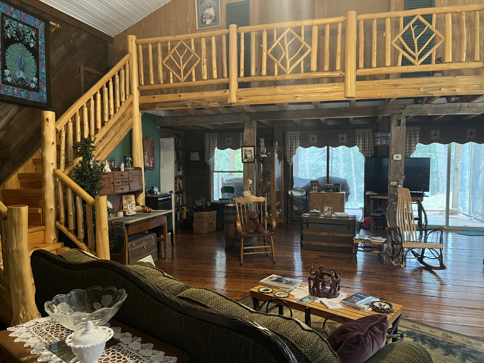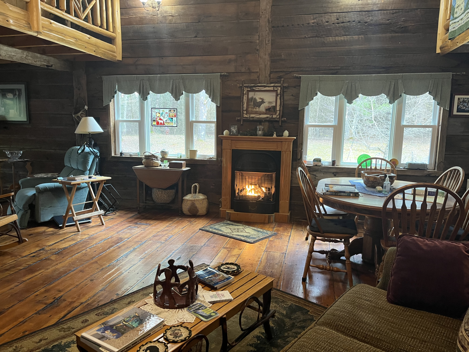 La estructura principal de esta cabaña única fue una vez un granero de 100 años. La madera recuperada fue traída a este terreno prístino de 3 1/2 acres y se convirtió en una cabaña rústica al borde de un lago de 10 acres. Las vigas talladas a mano de 8 pulgadas sostienen un desván en el piso superior a cada lado de la gran sala de abajo. (4 dormitorios) El suelo original de tablones de cerezo lo soporta todo.