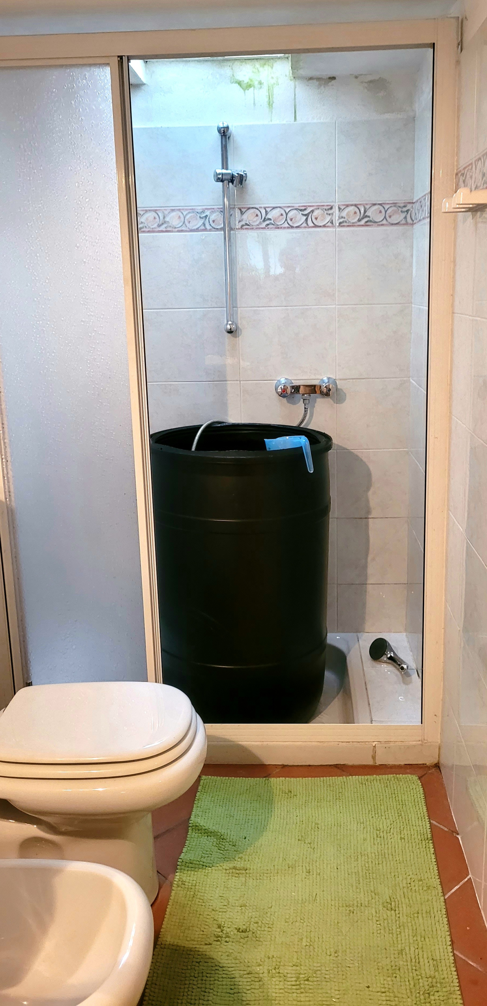 El agua proviene de una cisterna que recoge la lluvia y la nieve derretida, por lo que no es potable. En verano suele estar bien lleno; En invierno necesitarás usar agua de un barril.