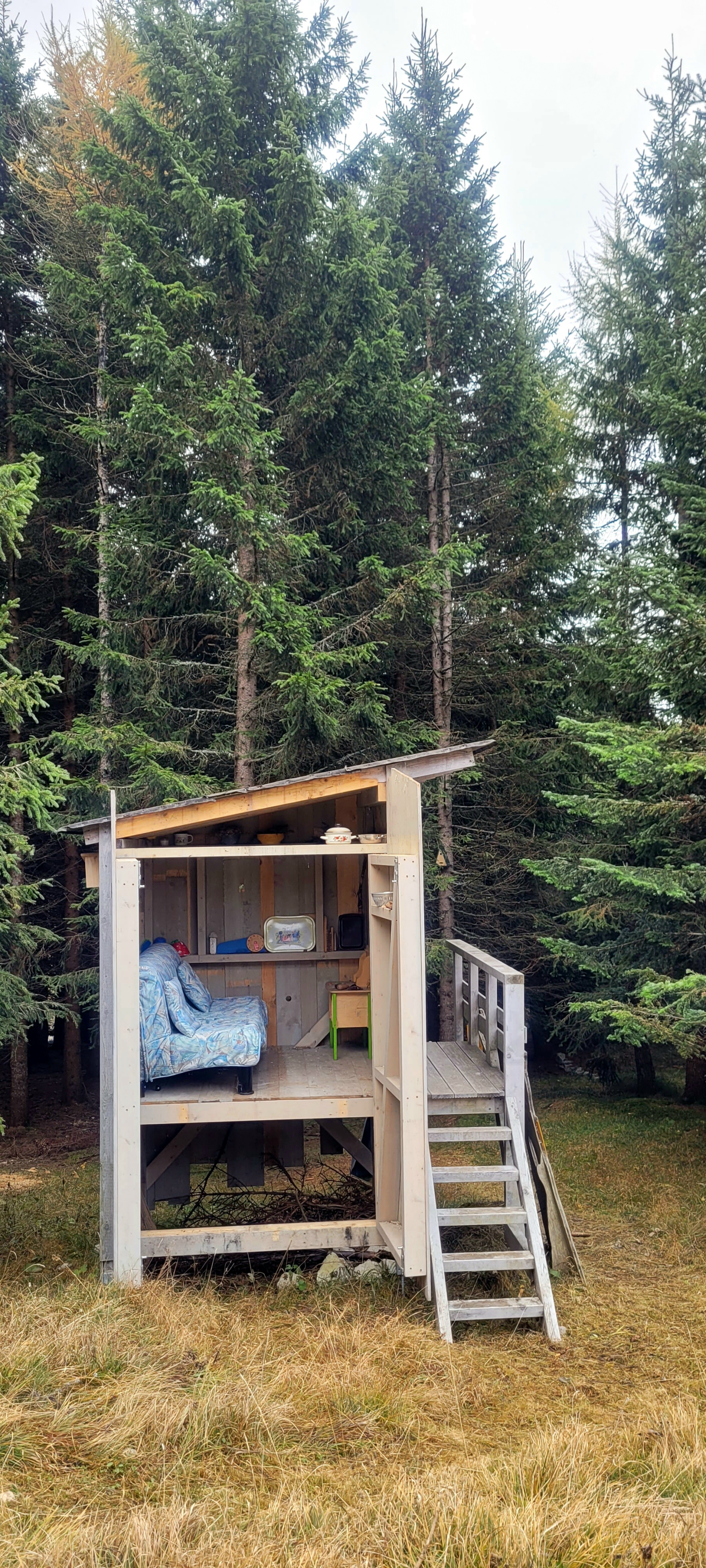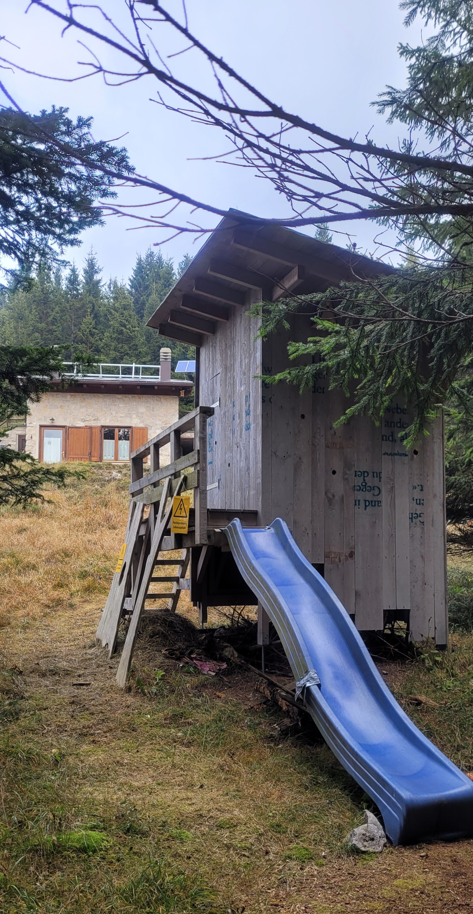 Hay una gran casa de juegos de madera afuera con un pequeño sofá, algunos juguetes y animales de peluche dentro de la cabaña y, por supuesto, el bosque alrededor para explorar y jugar. Es un verdadero lugar de aventura para los niños: mucho espacio para deambular, imaginar y simplemente ser libre.