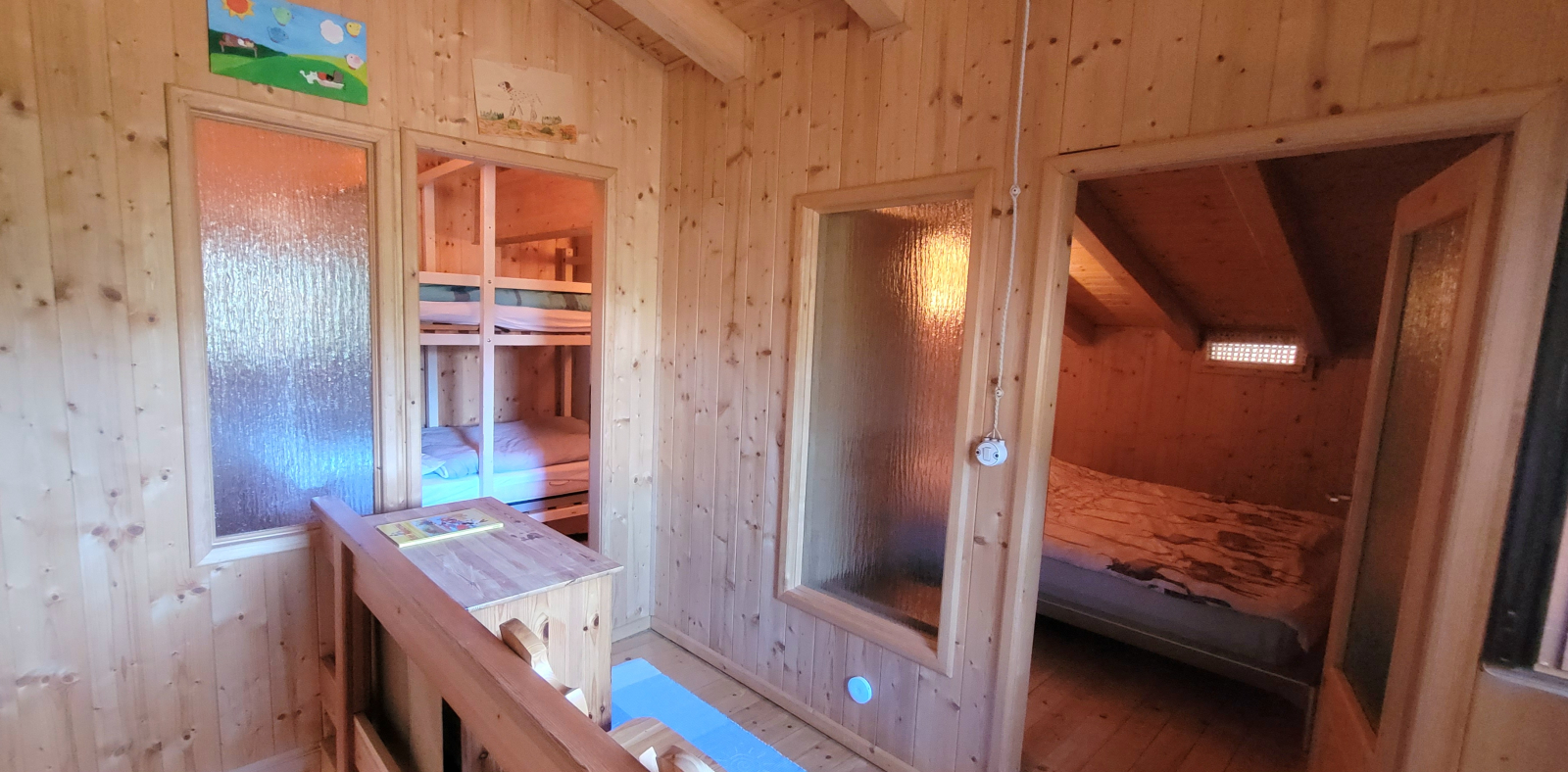 La cabaña tiene dos pisos: vivir y cocinar en la planta baja, dormir en la planta superior, y puede albergar hasta ocho personas (idealmente un máximo de seis).