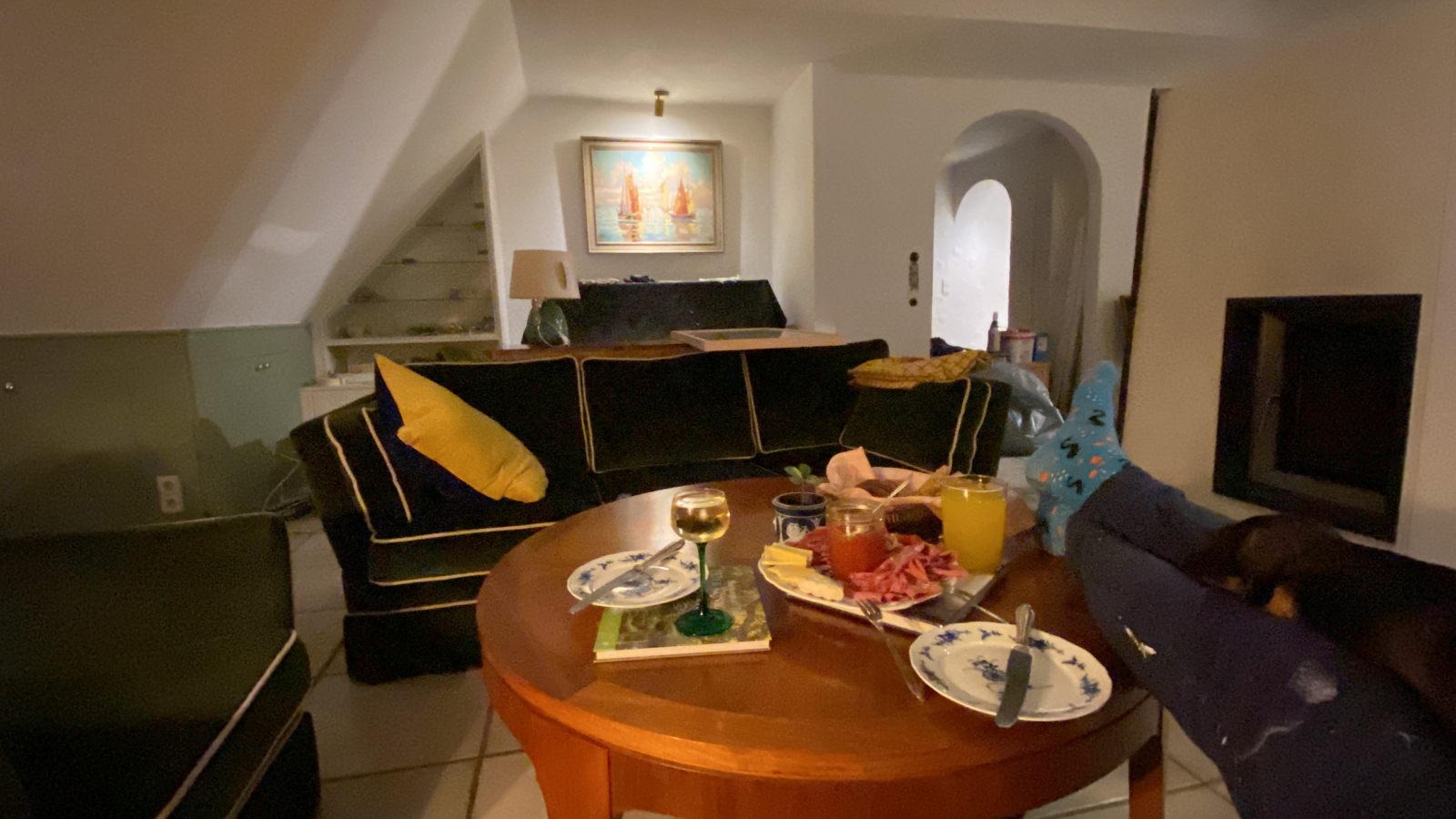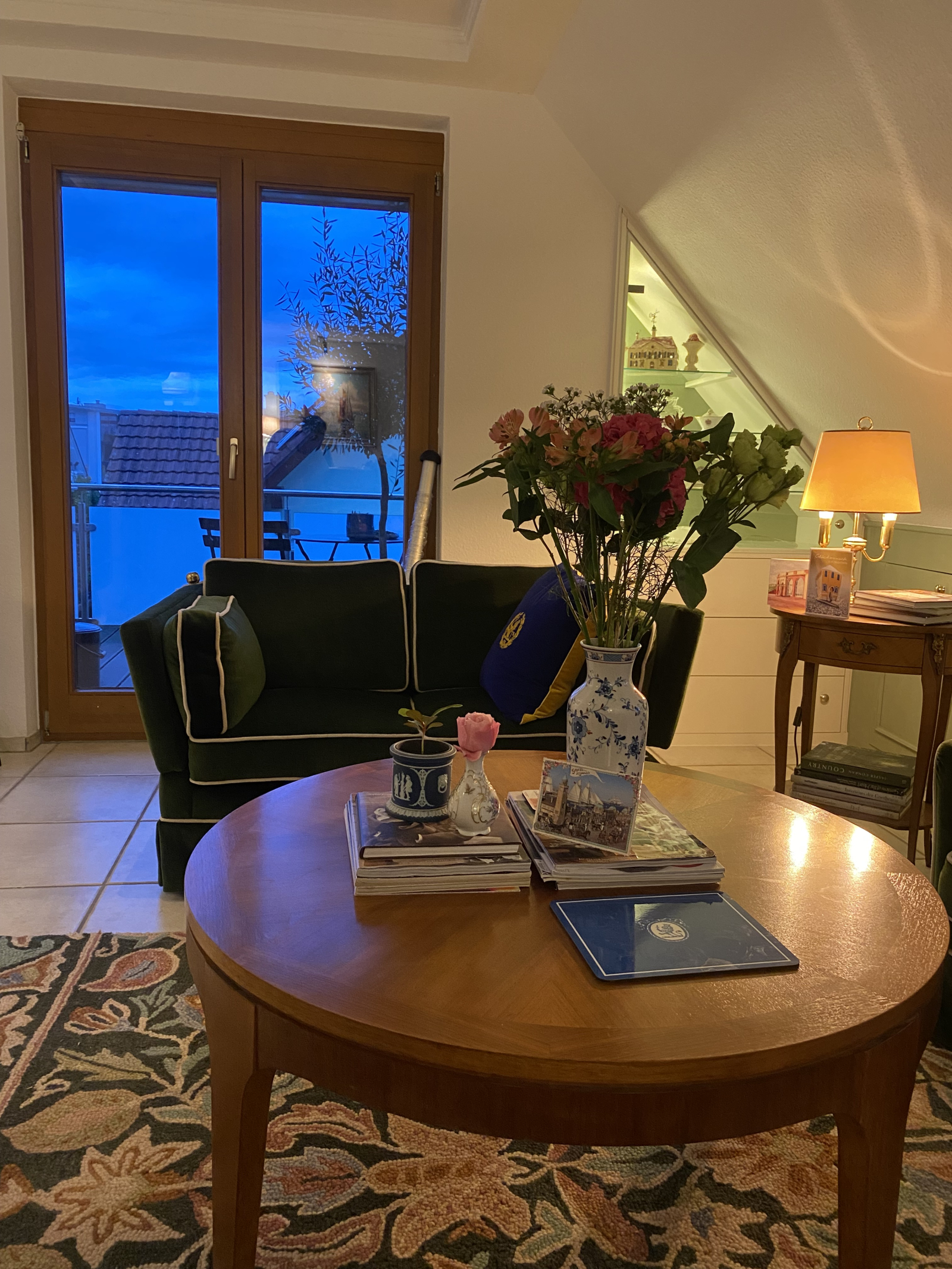 Nuestro apartamento tiene 2 dormitorios, un gran salón y comedor con chimenea, 2 balcones, un baño grande con ducha y bañera y un baño de invitados. El apartamento está situado en el ático de un edificio de apartamentos y mide 112 metros cuadrados. Damos gran importancia a un interior colorido y acogedor, con muebles de madera antiguos y muchos elementos decorativos personales.