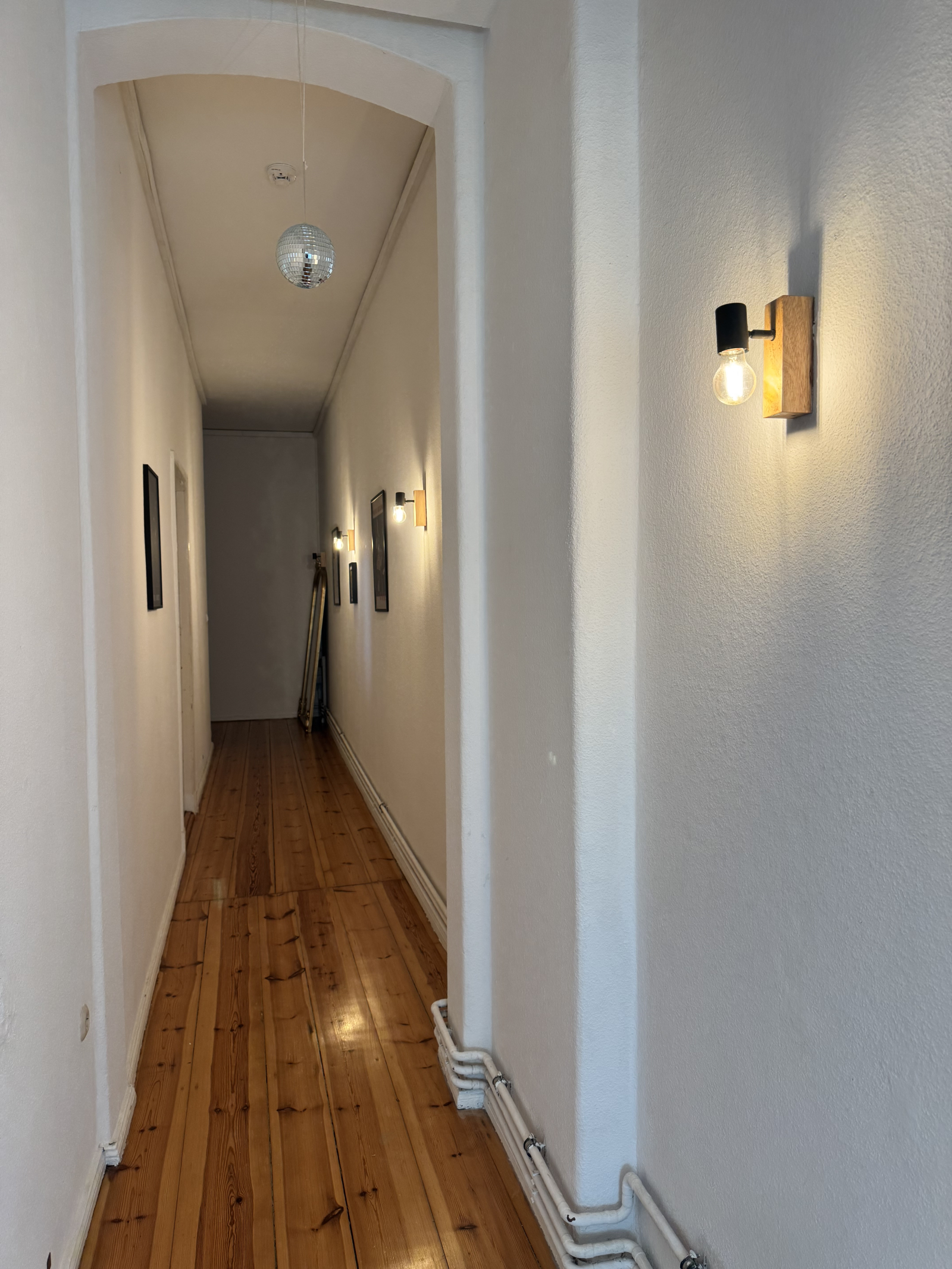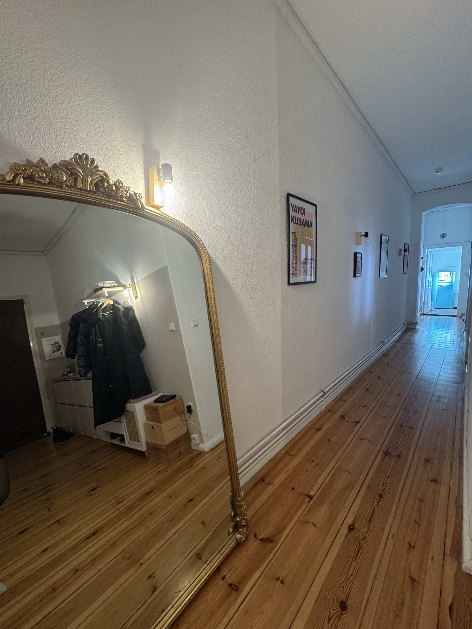 Le couloir est long et élégant, avec un éclairage chaleureux et un grand miroir qui ajoute du caractère à l’espace.