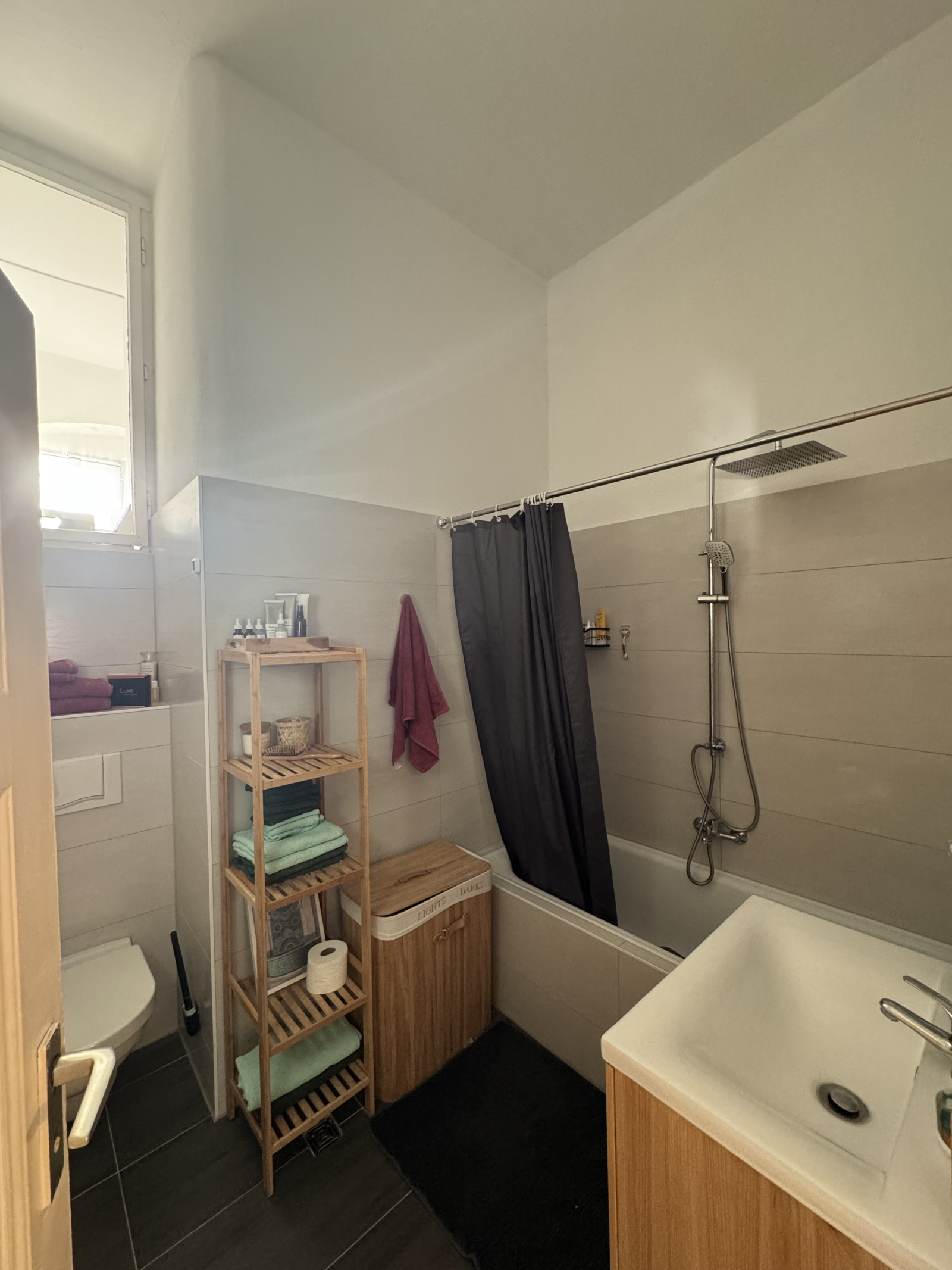 Notre salle de bains comprend une baignoire avec douche à effet pluie, une fenêtre pour la lumière naturelle et tous les éléments de base dont vous avez besoin.