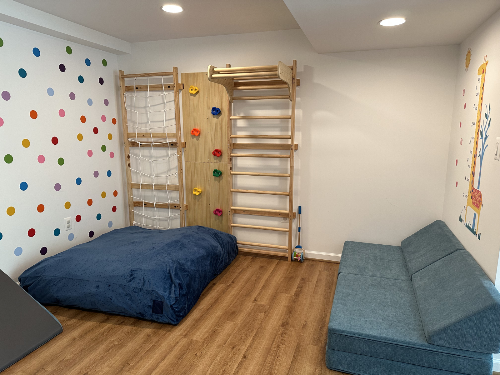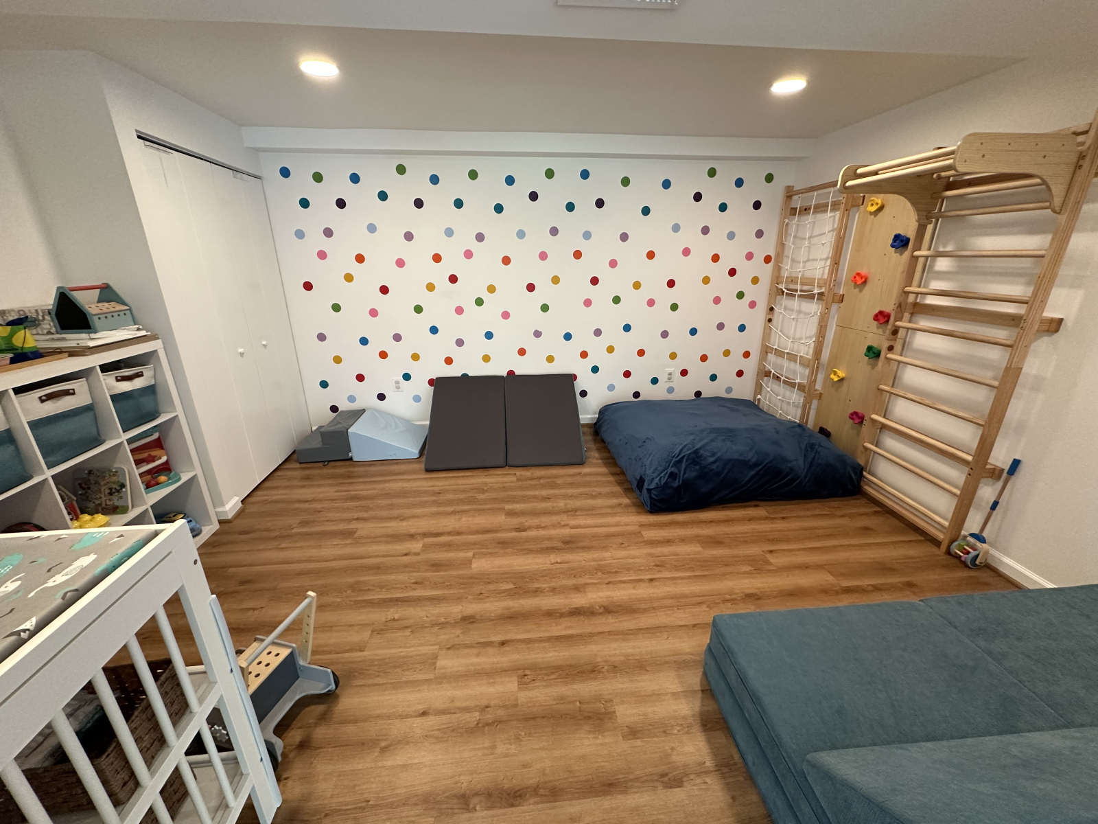 Notre maison est sur deux étages. Le rez-de-chaussée a un bel aménagement ouvert avec une grande cuisine moderne, un îlot avec des tabourets de bar, une salle à manger et un salon. Deux petites chambres se trouvent dans le couloir, l’une avec un berceau qui peut être converti en lit pour tout-petit et l’autre avec un lit simple, ainsi qu’une salle de bain complète et une demi-baignoire. L’étage inférieur dispose d’une chambre plus grande avec un lit queen et un bureau, une salle de bain complète et un très grand espace non meublé qui sert d’aire de jeux remplie de toutes sortes de jouets. Il y a une autre salle de jeux qui a une échelle suédoise et un mur d’escalade parfait pour les enfants. Nous avons également une terrasse avec une grande table et un gril à gaz que vous êtes invités à utiliser.