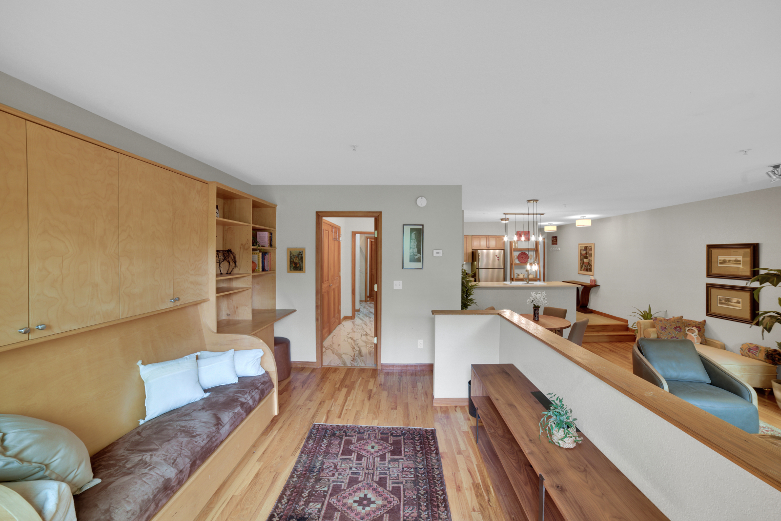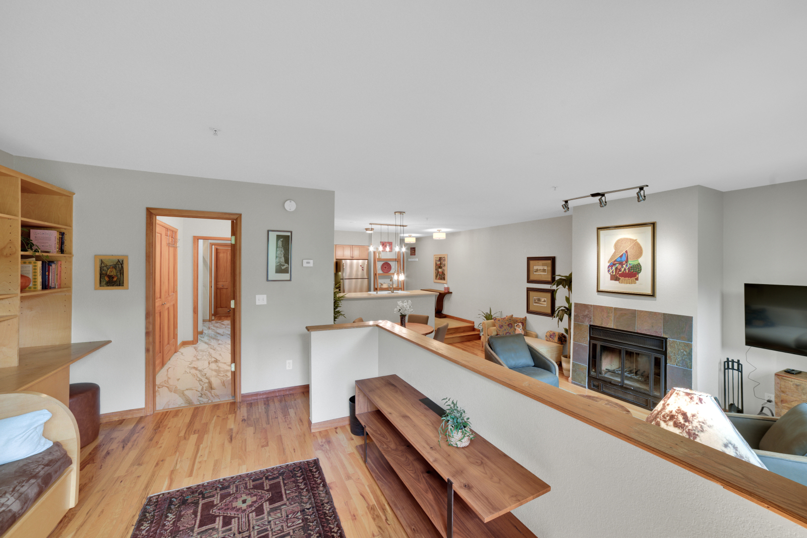Il y a 2-3 marches menant au condo ainsi qu’un salon en contrebas.