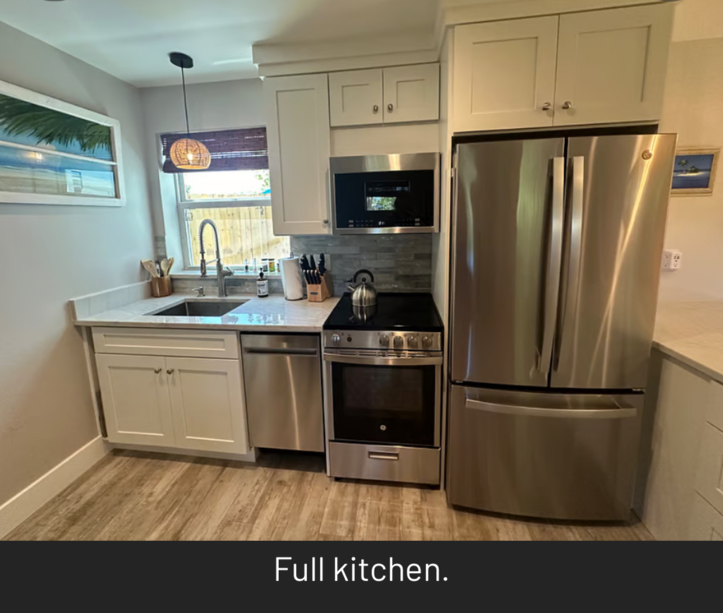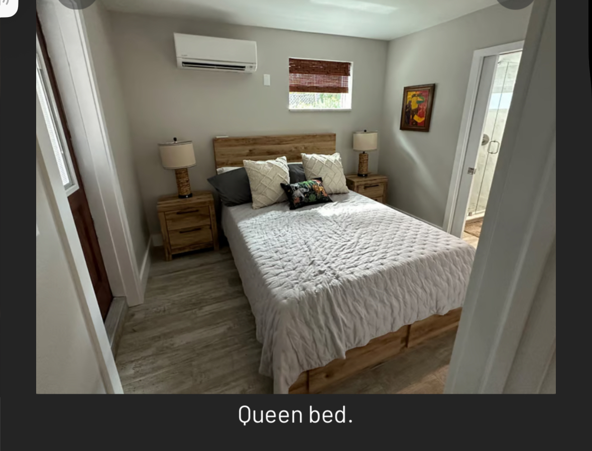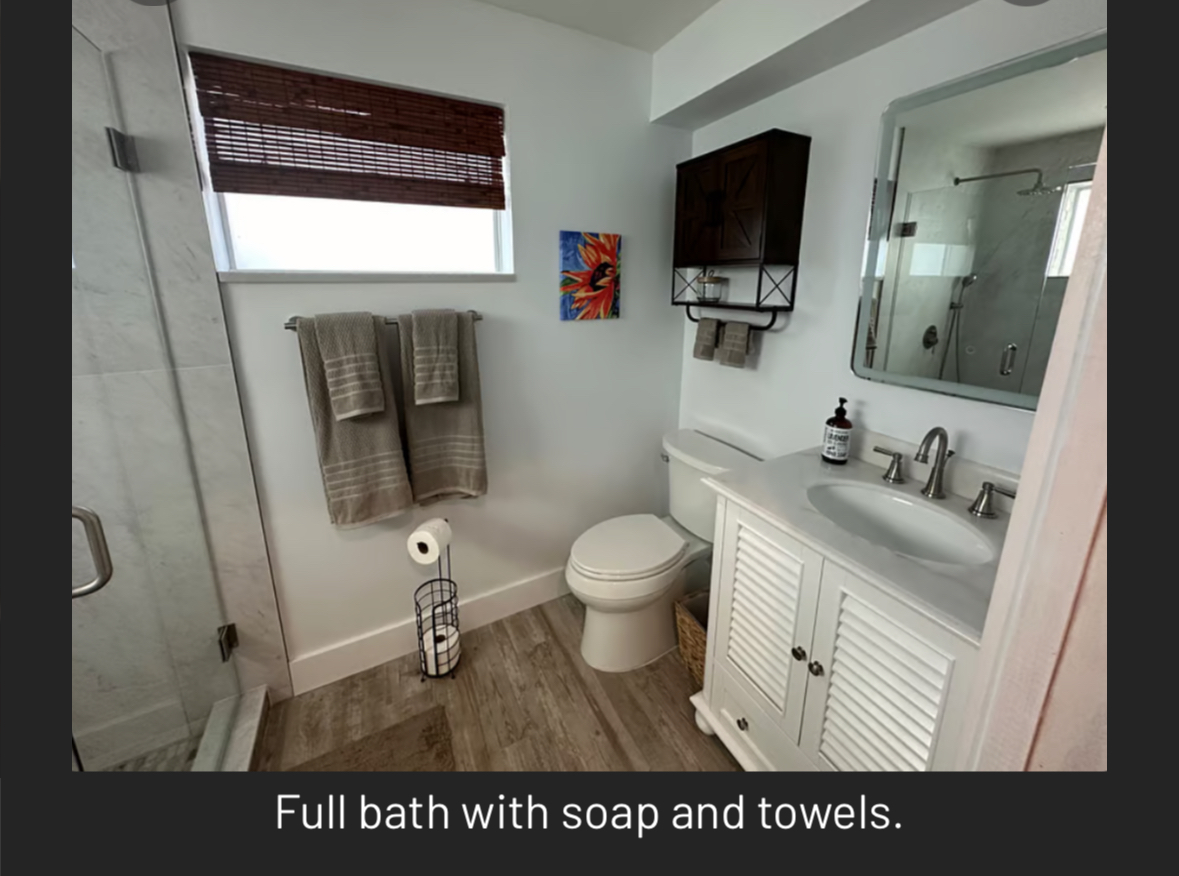 Un chalet récemment rénové de 1 chambre et 1 salle de bain avec une cuisine complète. Salle de bains décadente avec douche à effet pluie. Laveuse et sécheuse privées. Espace extérieur avec barbecue orné de bambous et de palmiers topiques.