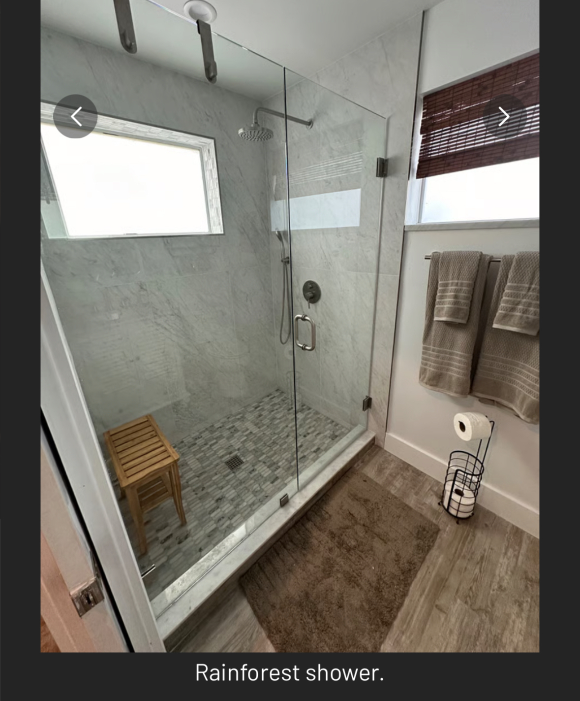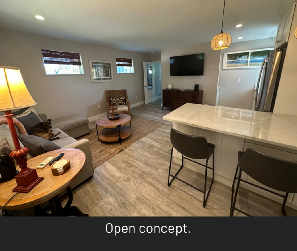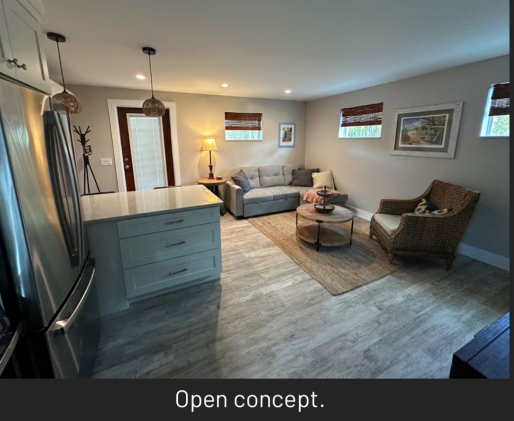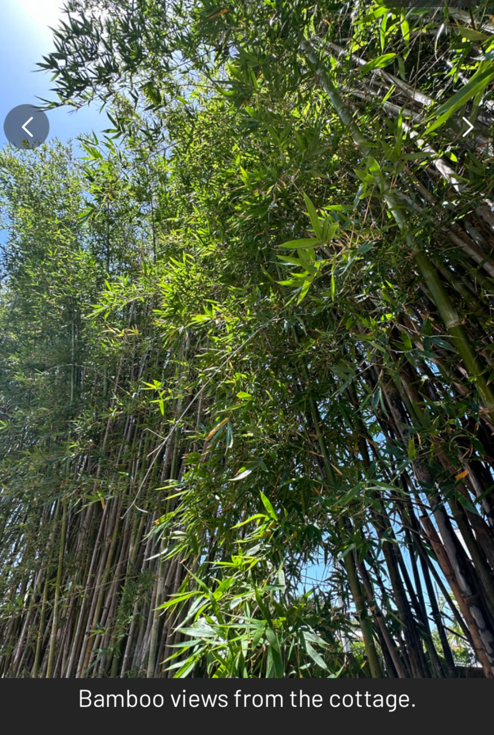 Un chalet récemment rénové de 1 chambre et 1 salle de bain avec une cuisine complète. Salle de bains décadente avec douche à effet pluie. Laveuse et sécheuse privées. Espace extérieur avec barbecue orné de bambous et de palmiers topiques.