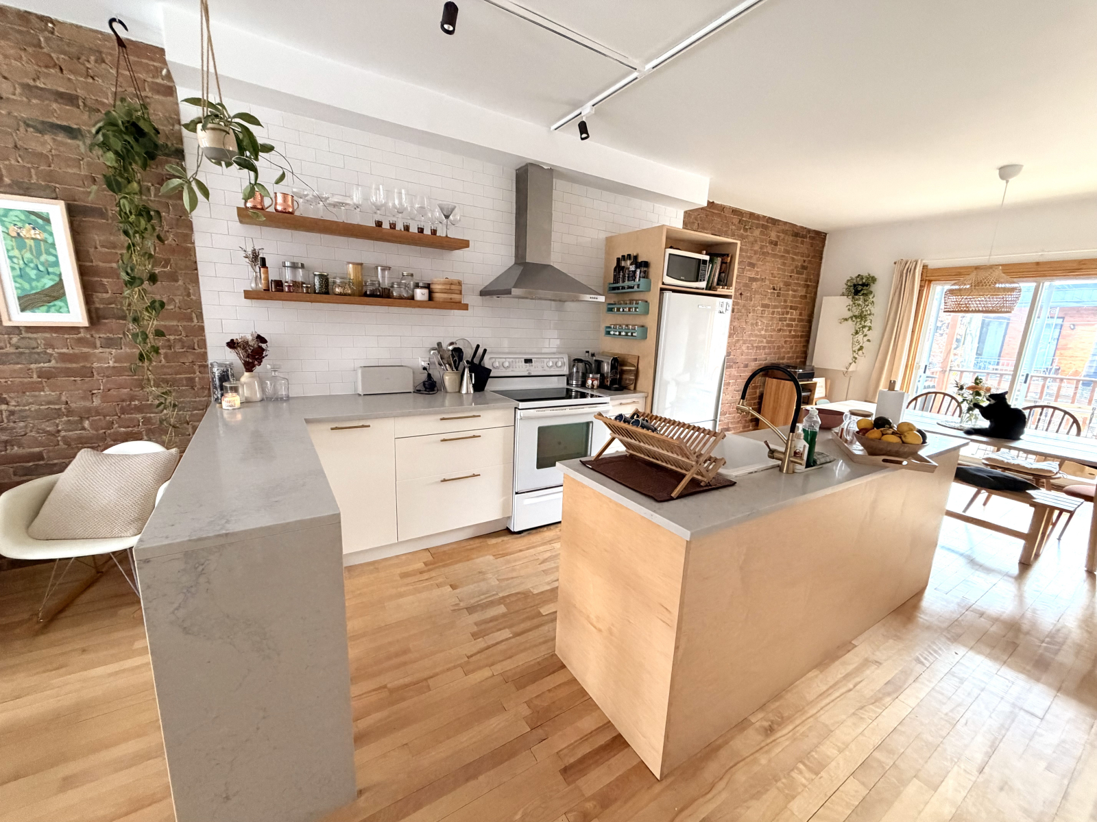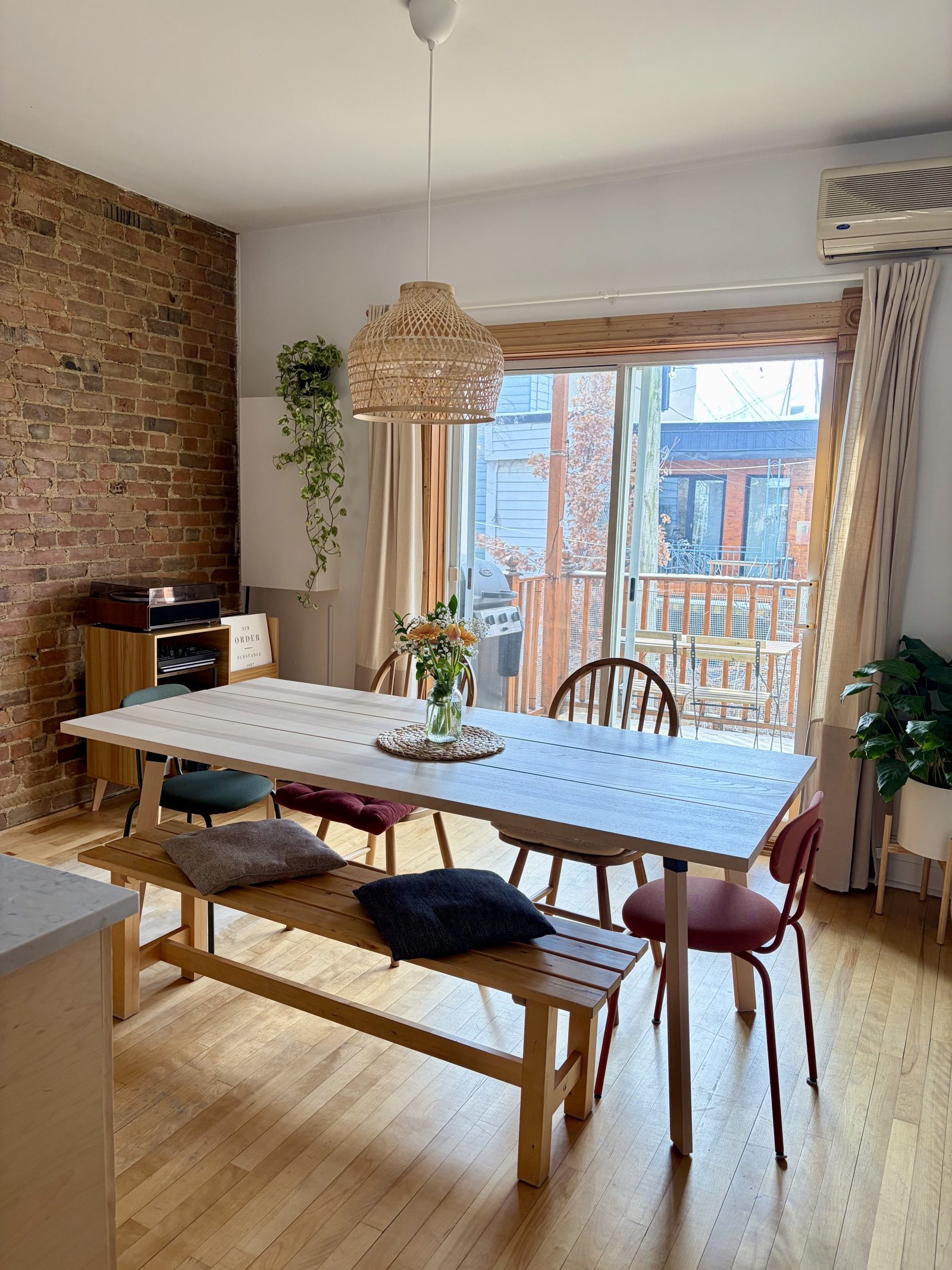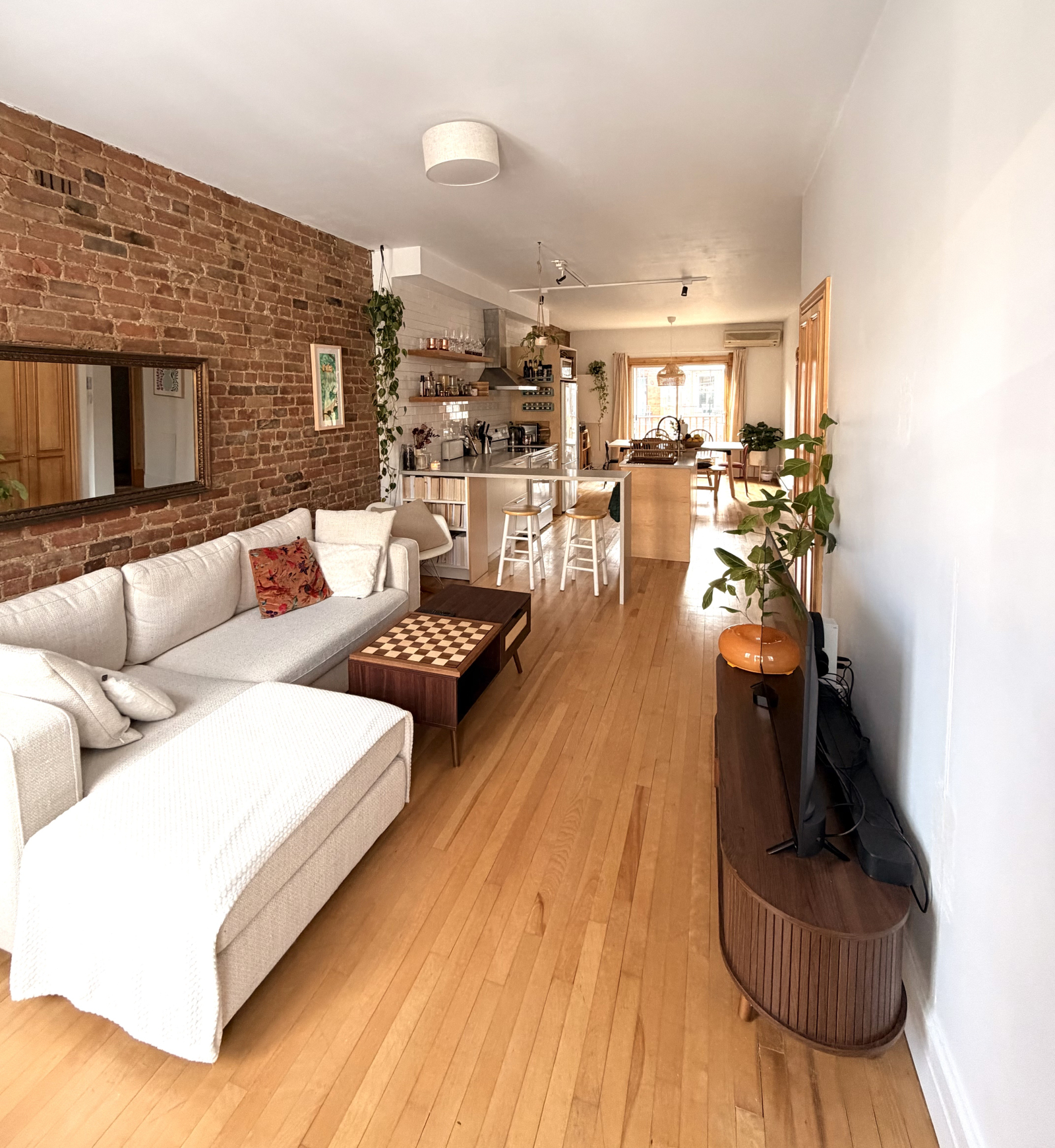 Inside, you’ll find a bright open living space with beautiful original exposed brick walls (very typical of Montreal!). We love how calm and inviting the space feels. It’s a two-bedroom apartment, but we turned the second room into an office/guest room, the daybed converts into a bed for 2 people.
