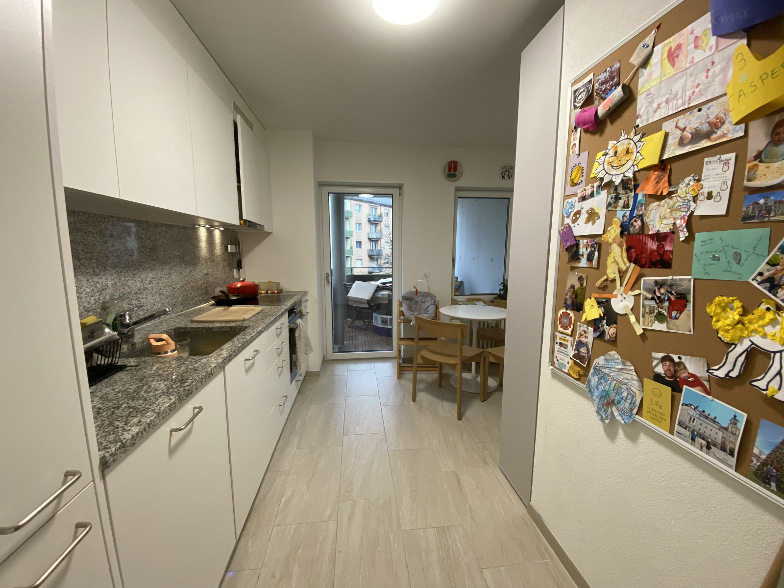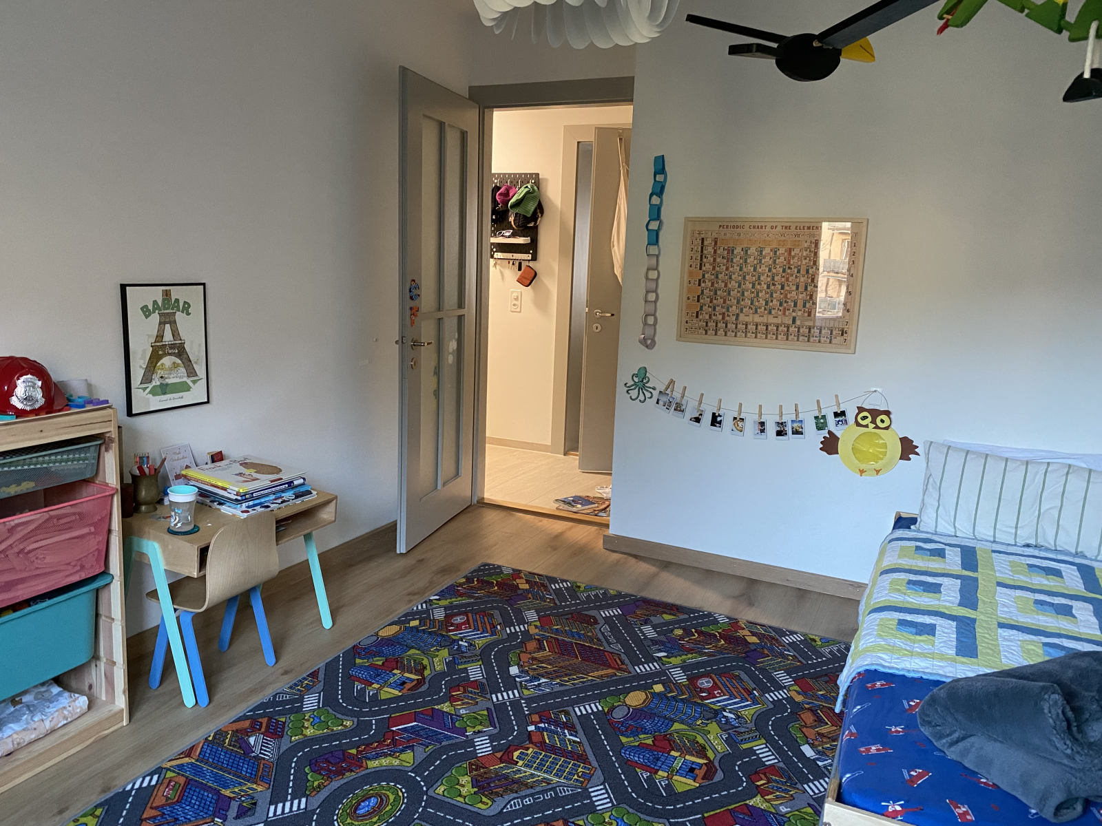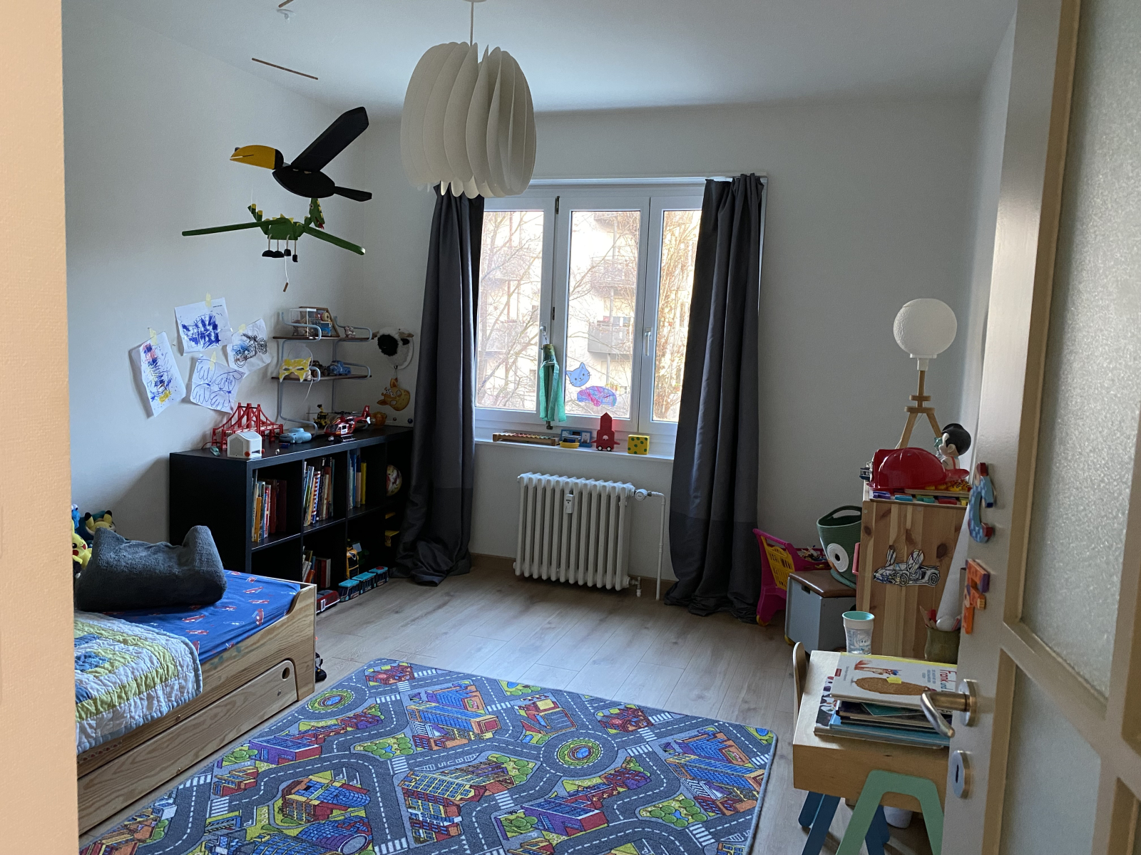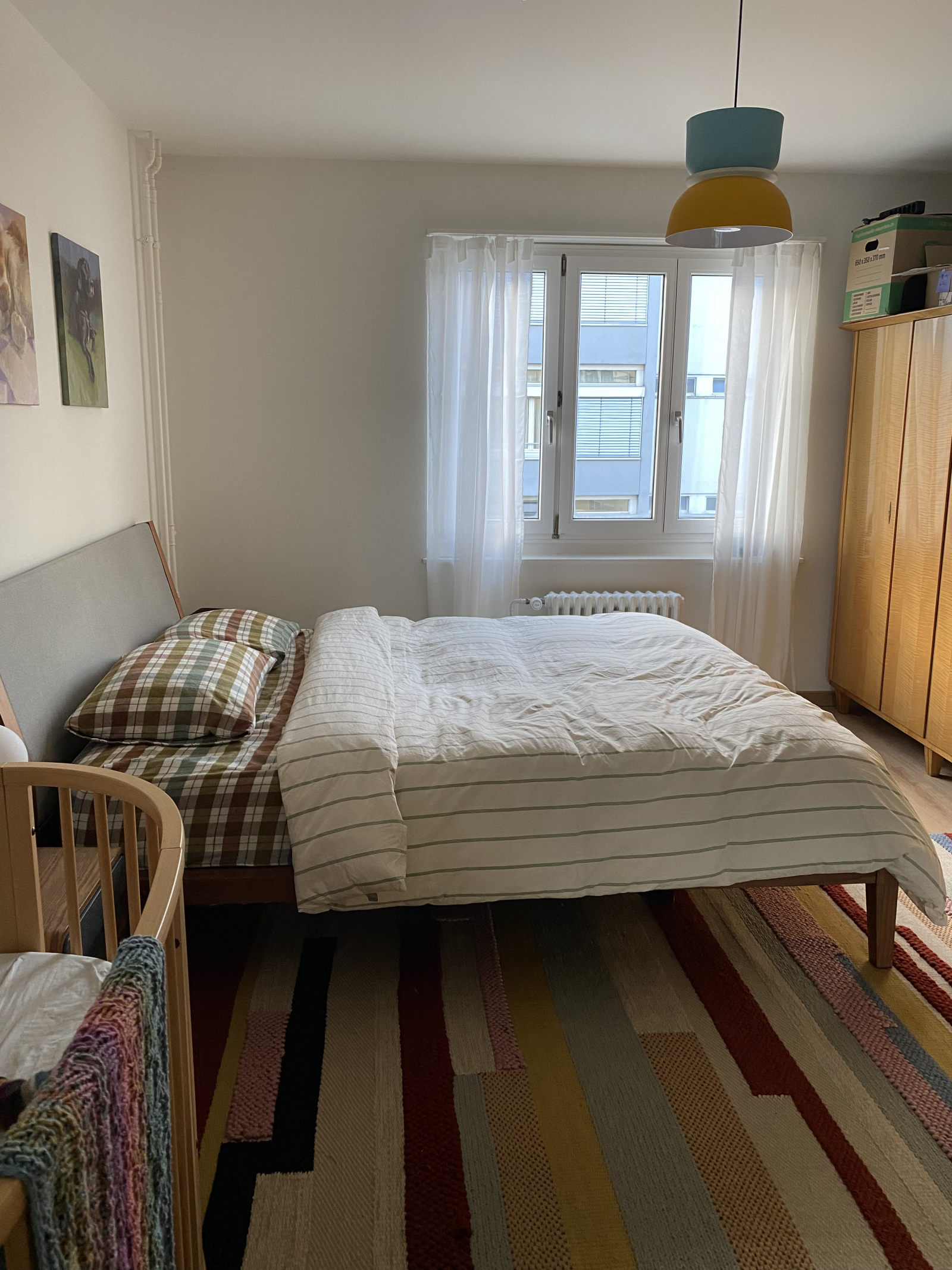 Nous avons un salon, une chambre pour adultes et une pour enfants. Nous avons aussi un berceau et une table à langer prêts à être utilisés. Nous avons deux balcons, d’où l’on peut voir un petit bout d’Uetliberg 😌