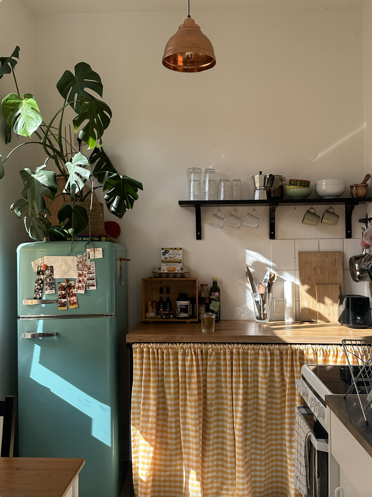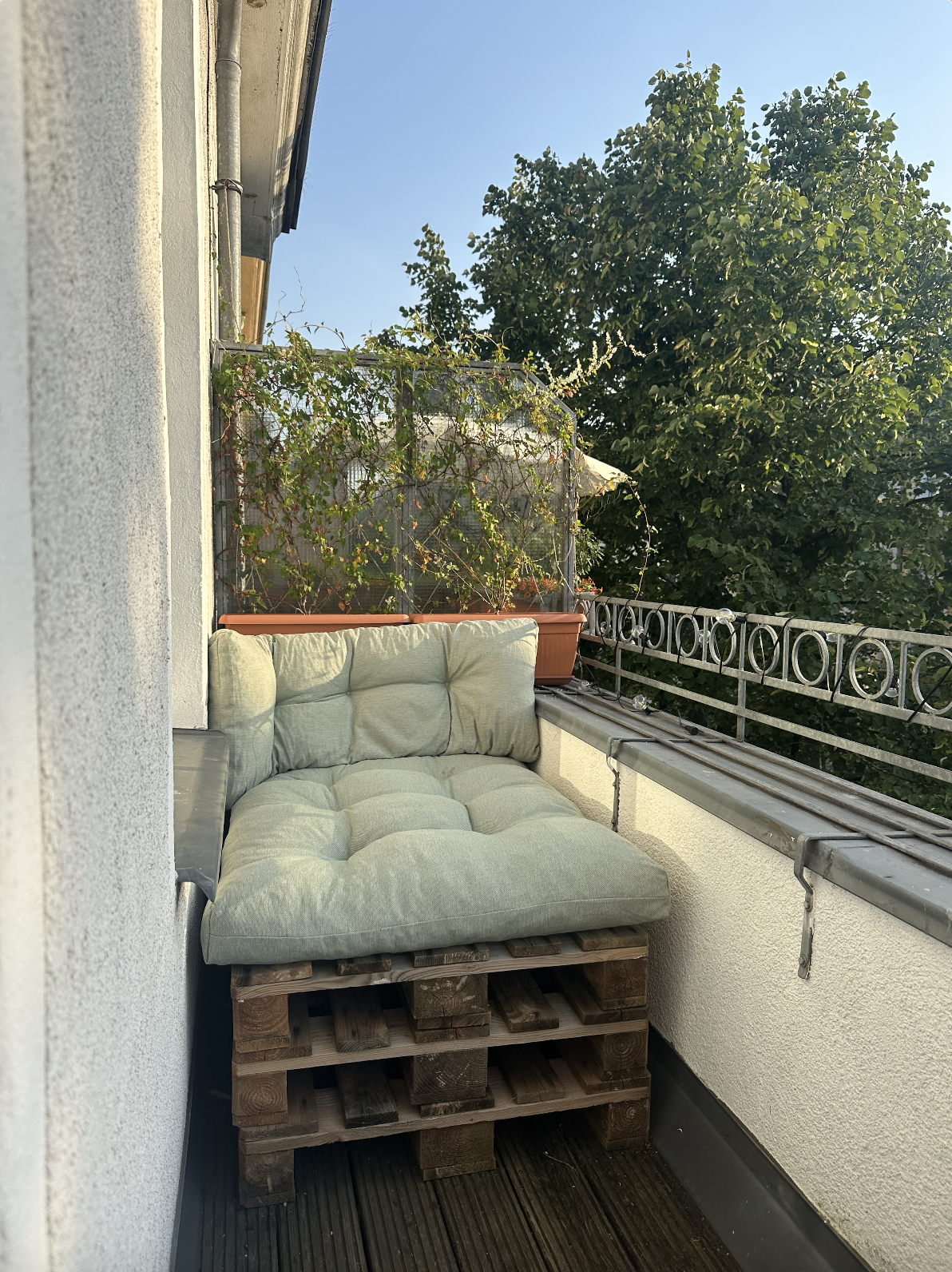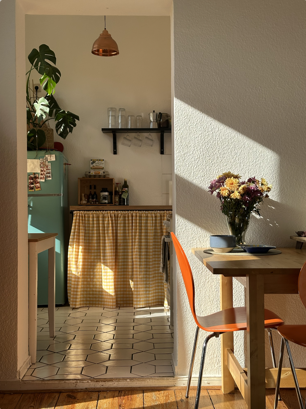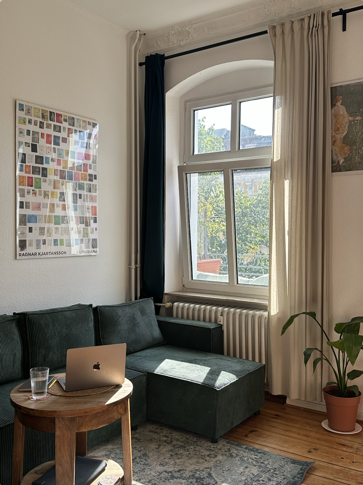 Ma maison est petite mais pleine de charme – un studio lumineux dans un bâtiment historique de Berlin Altbau, avec de hauts plafonds, des moulures et de grandes fenêtres orientées à l’ouest qui illuminent l’espace toute la journée. Le balcon est mon endroit préféré pour prendre un café du matin ou prendre des boissons au coucher du soleil.