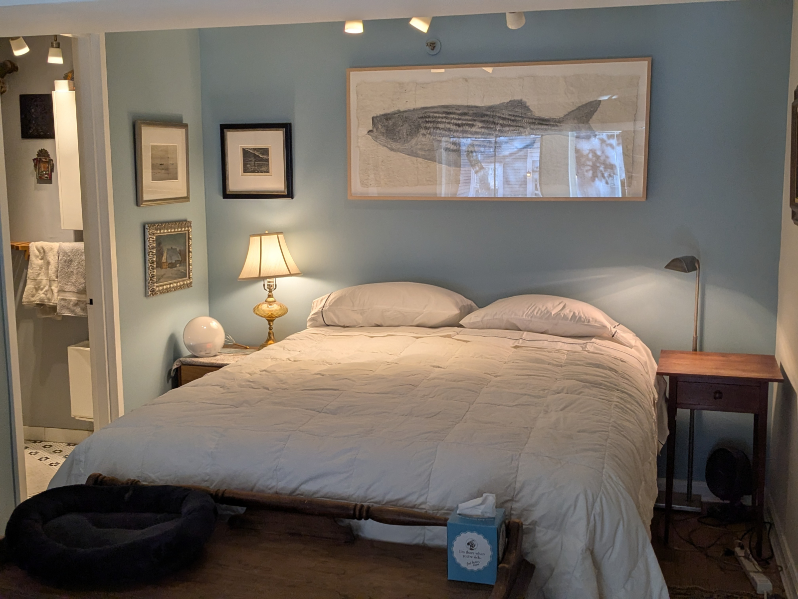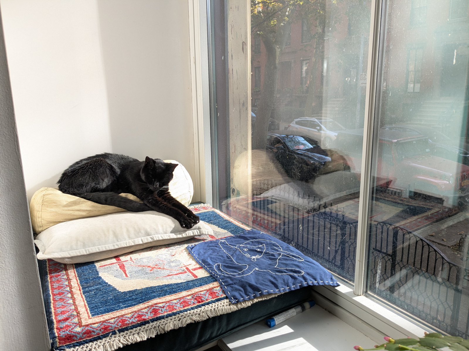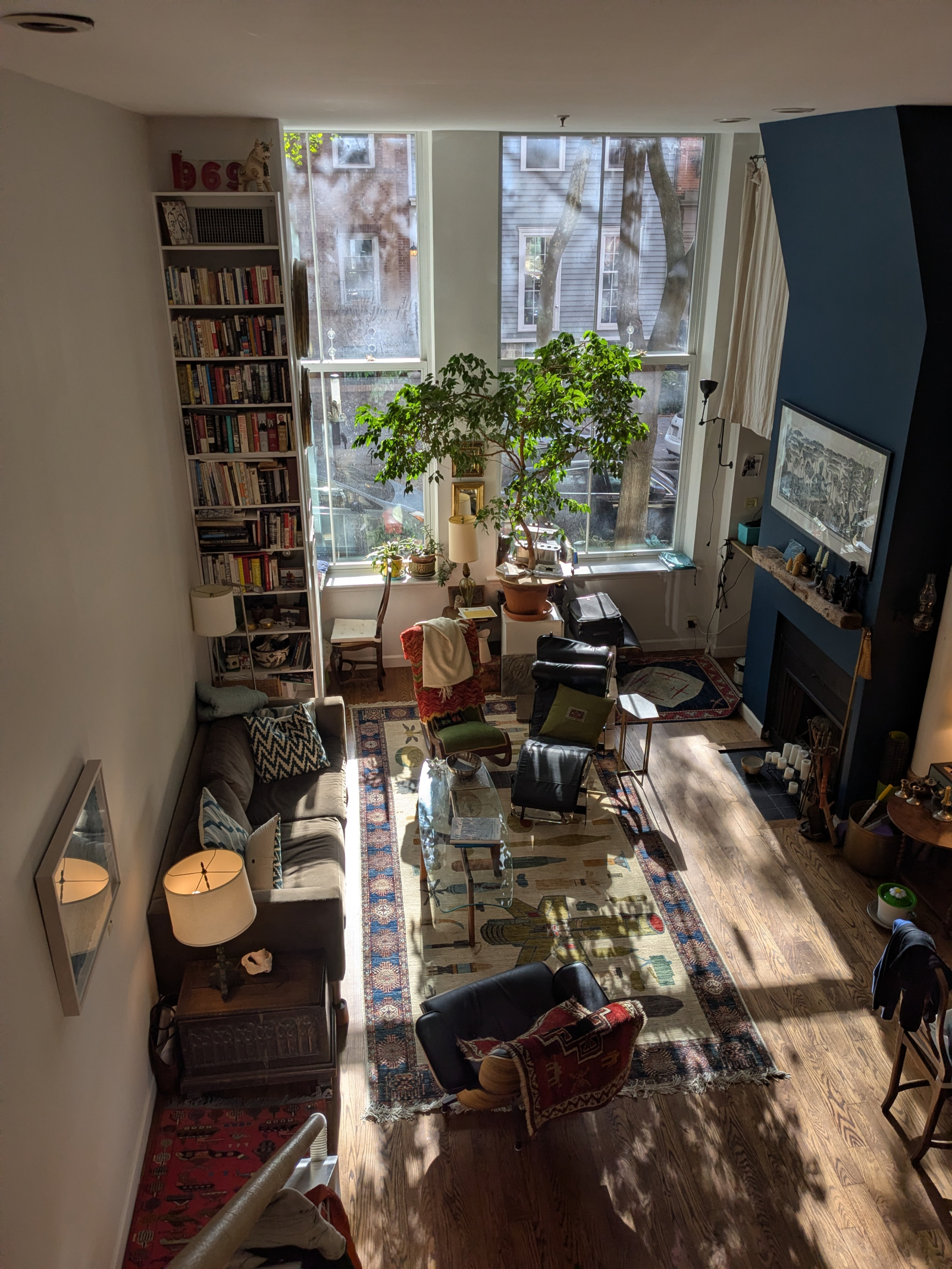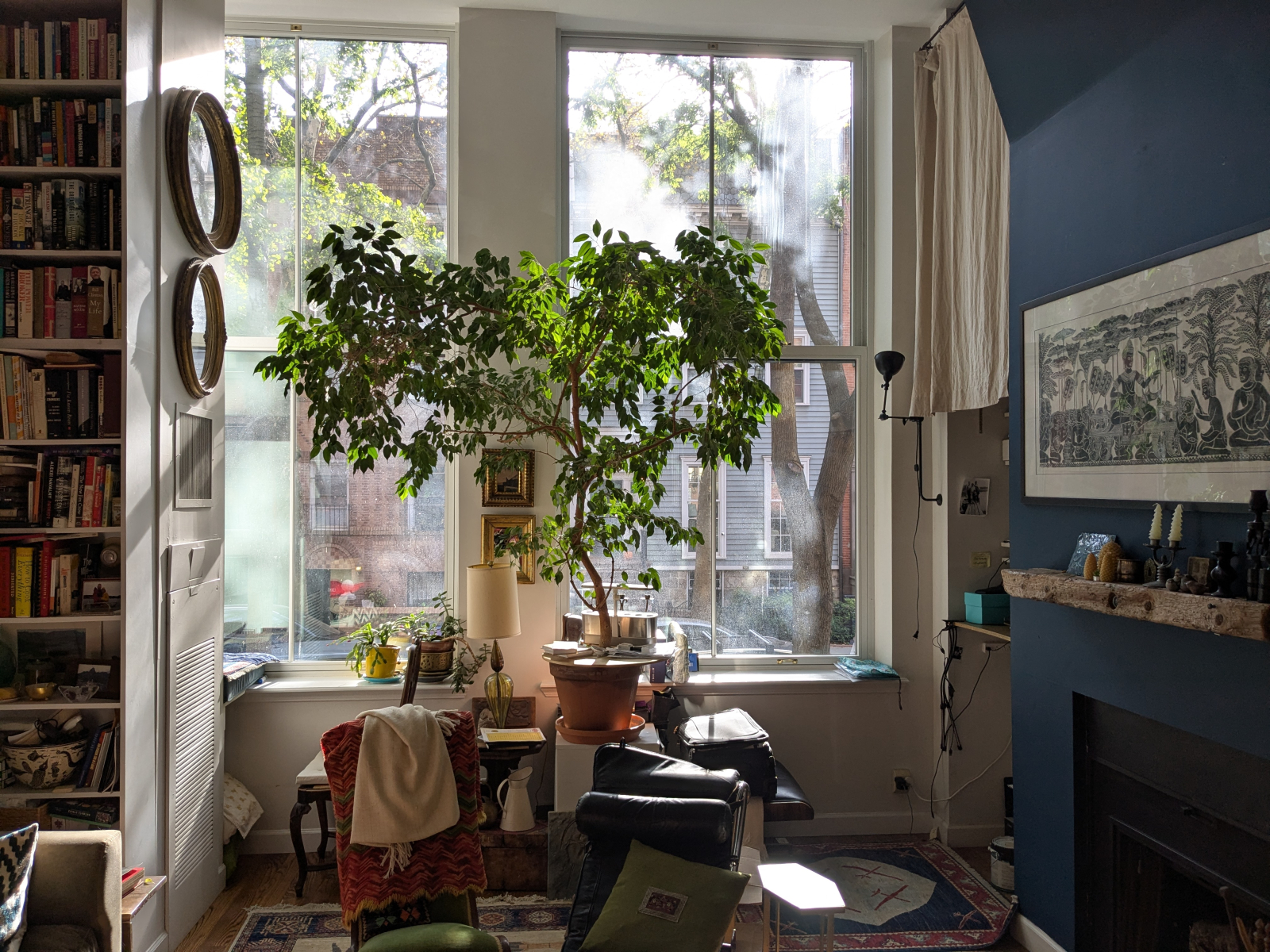 Une chambre à coucher bien éclairée avec de grandes fenêtres orientées au sud ouvrant sur une rue historique bordée d’arbres