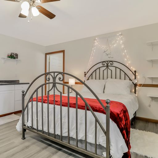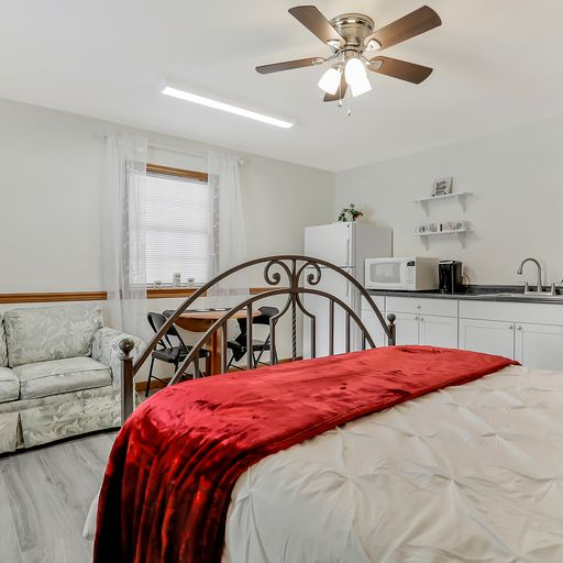 Ce studio privé est conçu pour le confort et la commodité. À l’intérieur, vous trouverez un lit queen avec du linge propre, un coin salon douillet et une télévision pour les soirées relaxantes, ainsi qu’une salle de bain complète équipée de serviettes et d’essentiels. La kitchenette comprend un réfrigérateur grandeur nature, un micro-ondes et des articles de cuisine de base, ce qui facilite la préparation des repas ou des collations pendant votre séjour.