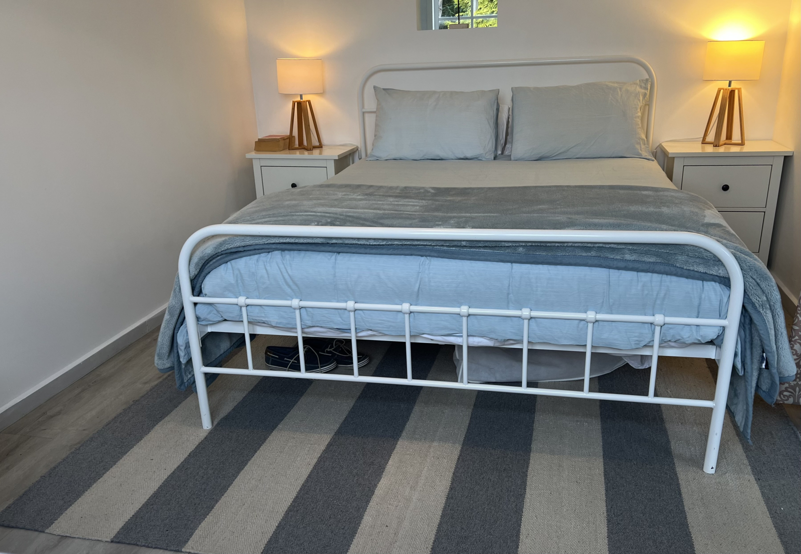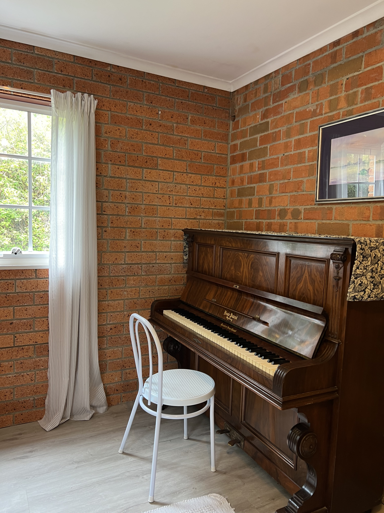 Deux autres chambres spacieuses se trouvent au rez-de-chaussée - l’une avec un lit simple king (et un piano !), l’autre avec des lits simples jumeaux. La salle de bain et les toilettes séparées sont aussi en bas. Les toilettes sont neuves mais le reste de la salle de bain est rustique, avec une très vieille salle de bain à griffes avec douche supérieure. L’eau chaude est garantie et les toilettes sont un système de chasse d’eau standard – luxueux comparé à beaucoup des cabanes d’origine des environs ! Une machine à laver et une buvette à linge sont également installées dans la salle de bain.