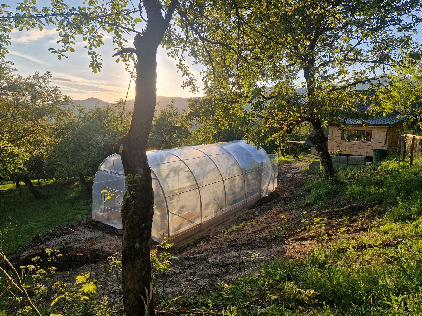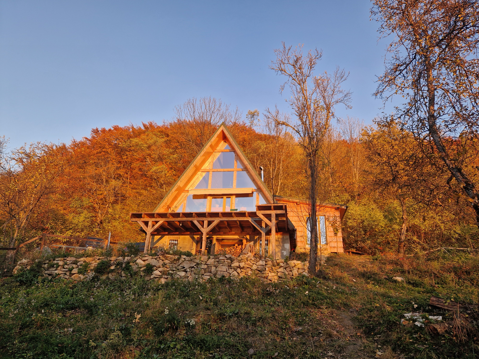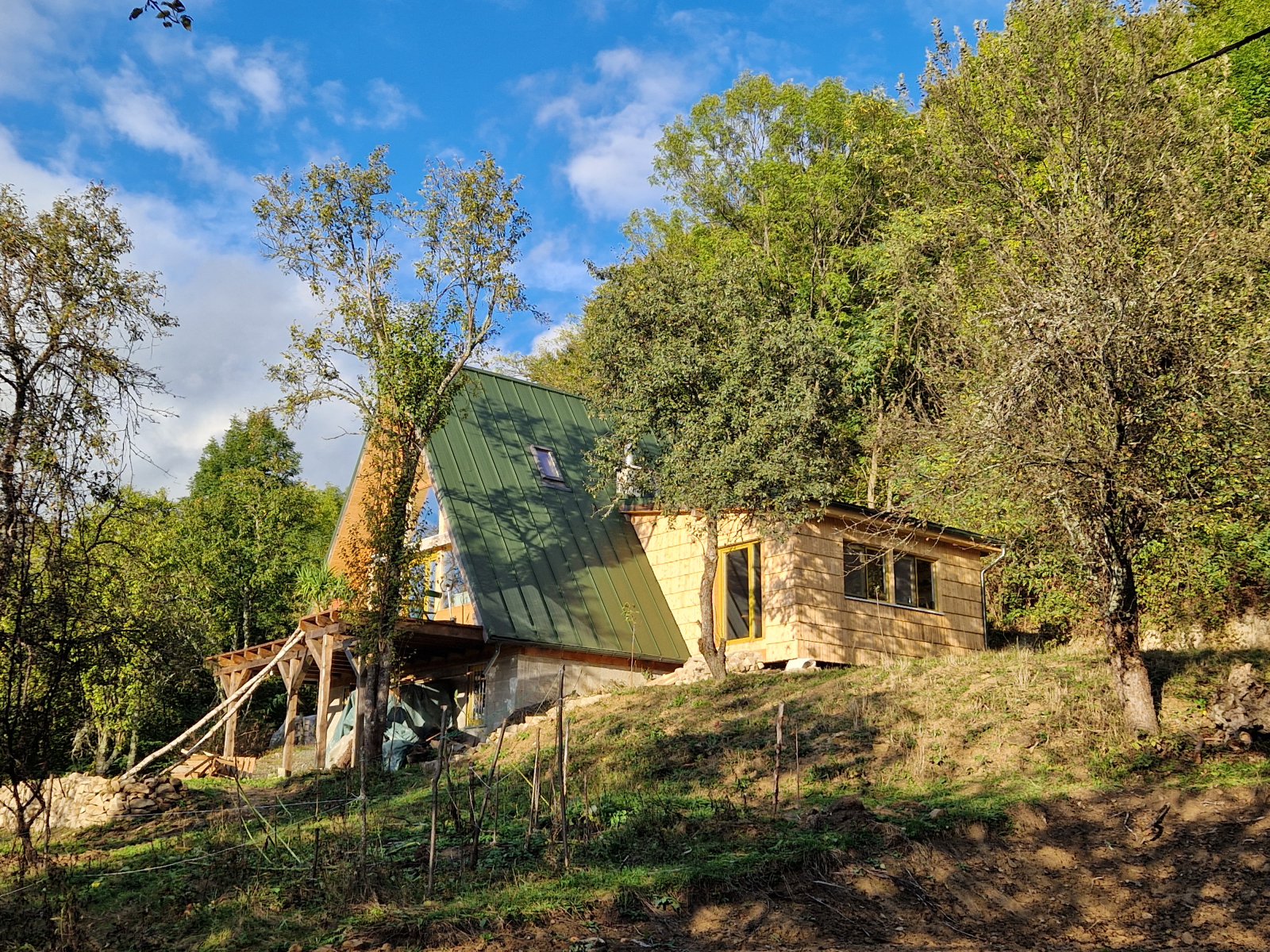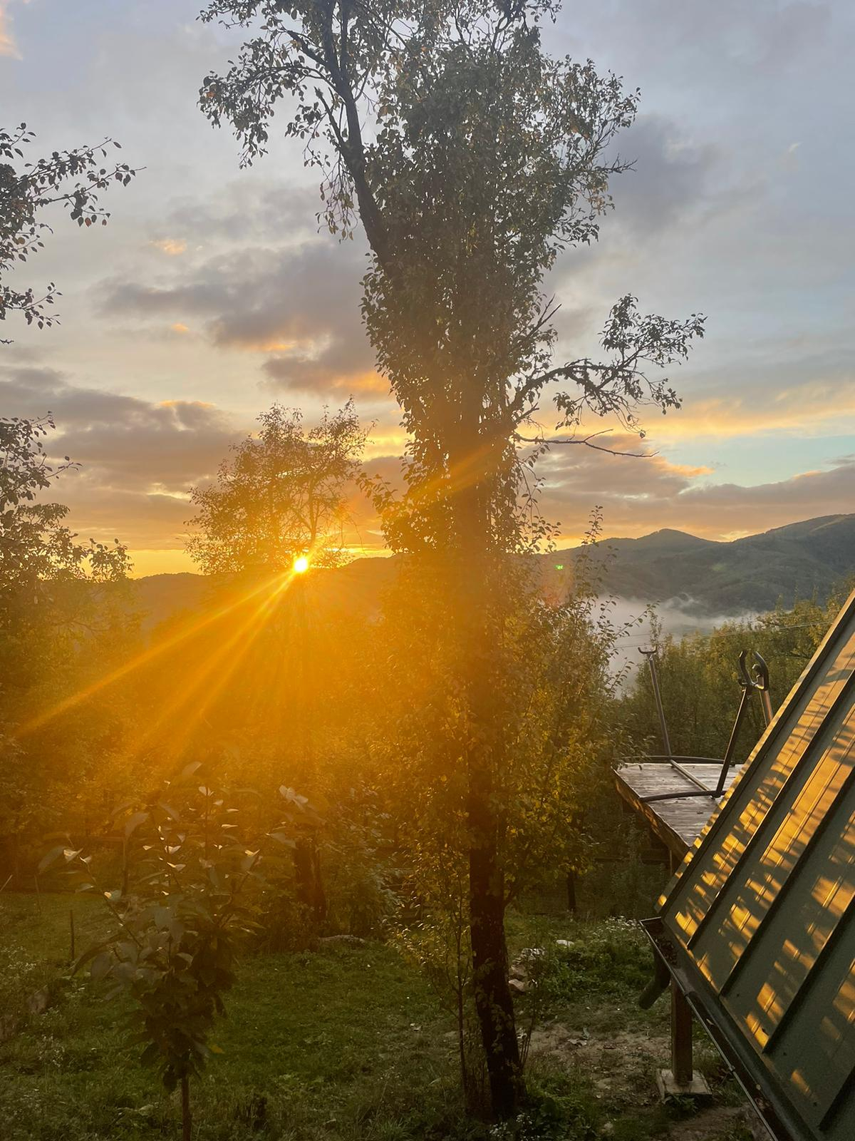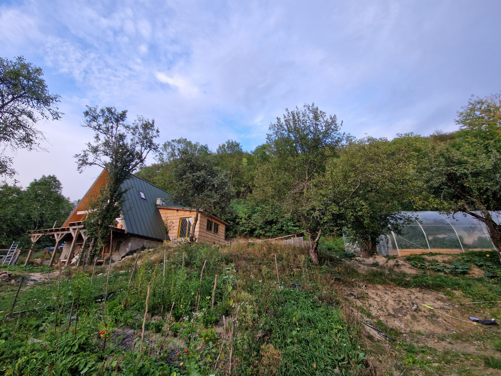 Nous avons construit une magnifique maison en forme de A en bois et en verre à 800 m d’altitude dans les montagnes des Carpates (centre-ouest de la Roumanie) et disposons d’une grande serre pleine de légumes, ainsi que d’arbres fruitiers et à noix tout autour. C’est un endroit très paisible, on n’entend que les oiseaux et la rivière dans la vallée. Une fois dehors, on est en forêt et on a plein d’options de randonnée partout. Chaque jour, vous pouvez profiter du coucher de soleil depuis le balcon ou la maison alors que le soleil disparaît derrière la chaîne de montagnes. Nous avons aussi une voiture tout-terrain pour des aventures sur routes forestières. Il y a beaucoup à faire dans les environs !