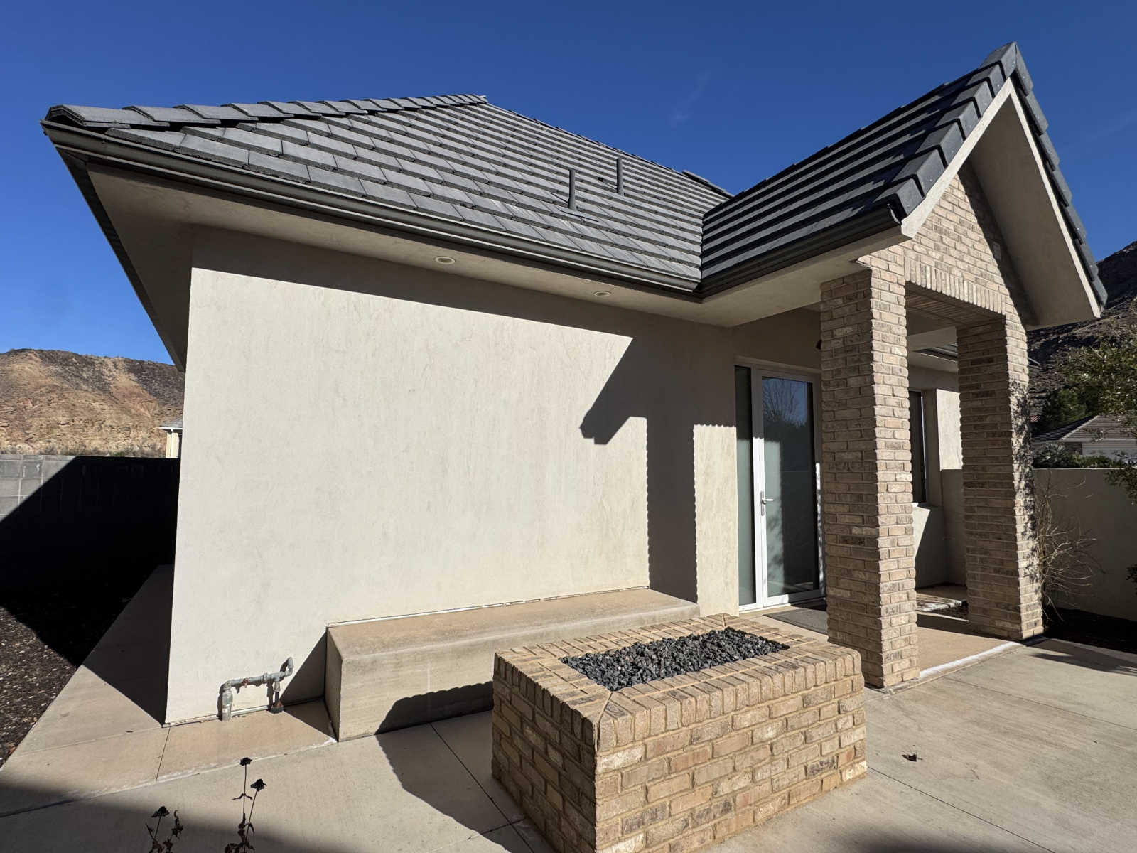 Entrée Casita avec cheminée extérieure et banc