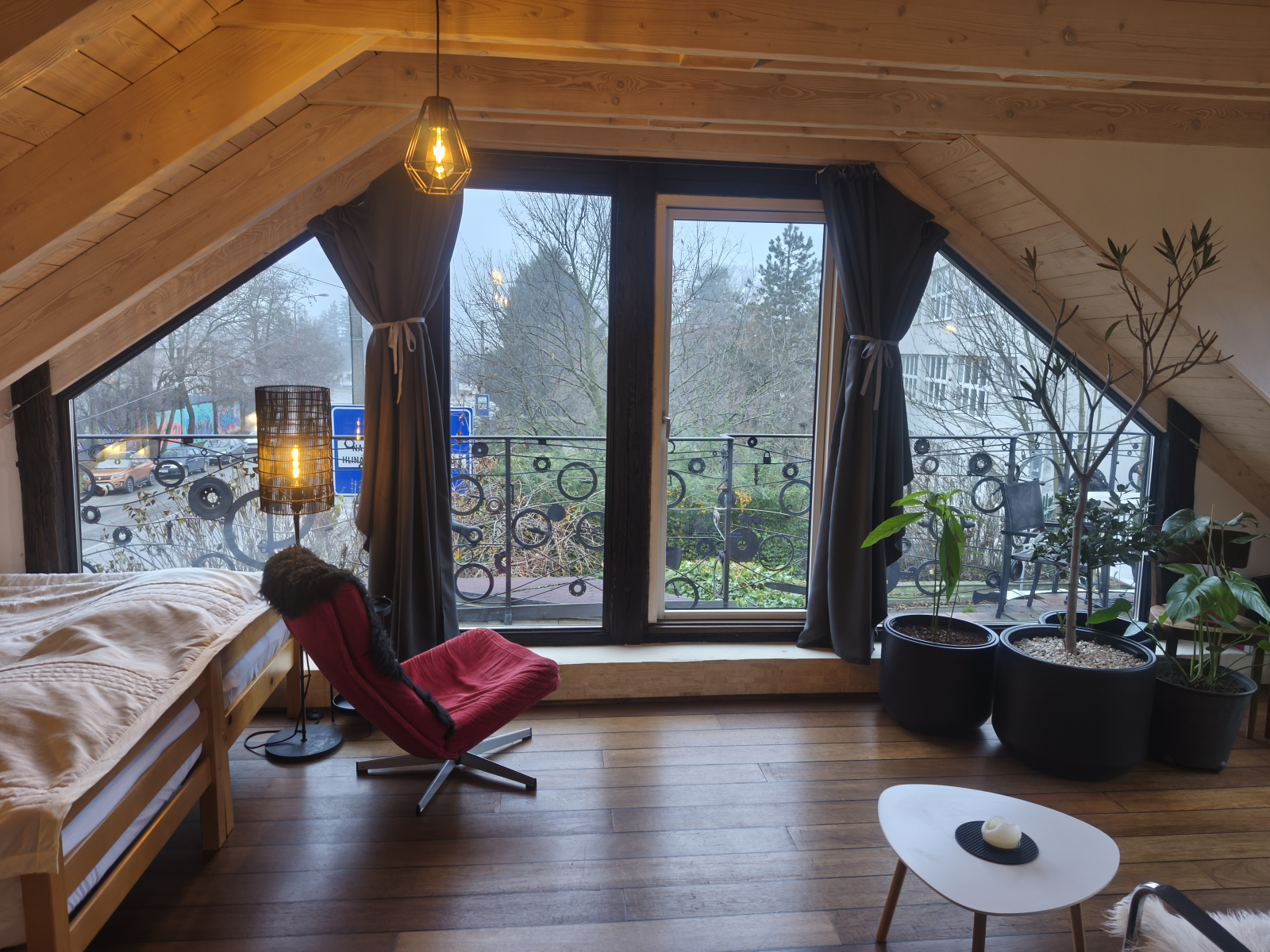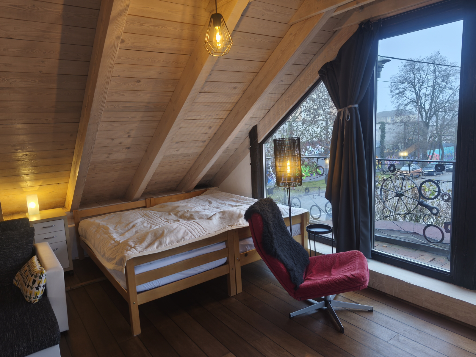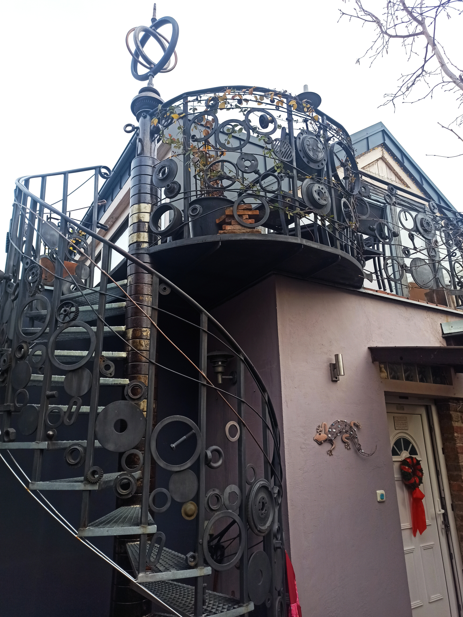 Les portes d’Entrange depuis la rue sont partagées avec nous, vivant au rez-de-chaussée. Ensuite, il faut grimper un escalier en colimaçon en fer pour atteindre le grenier. C’est séparé de la maison.