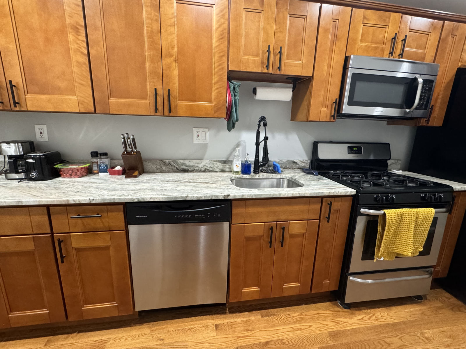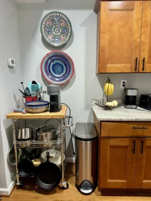 Mon appartement est bien équipé d’un WiFi rapide, d’une smart TV avec Netflix, HBO, Peacock, Hulu et Prime, ainsi que d’une Alexa Echo Dot. La cuisine dispose d’une cafetière standard ainsi que d’un Nespresso Vertuo, d’un grille-pain, d’un four et réchaud à gaz, d’un lave-vaisselle et d’un micro-ondes. J’ai tous types d’ustensiles de cuisine. La salle de bain est équipée d’une baignoire et d’une douche. Il y a aussi une machine à laver et un sèche-linge empilés. Les pièces du condo sont le salon, la chambre, la cuisine et le petit vestiaire où se trouvent la nourriture, l’eau et la litière de mon chat. La chambre a un lit queen.