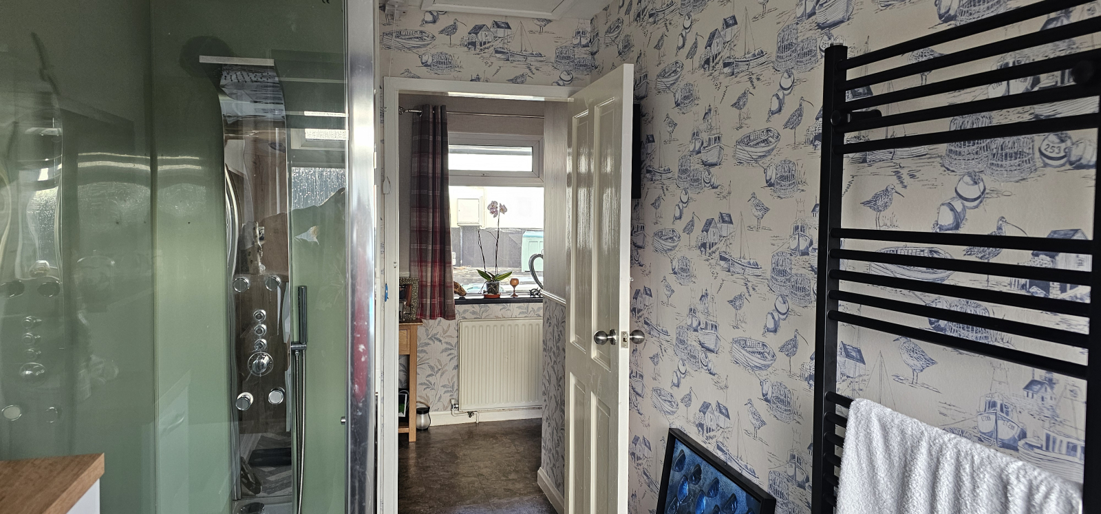 Due letti matrimoniali, una singola. Un bagno con doccia.