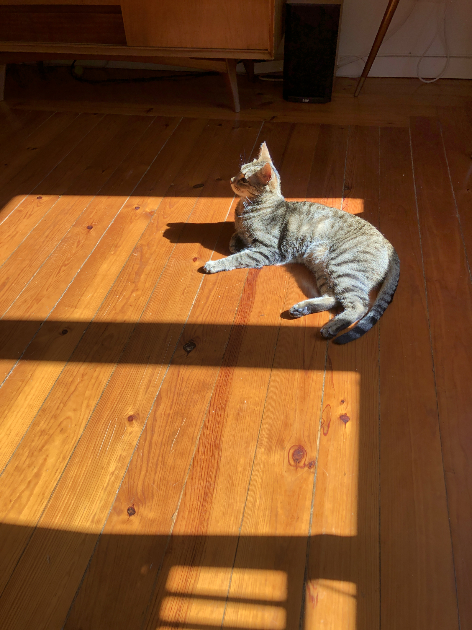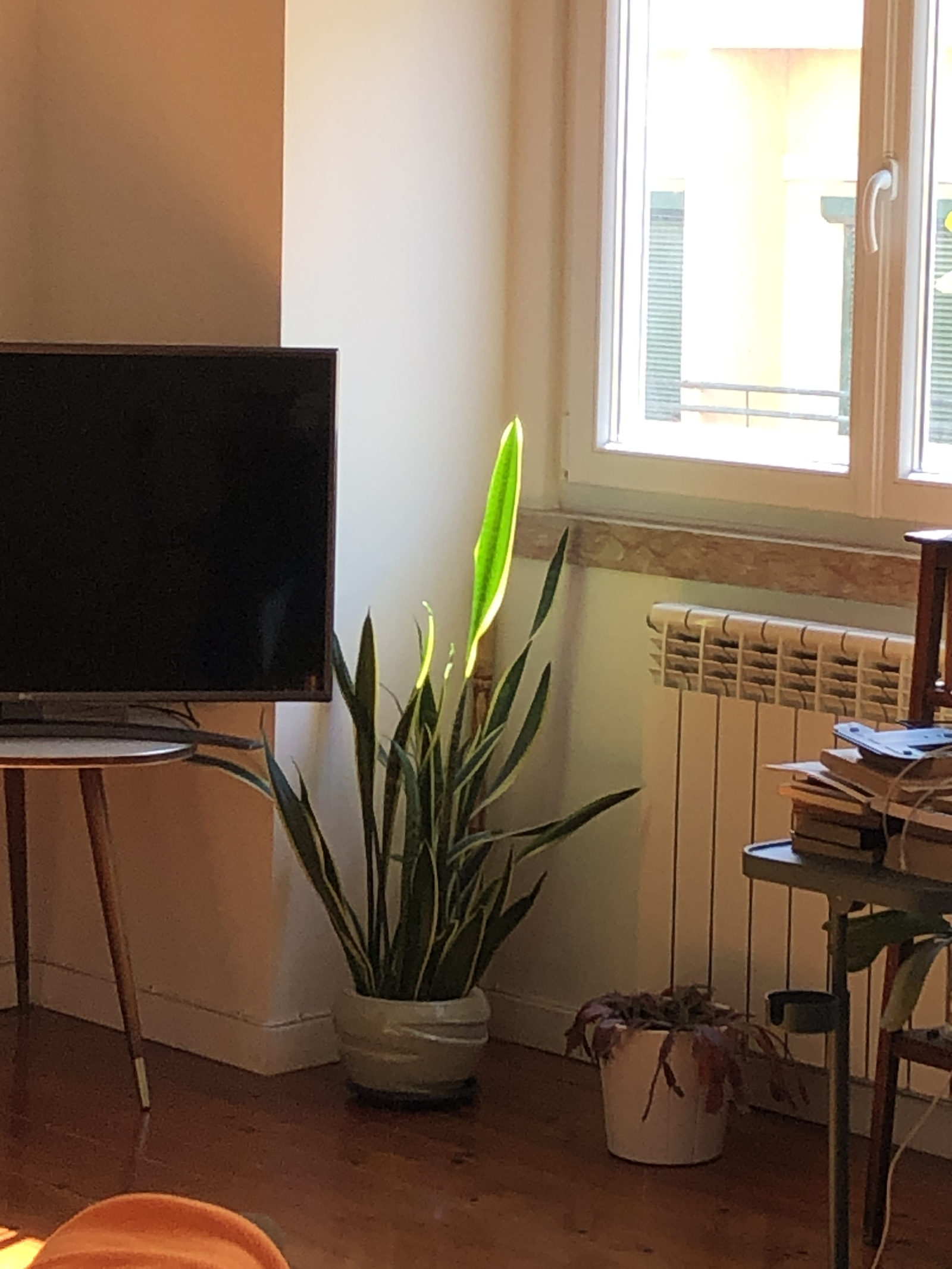 È spazioso e soleggiato, molto luminoso, con vista su un giardino interno con alberi e uccelli. La casa è grande, 2 camere da letto, enorme cucina e soggiorno, un bagno con finestra. E un caldo pavimento in legno. È tranquillo e fresco. Nel centro di Lisbona, ma suona come casa di campagna.