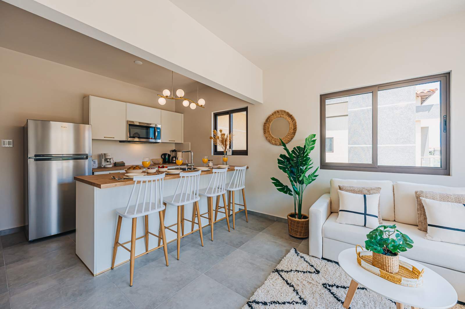 Il nostro appartamento è luminoso, confortevole e completamente attrezzato. Dispone di un ampio soggiorno con divano letto, una cucina a vista, una camera da letto con letto matrimoniale e un bagno pulito. All'esterno troverete un balcone dove potrete sedervi tranquillamente. La struttura si trova in una comunità sicura con accesso a piscine, una palestra e un campo da tennis.