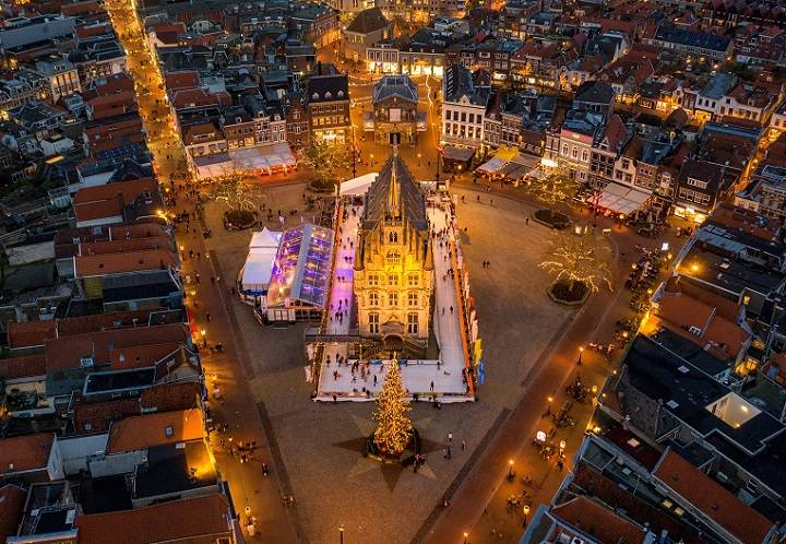 Vista di Gouda del municipio del 1459 durante la serata a lume di candela di dicembre
