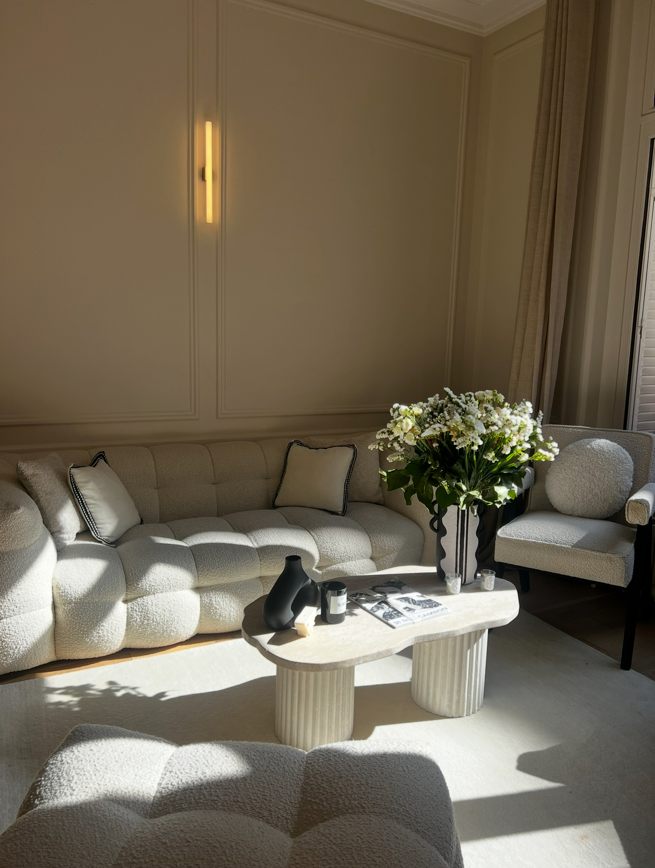 • un ampio soggiorno con luce naturale, bei mobili di design, sedute in spugna e un'atmosfera calda,