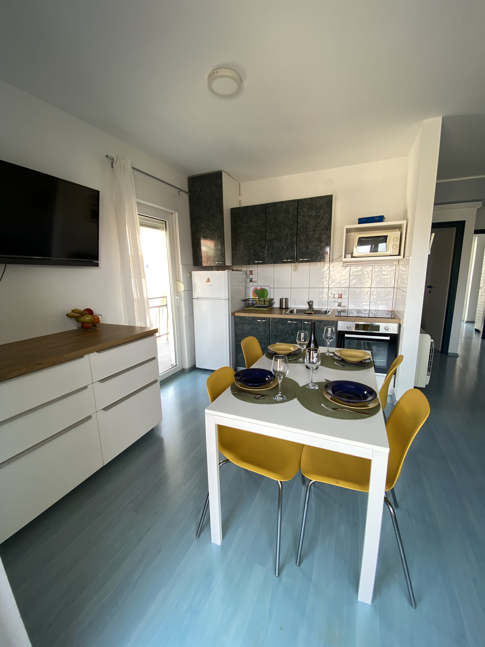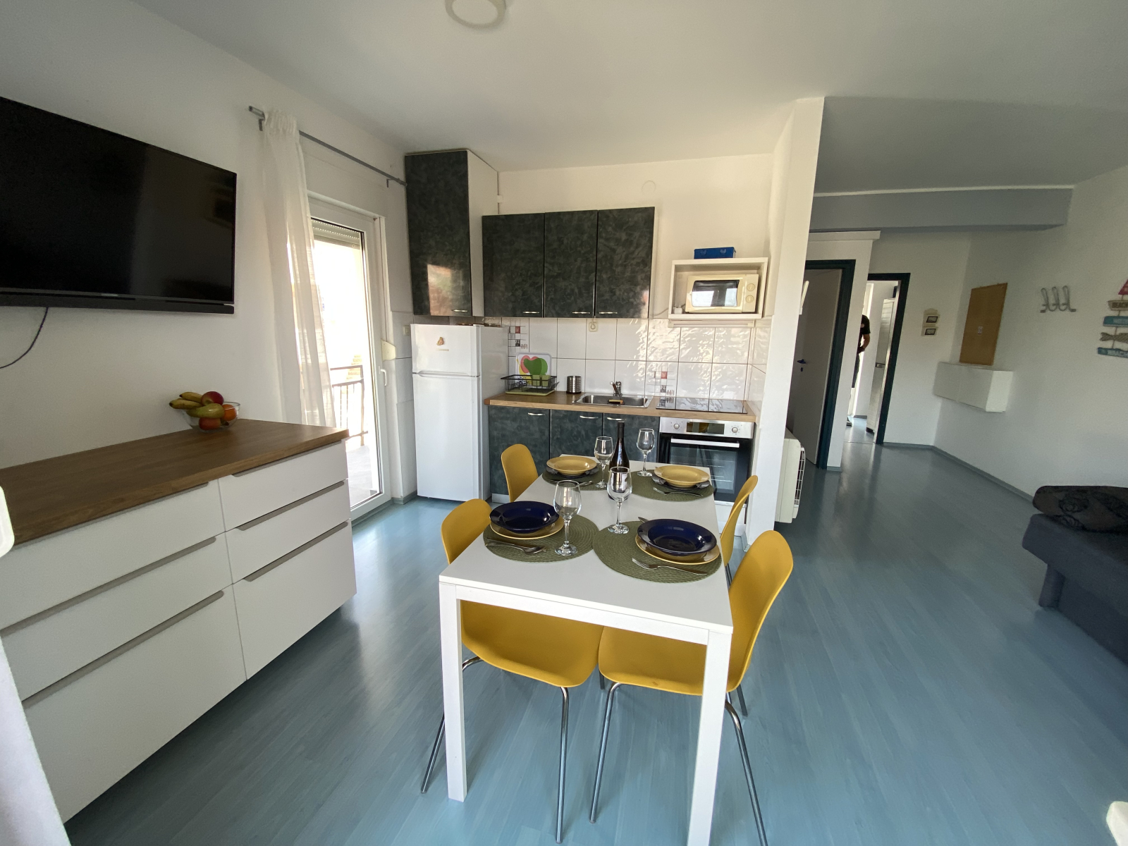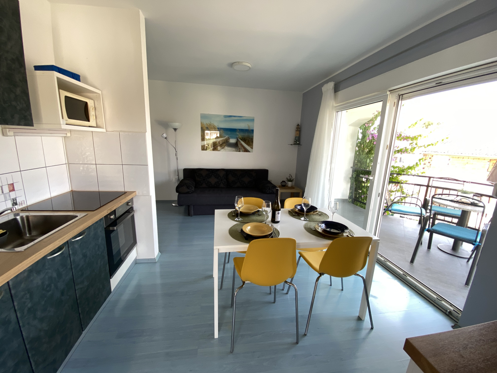 1 camera da letto, 1 bagno, soggiorno con cucina. Balcone con vista mare.